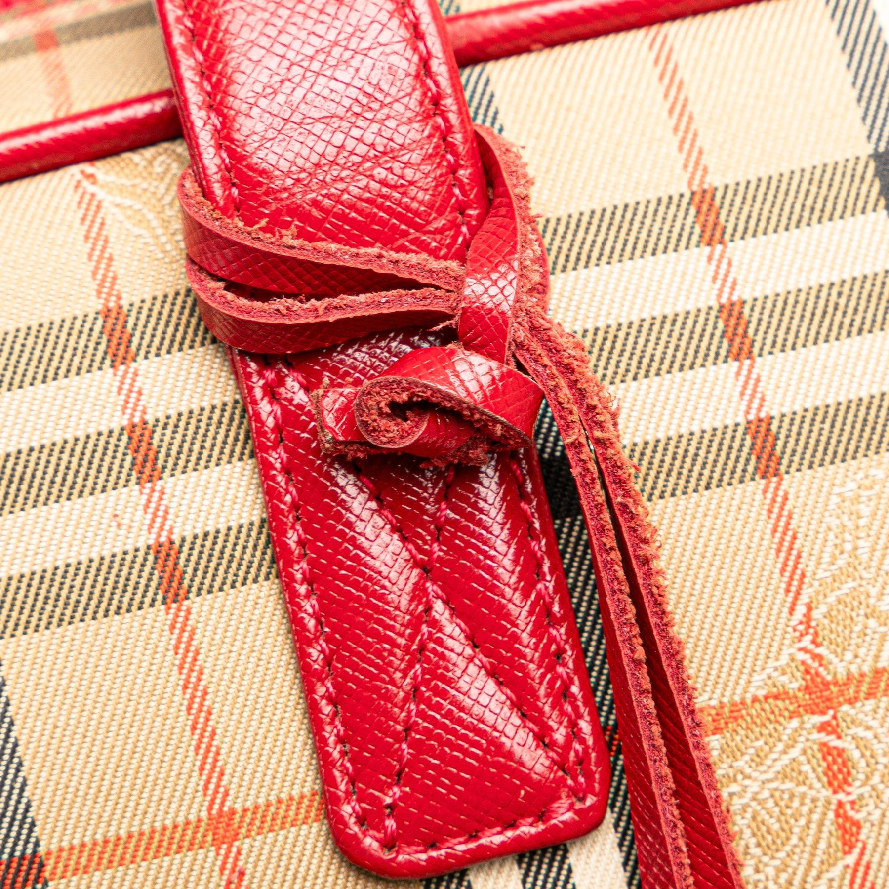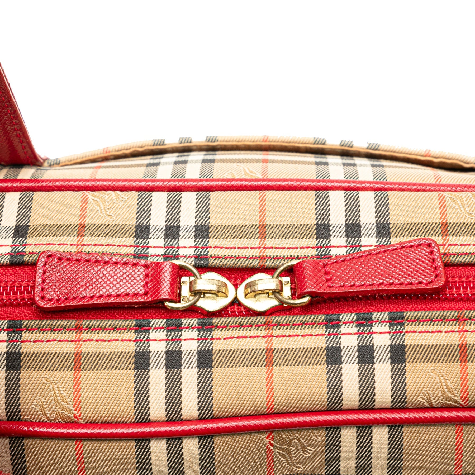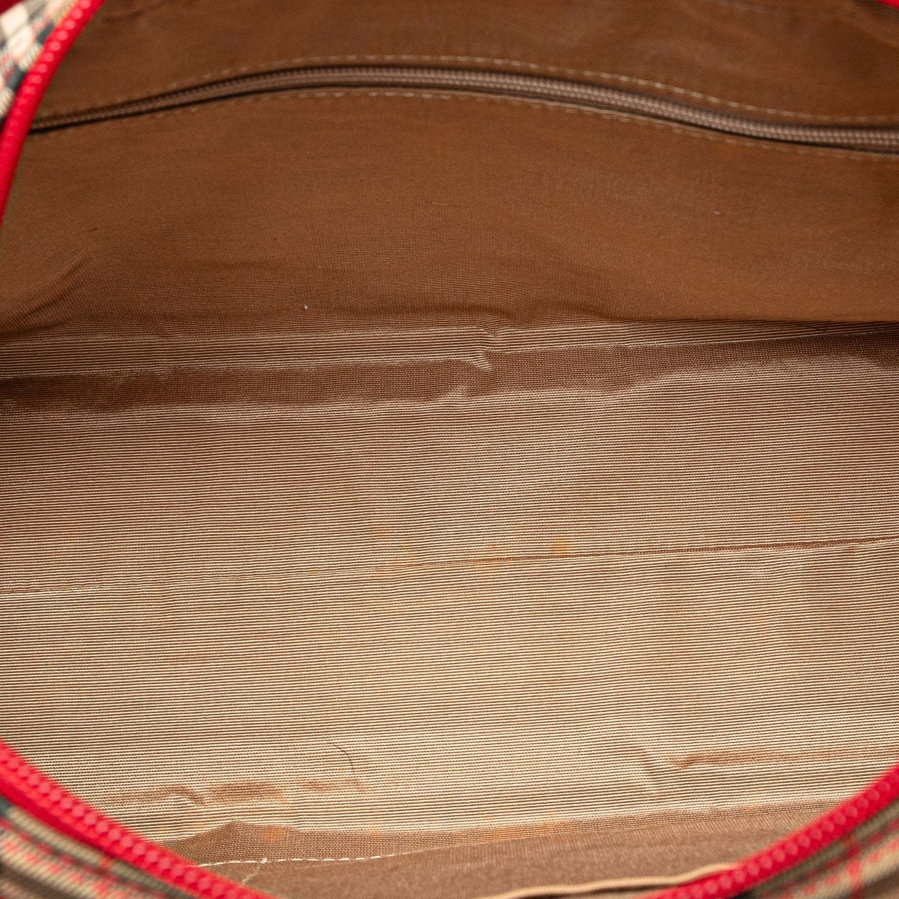 This shoulder bag features a canvas body with leather trim, flat leather handles, a top zip closure, and an interior zip pocket.