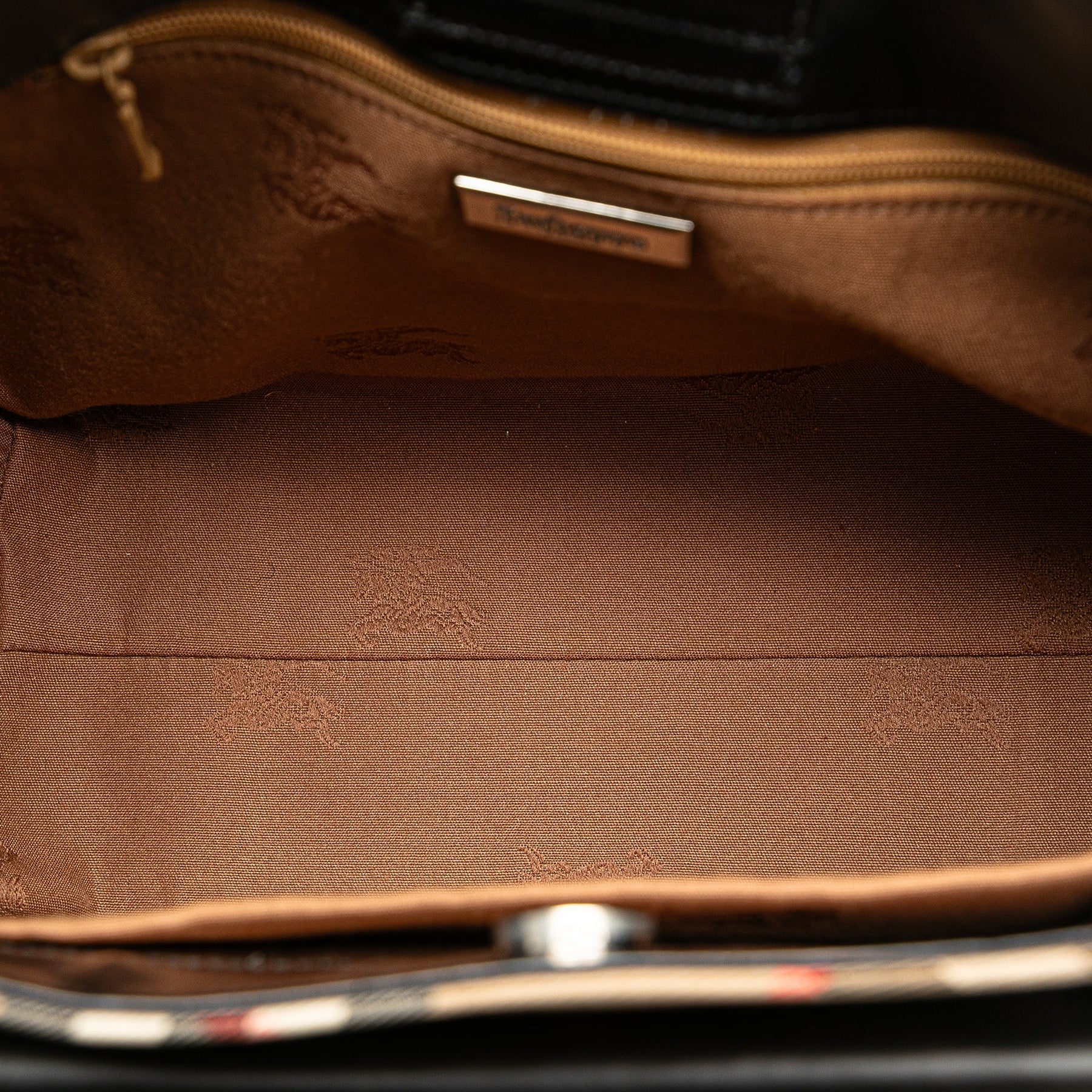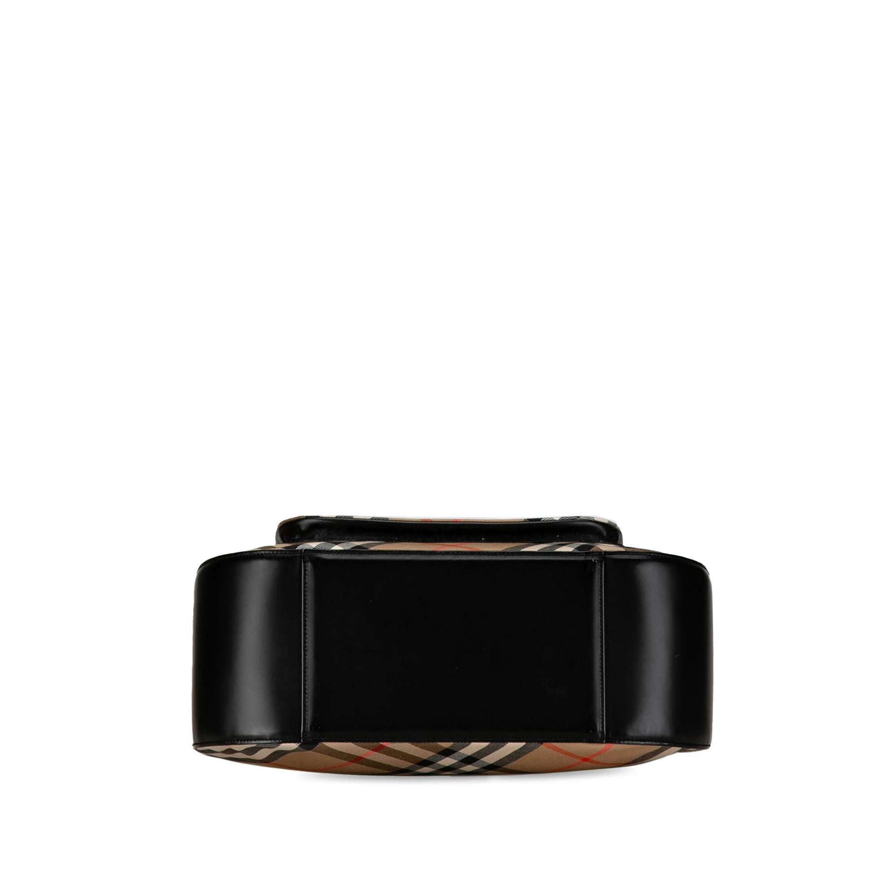 This shoulder bag features a canvas body with leather trim, a flat leather strap, a top strap with snap button closure, an exterior front pocket with a leather flap, and interior zip and slip pockets.