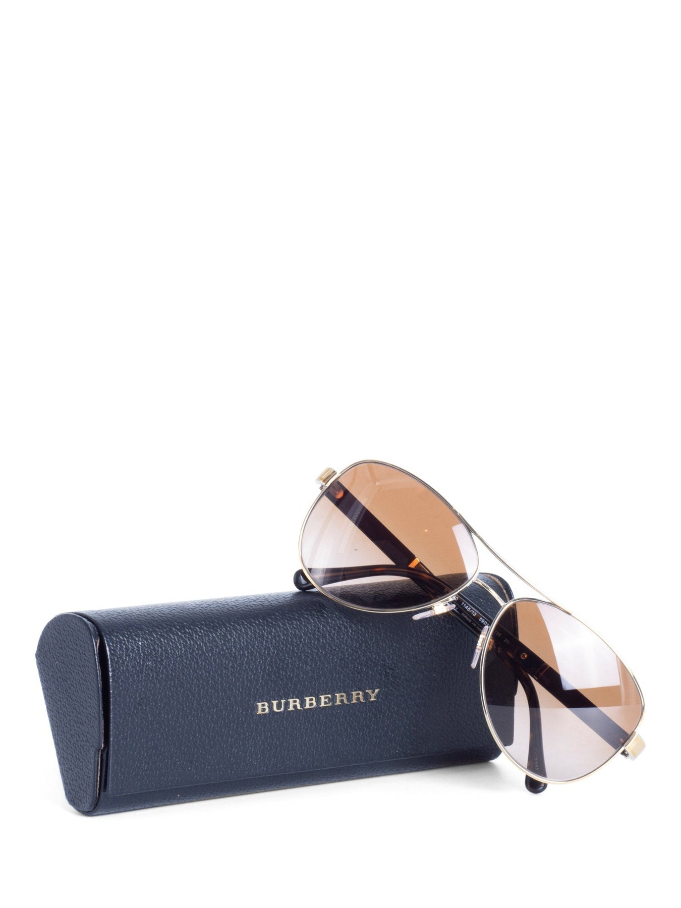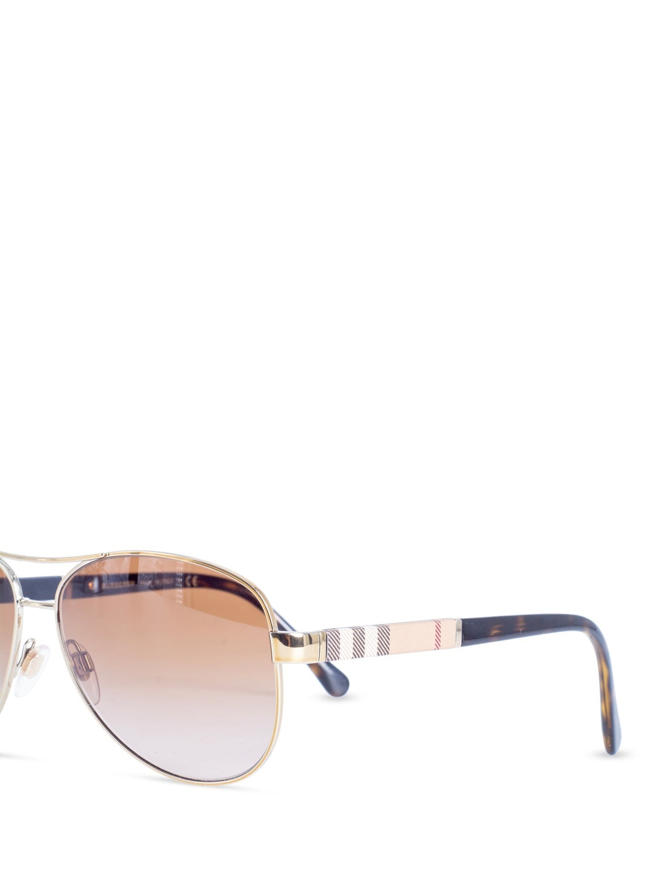 Burberry Sunglasses or . These trendy aviator sunglasses feature the recognizable Burberry signature honey check pattern on the temples and a brown and gold pattern on the arms. It has a silver frame with the nose guards also featuring check imprint and the lenses having a honey brown gradient color.