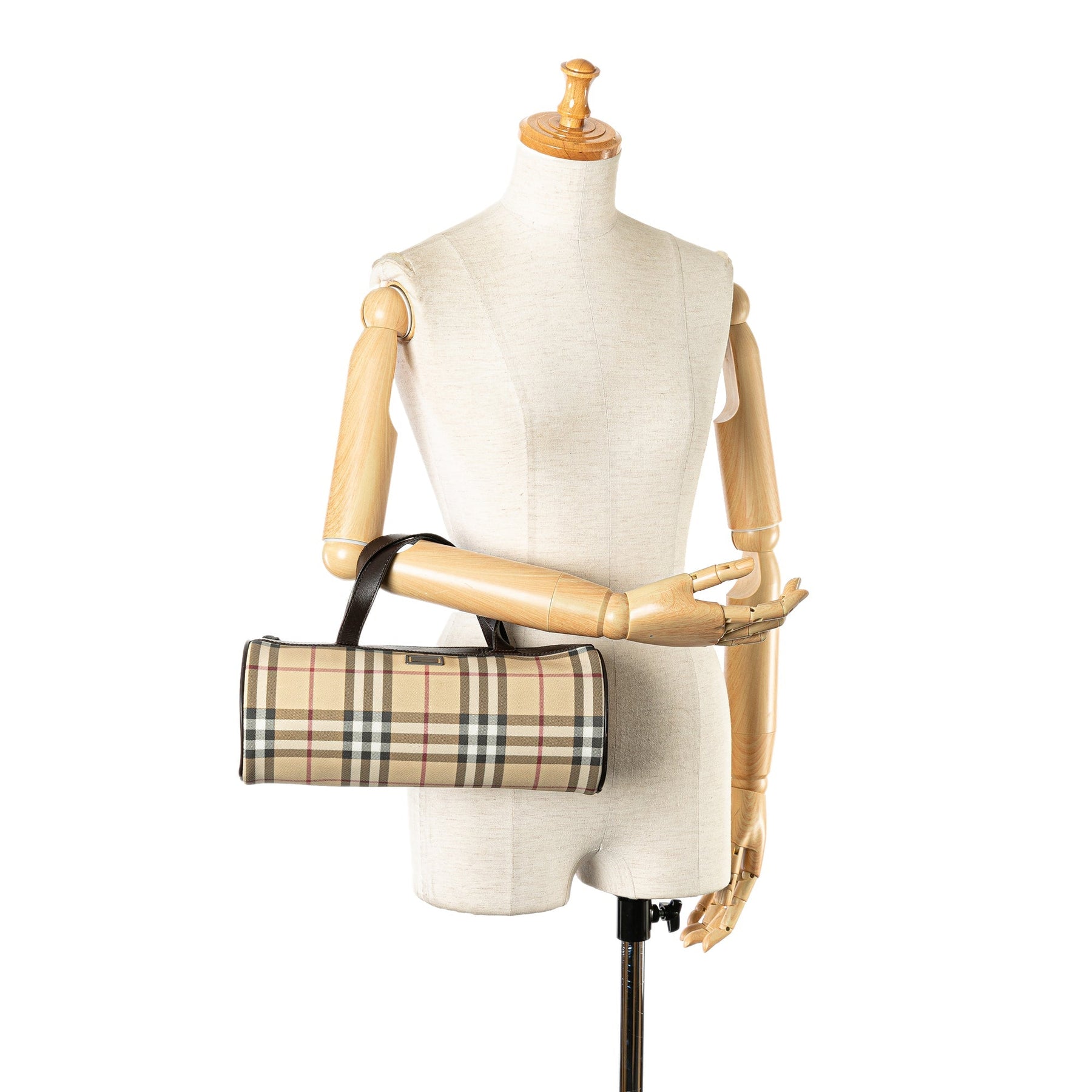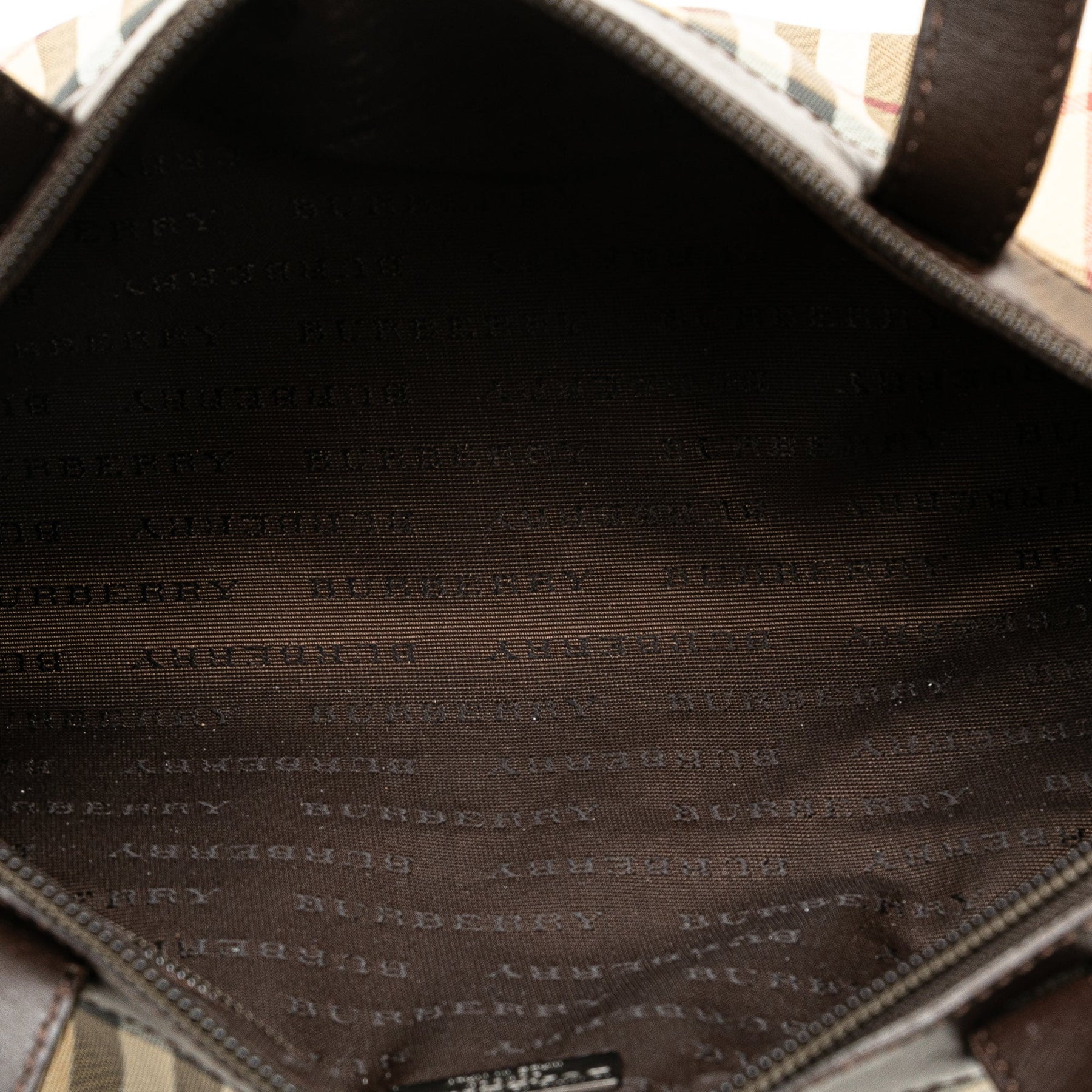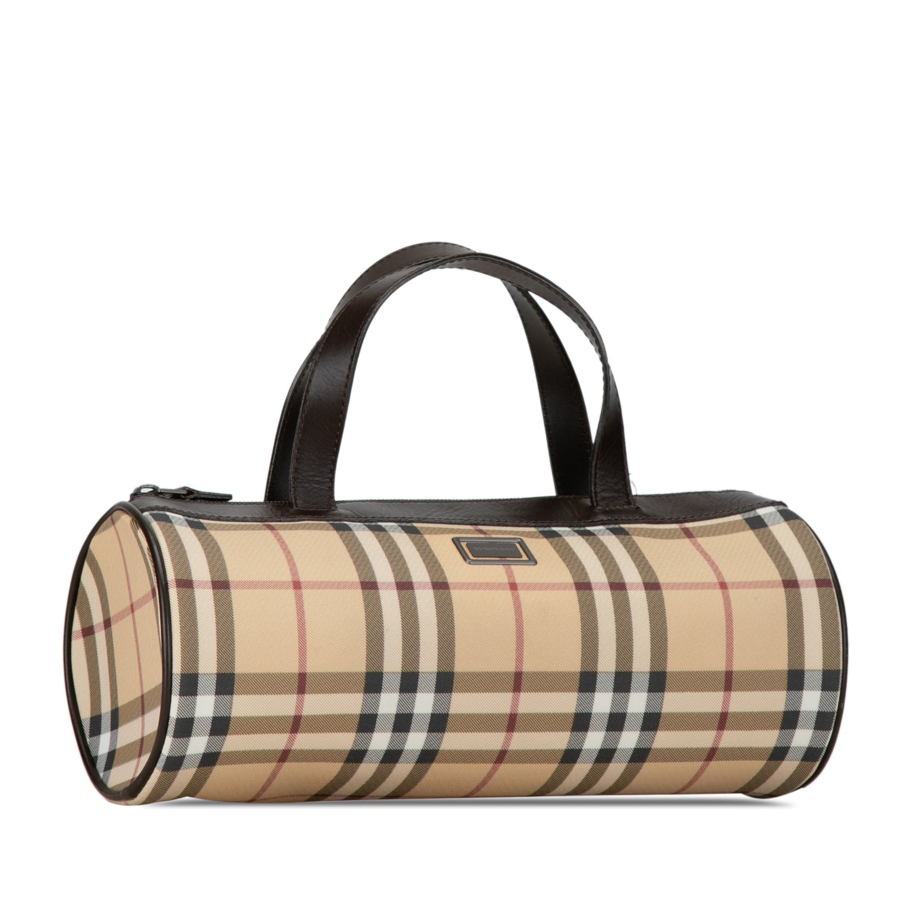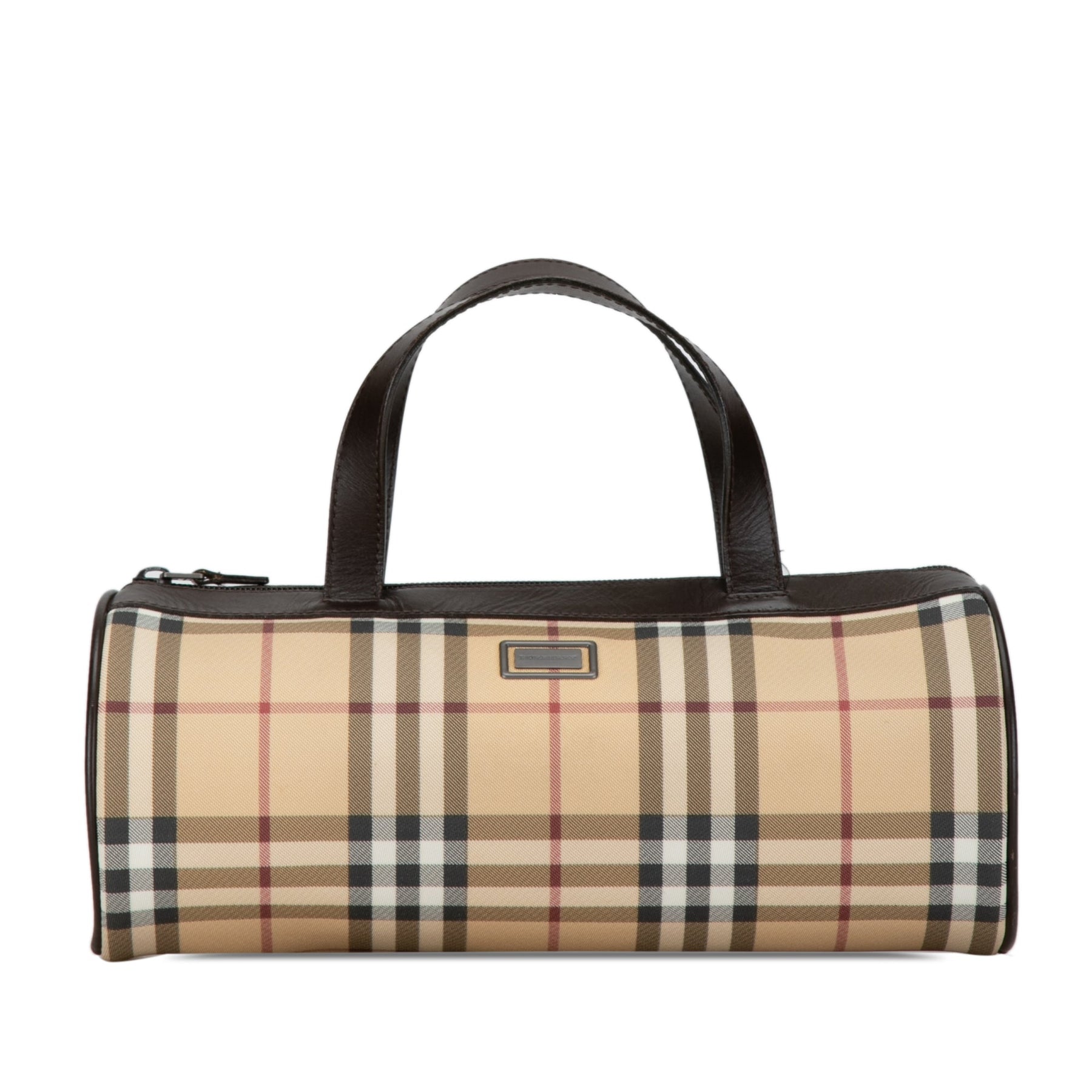This handbag features a canvas body with leather trim, flat leather handles, a top zip closure, and an interior zip pocket.