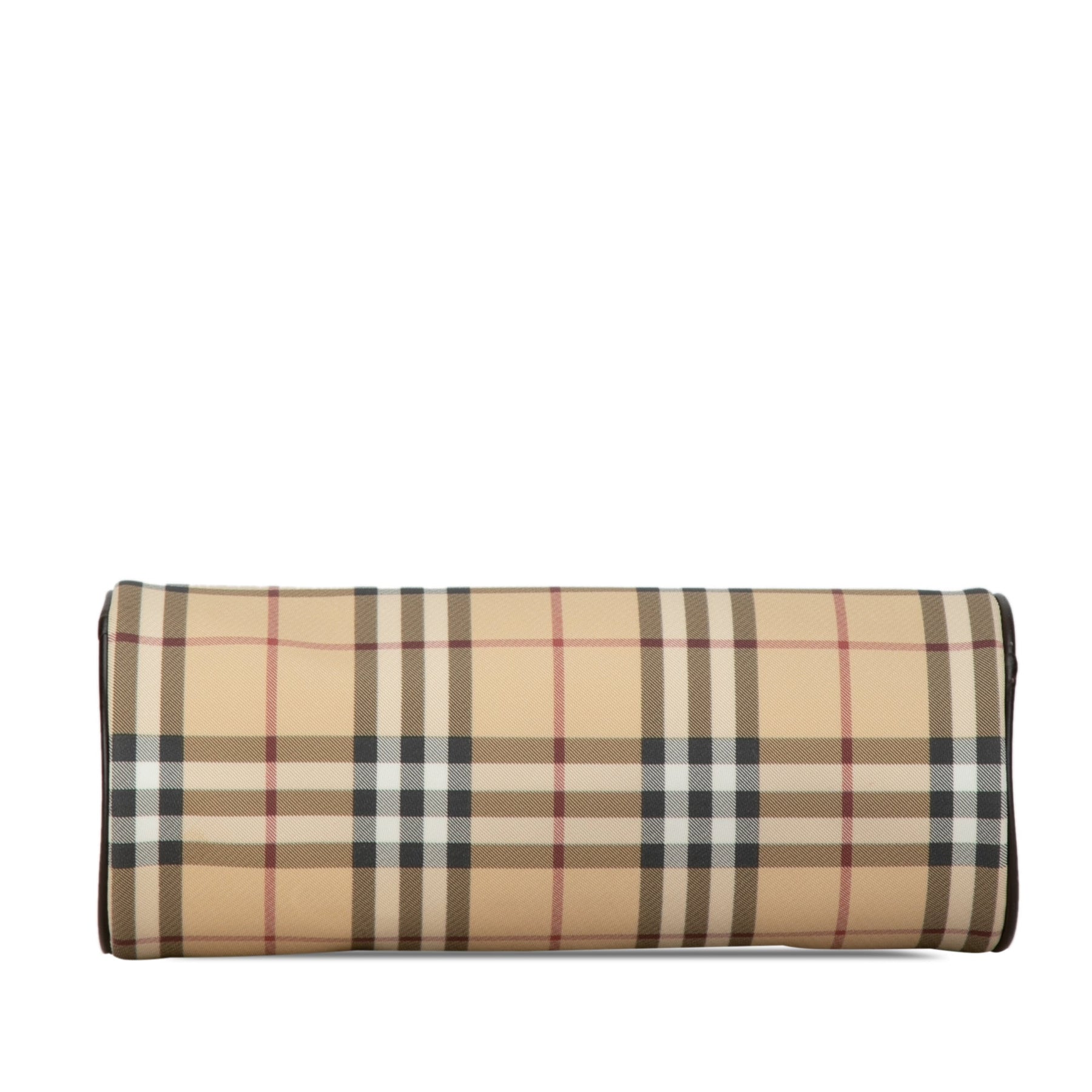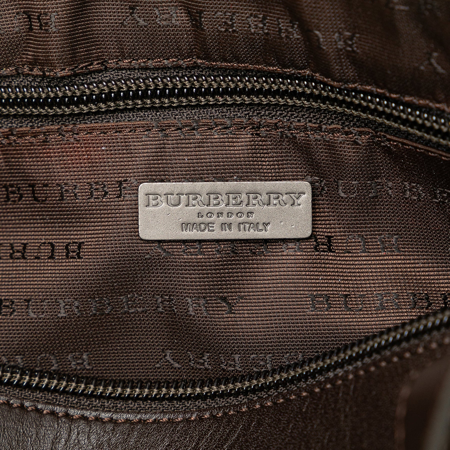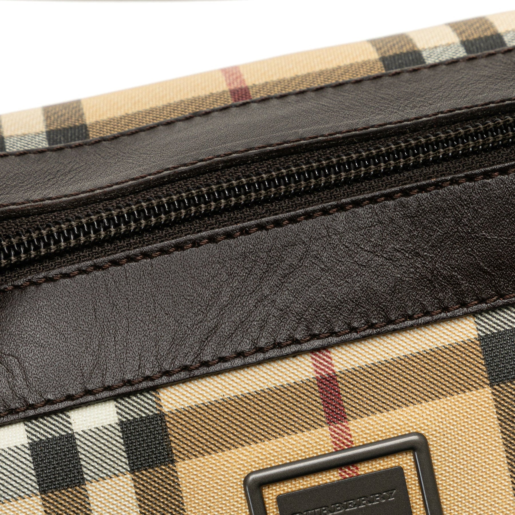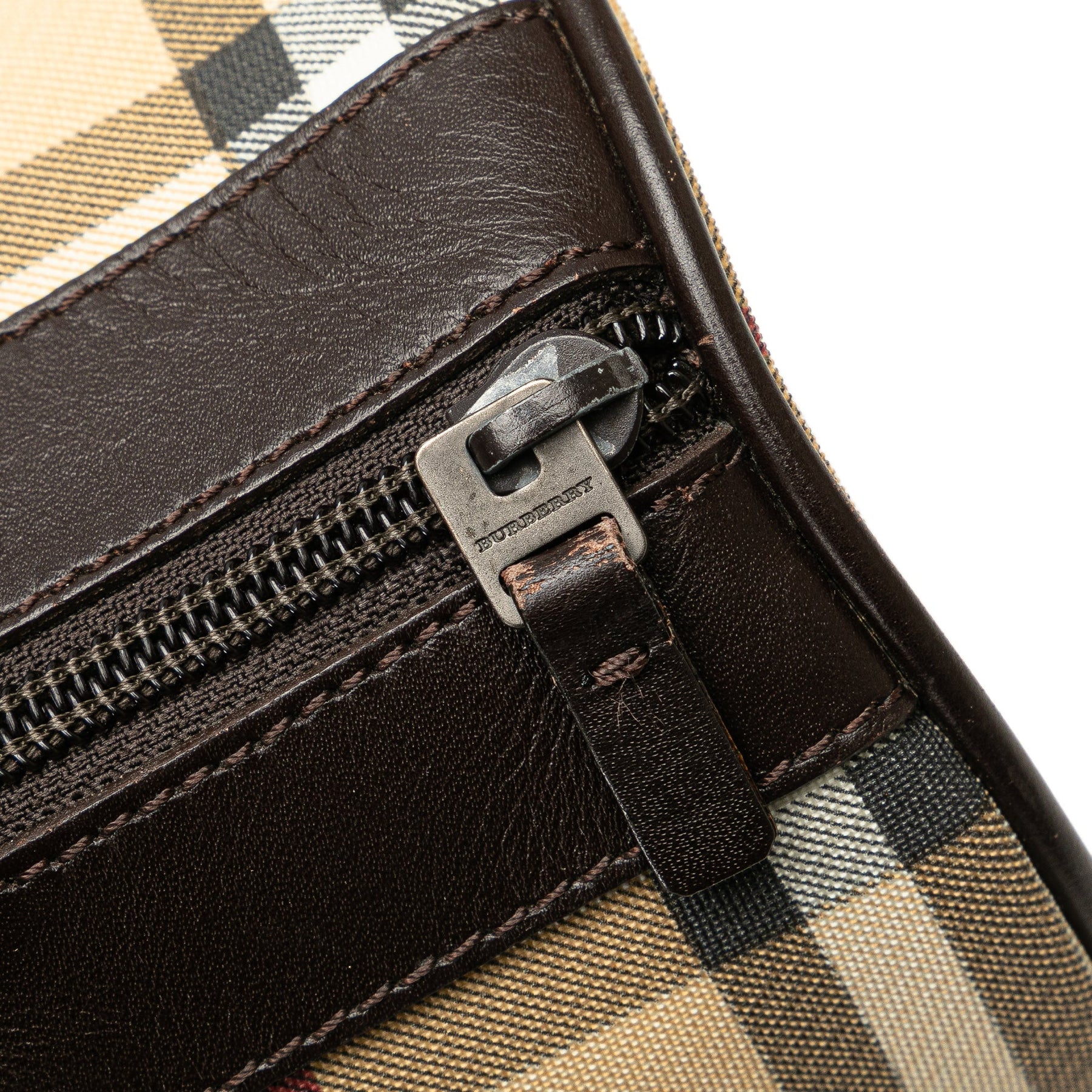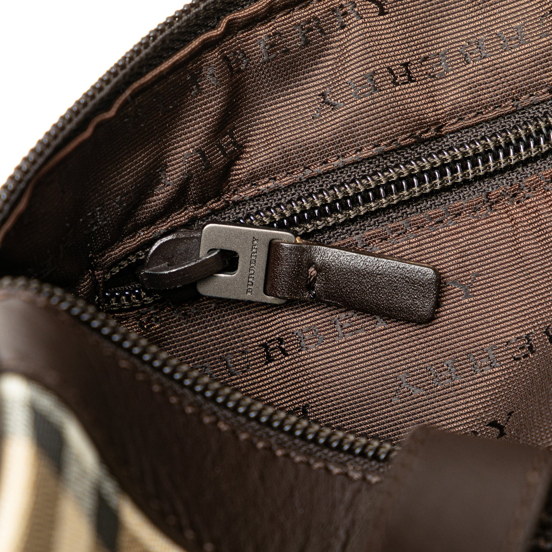 This handbag features a canvas body with leather trim, flat leather handles, a top zip closure, and an interior zip pocket.