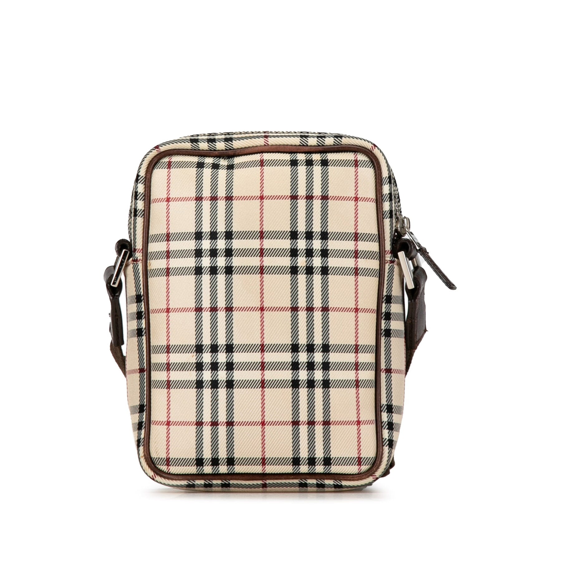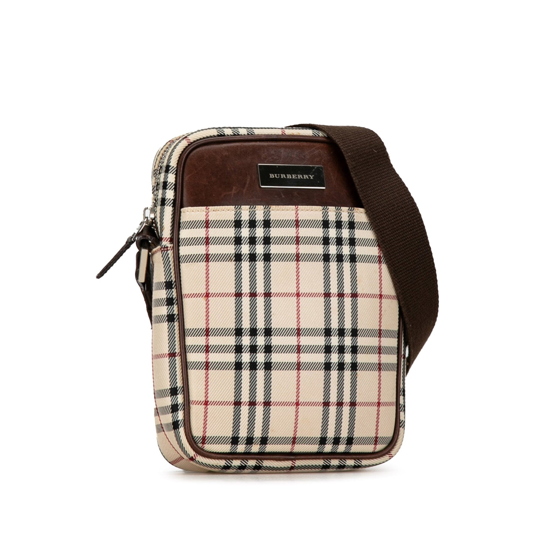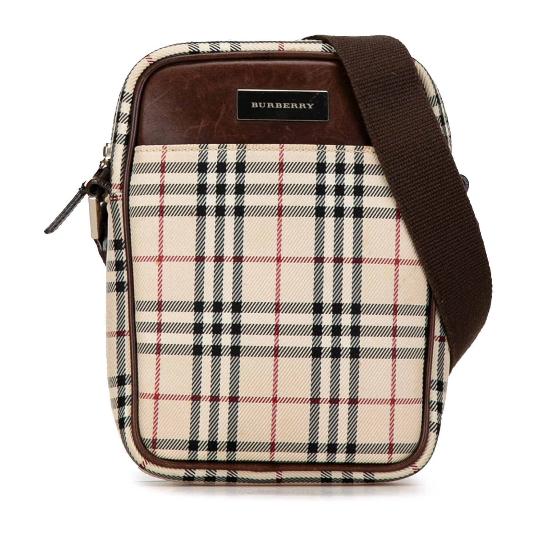 This crossbody bag features a plaid canvas body with leather trim, an adjustable flat strap, a top zip closure, an exterior slip pocket, and an interior zip pocket.