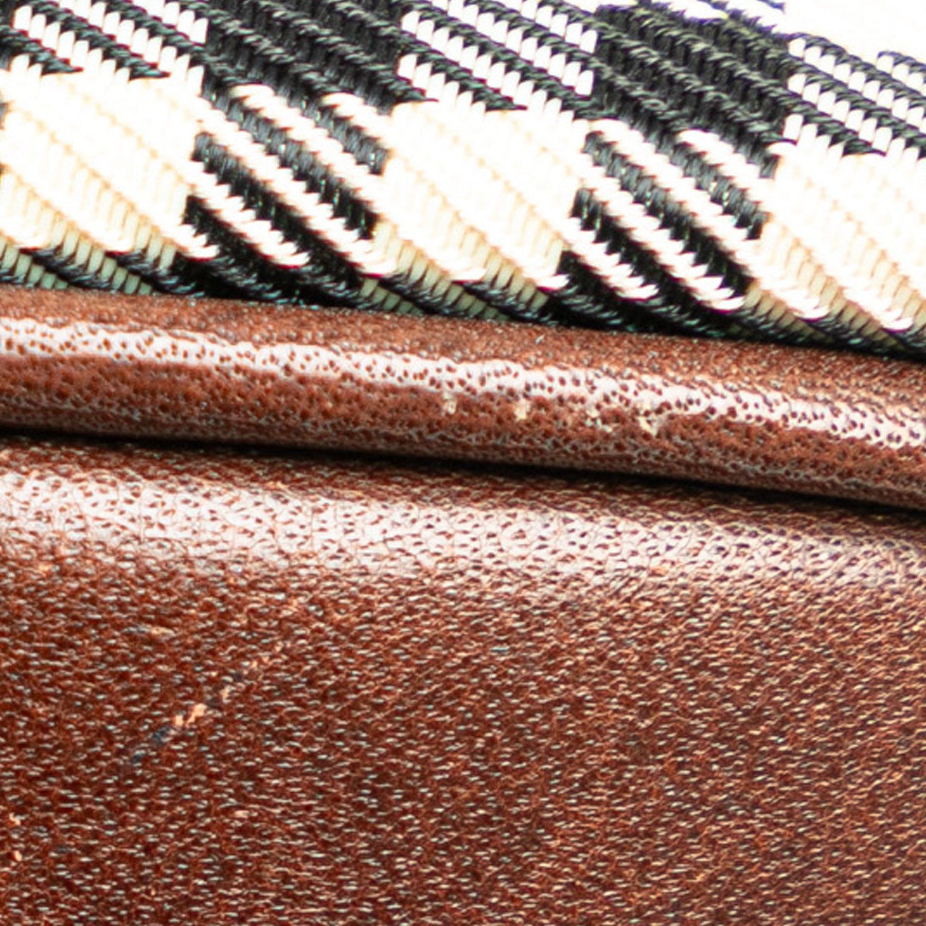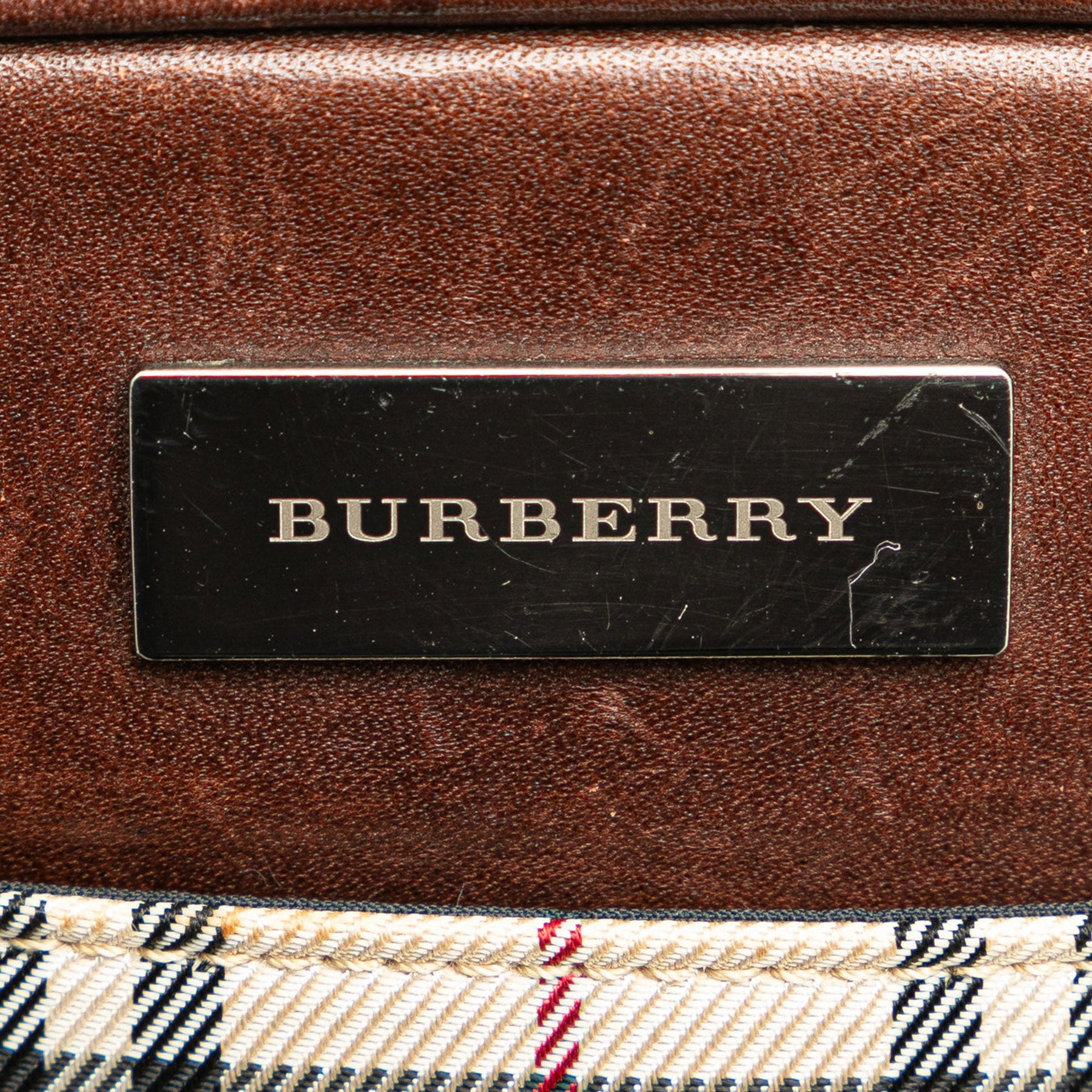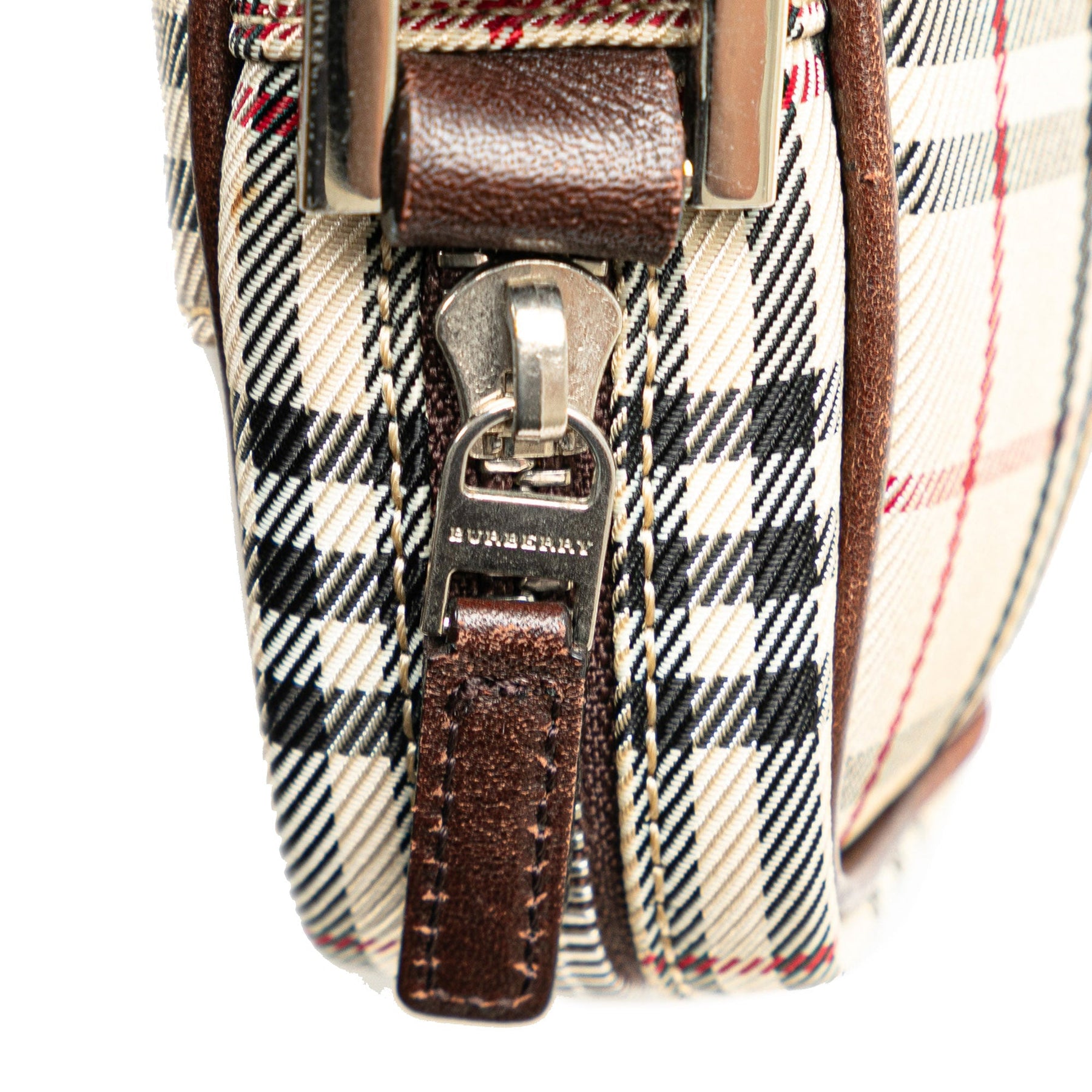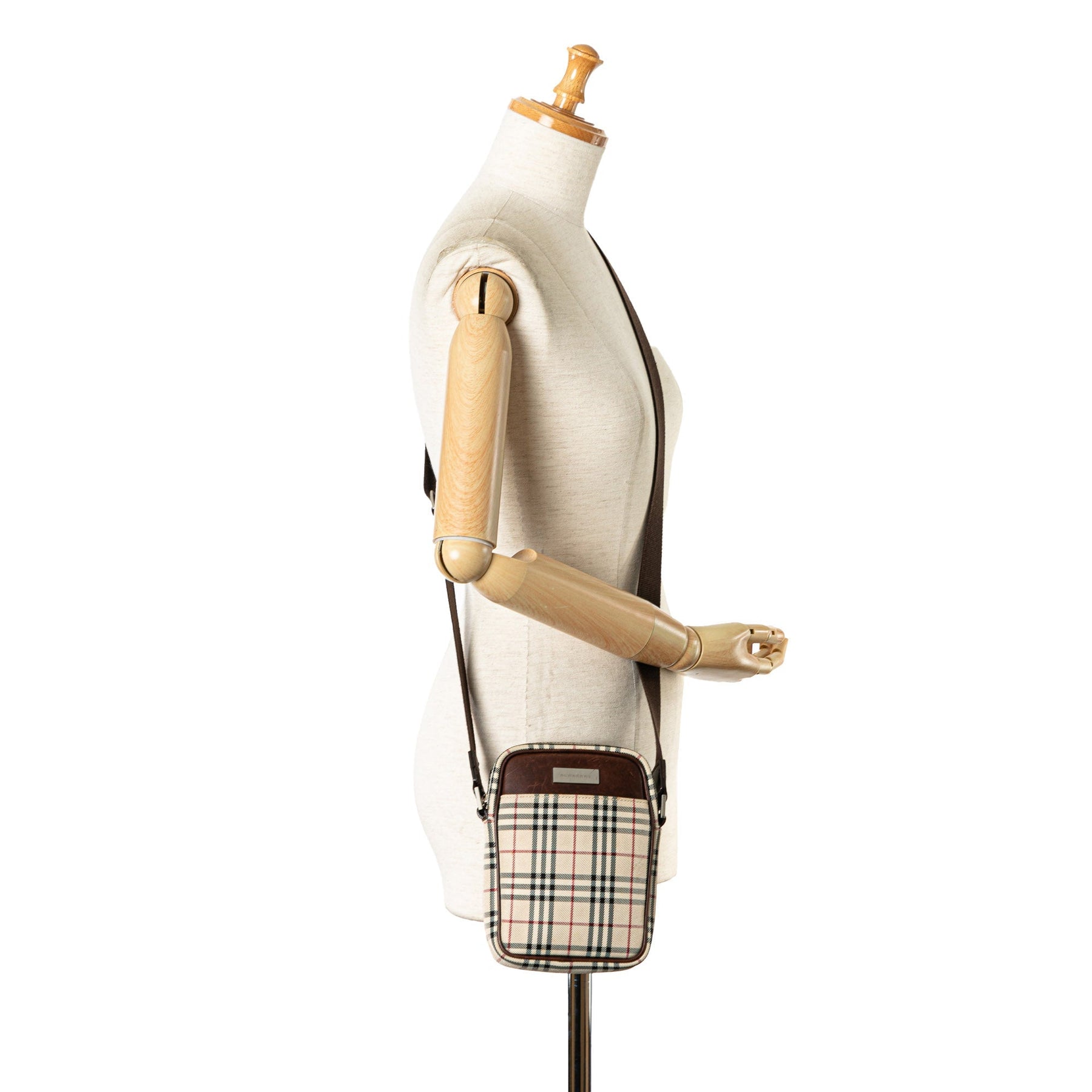 This crossbody bag features a plaid canvas body with leather trim, an adjustable flat strap, a top zip closure, an exterior slip pocket, and an interior zip pocket.