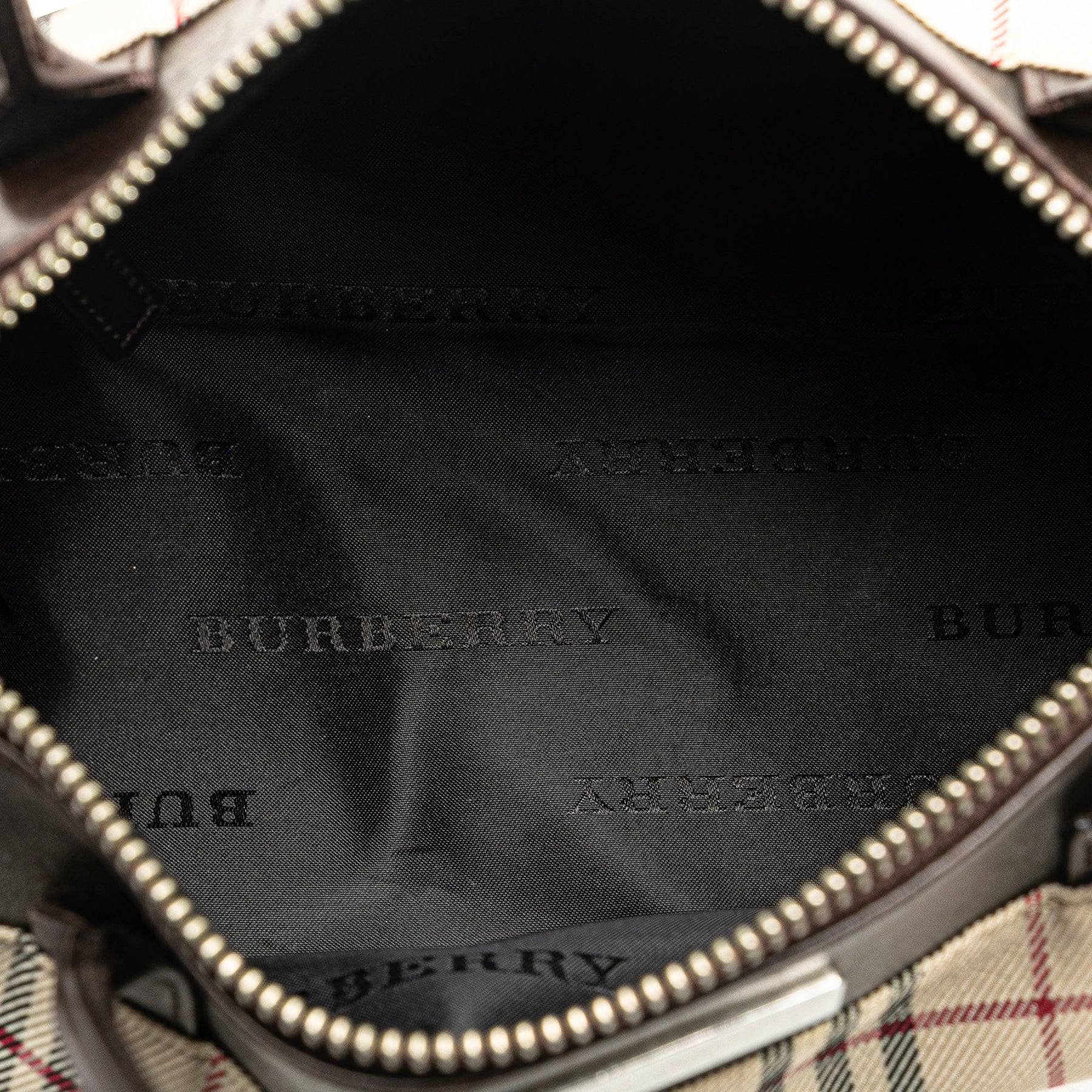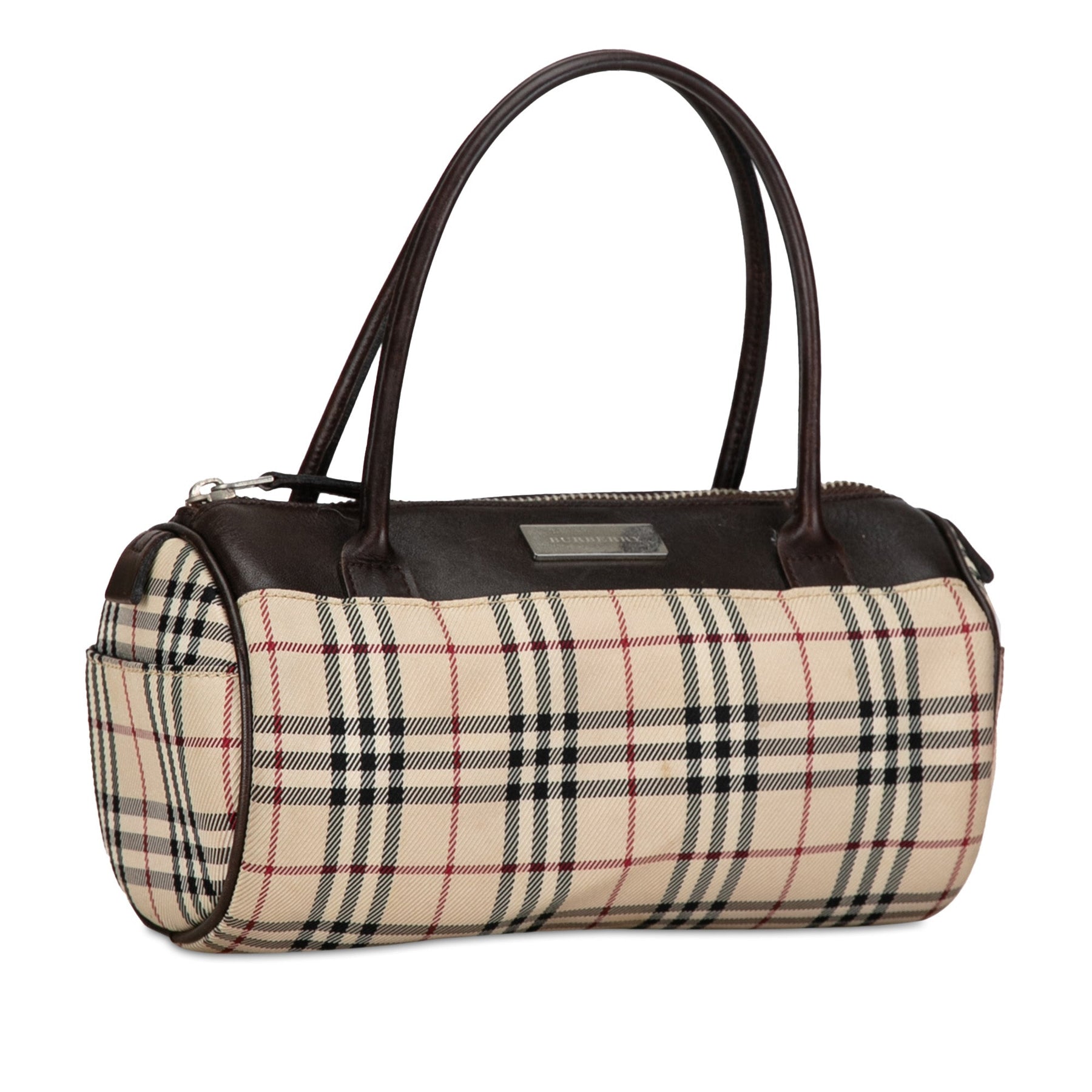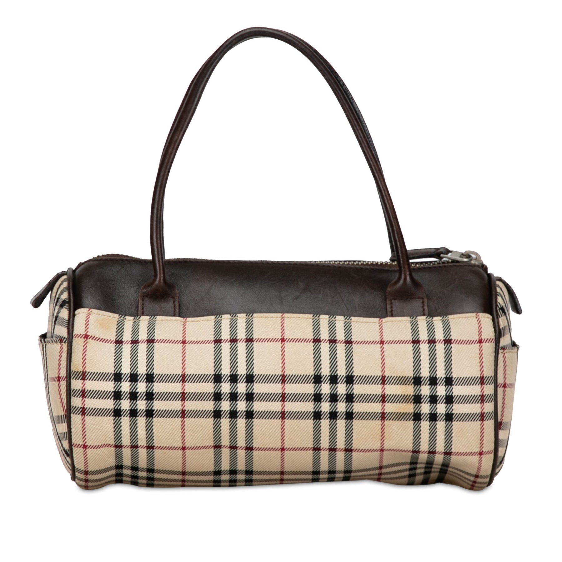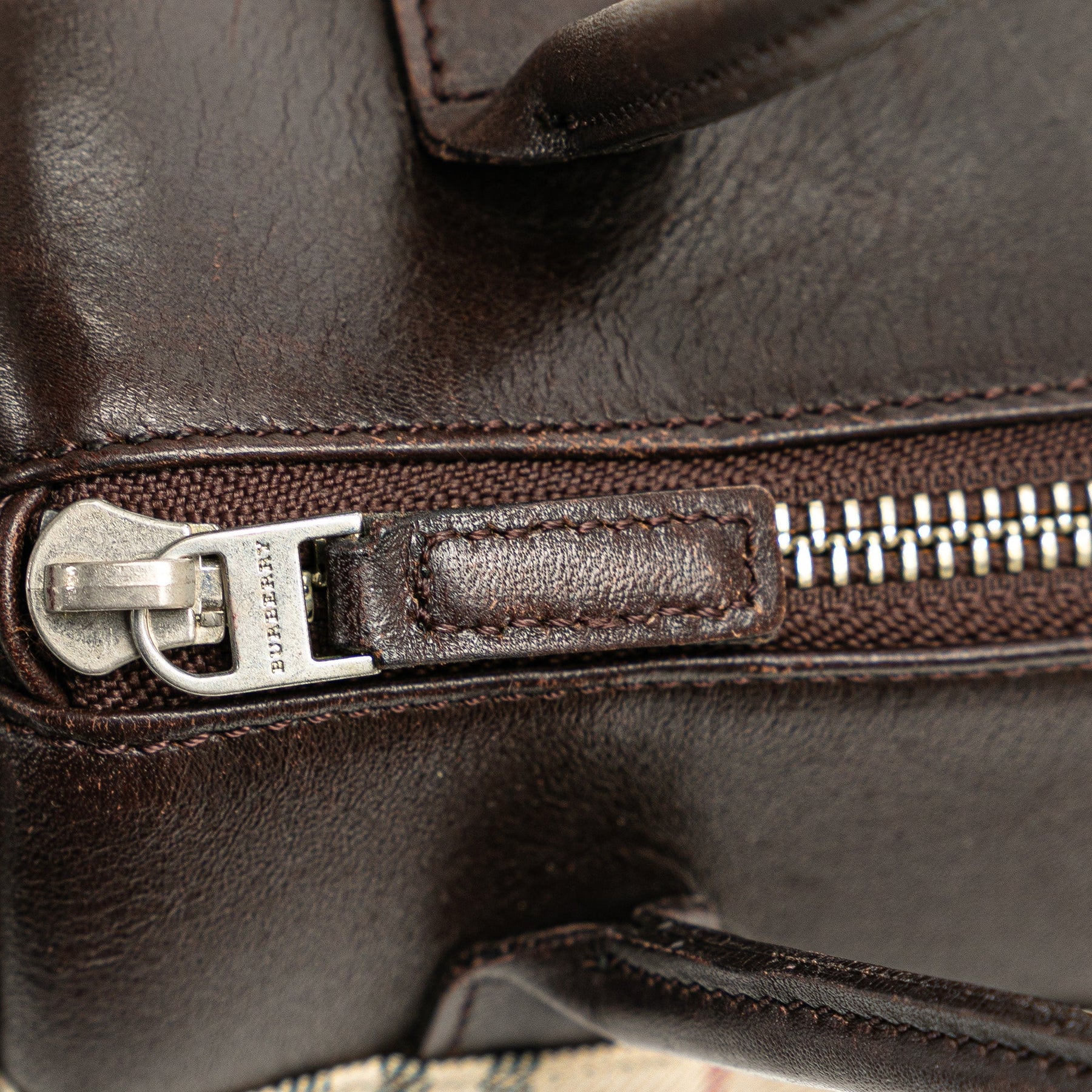 This handbag features a plaid canvas body with leather trim, rolled leather handles, a top zip closure, and exterior side slip pockets.