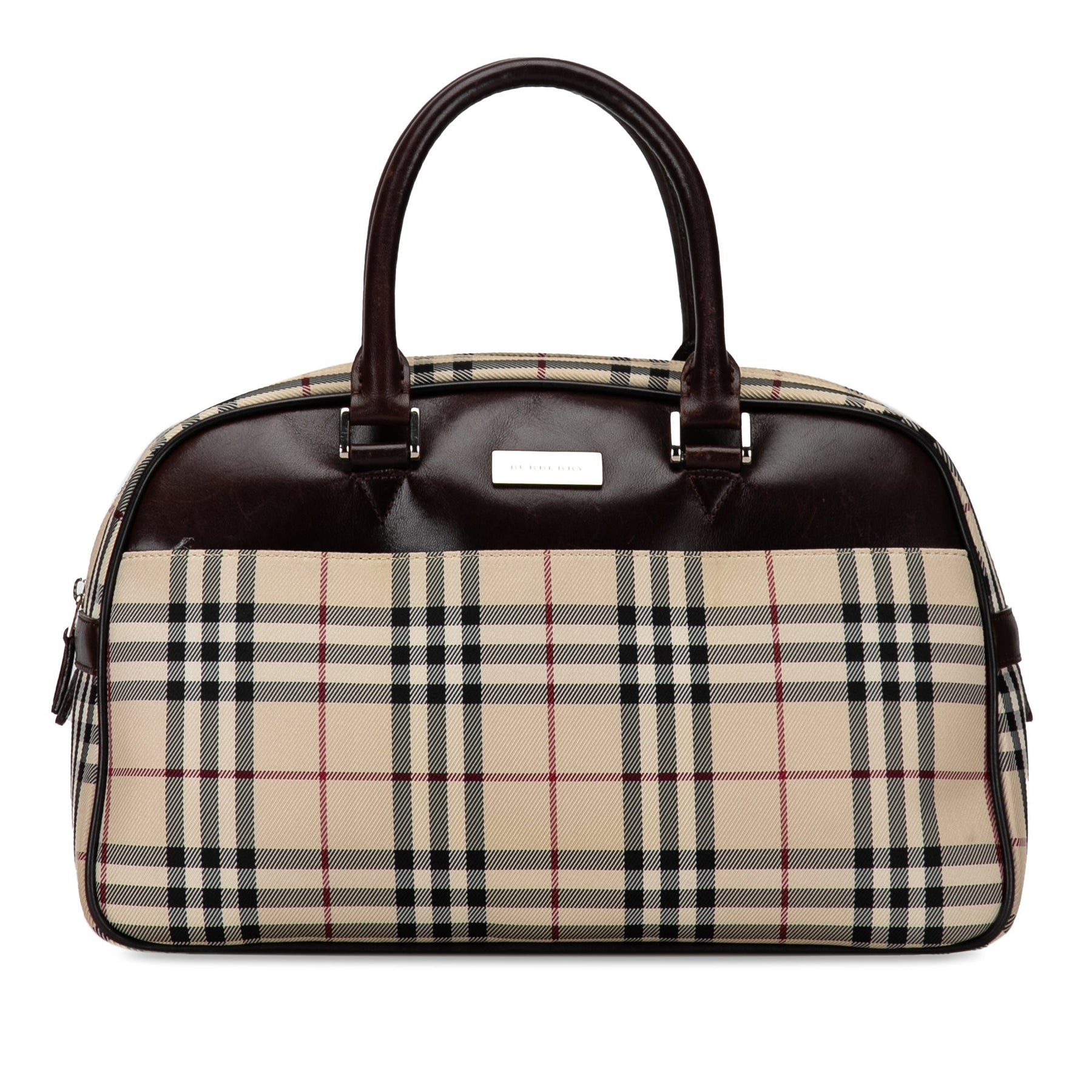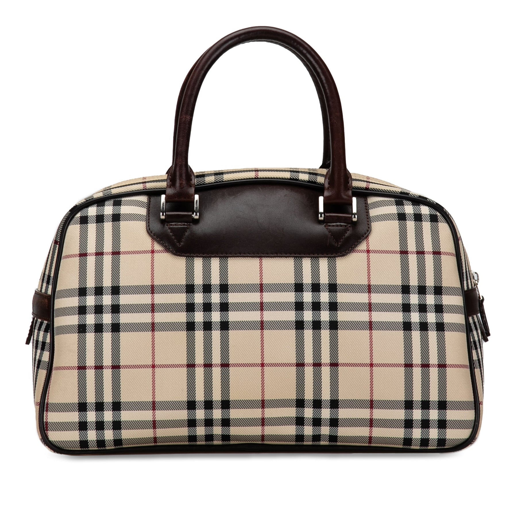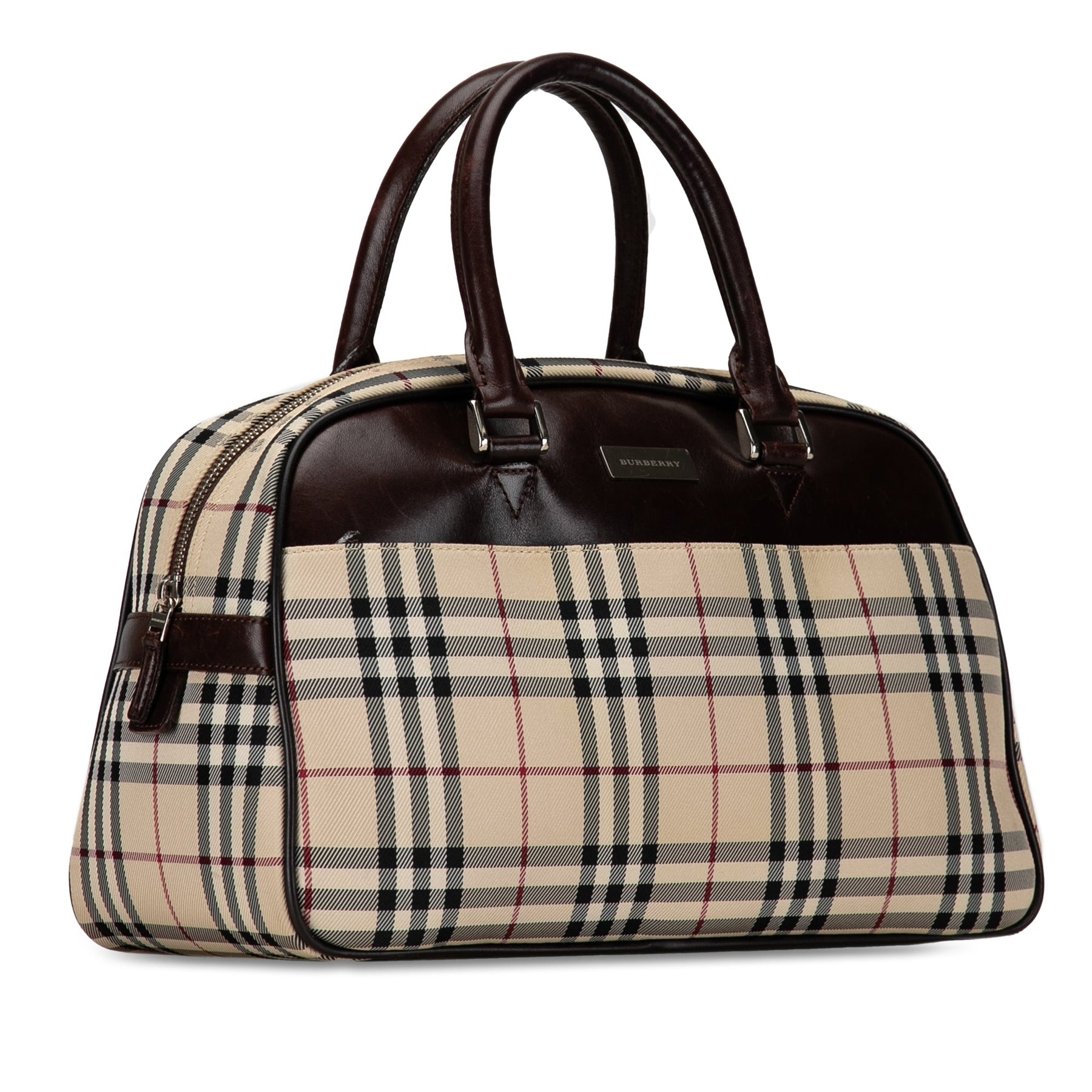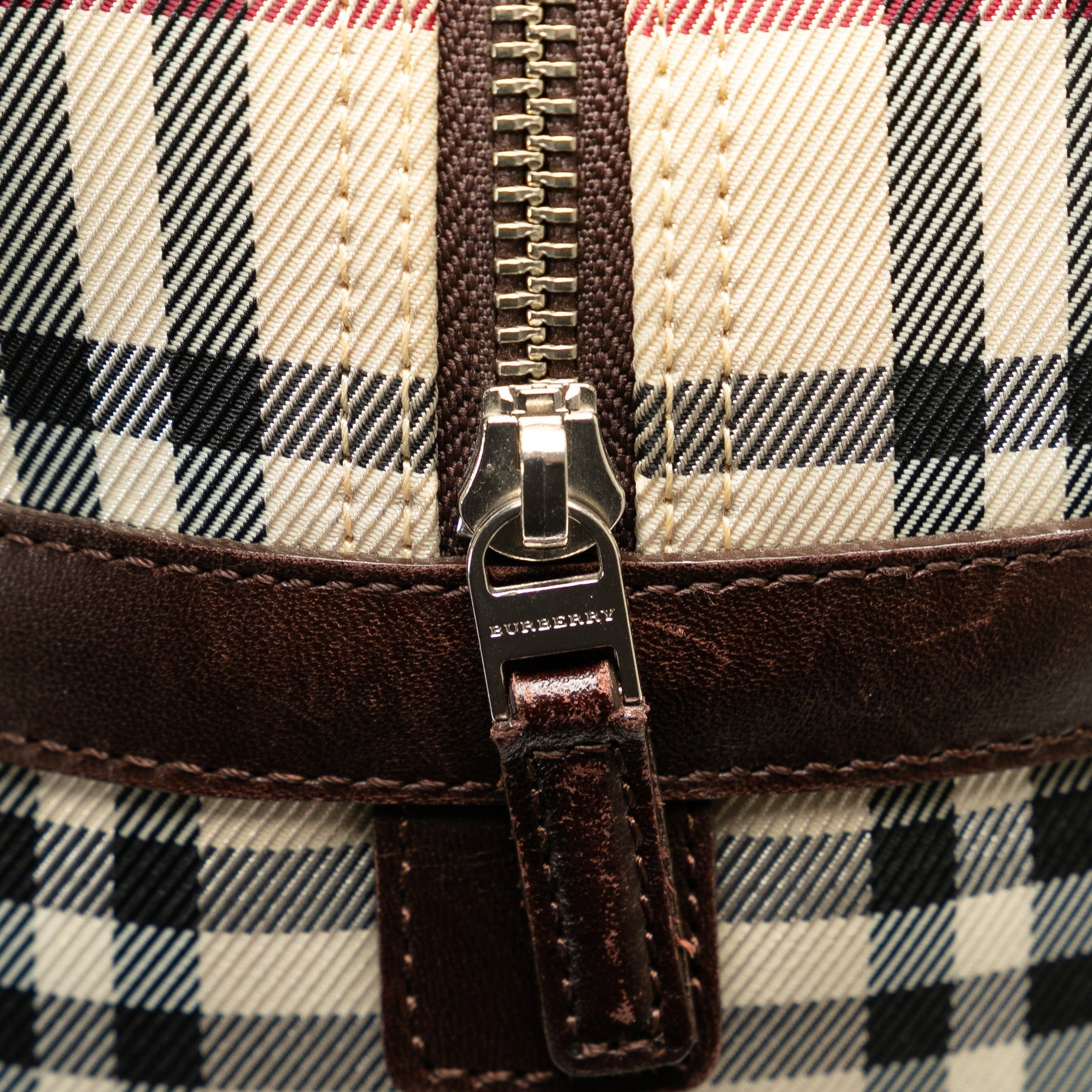 This handbag features a canvas body with leather trim, rolled leather handles, a top zip closure, an exterior slip pocket, and interior slip pockets.