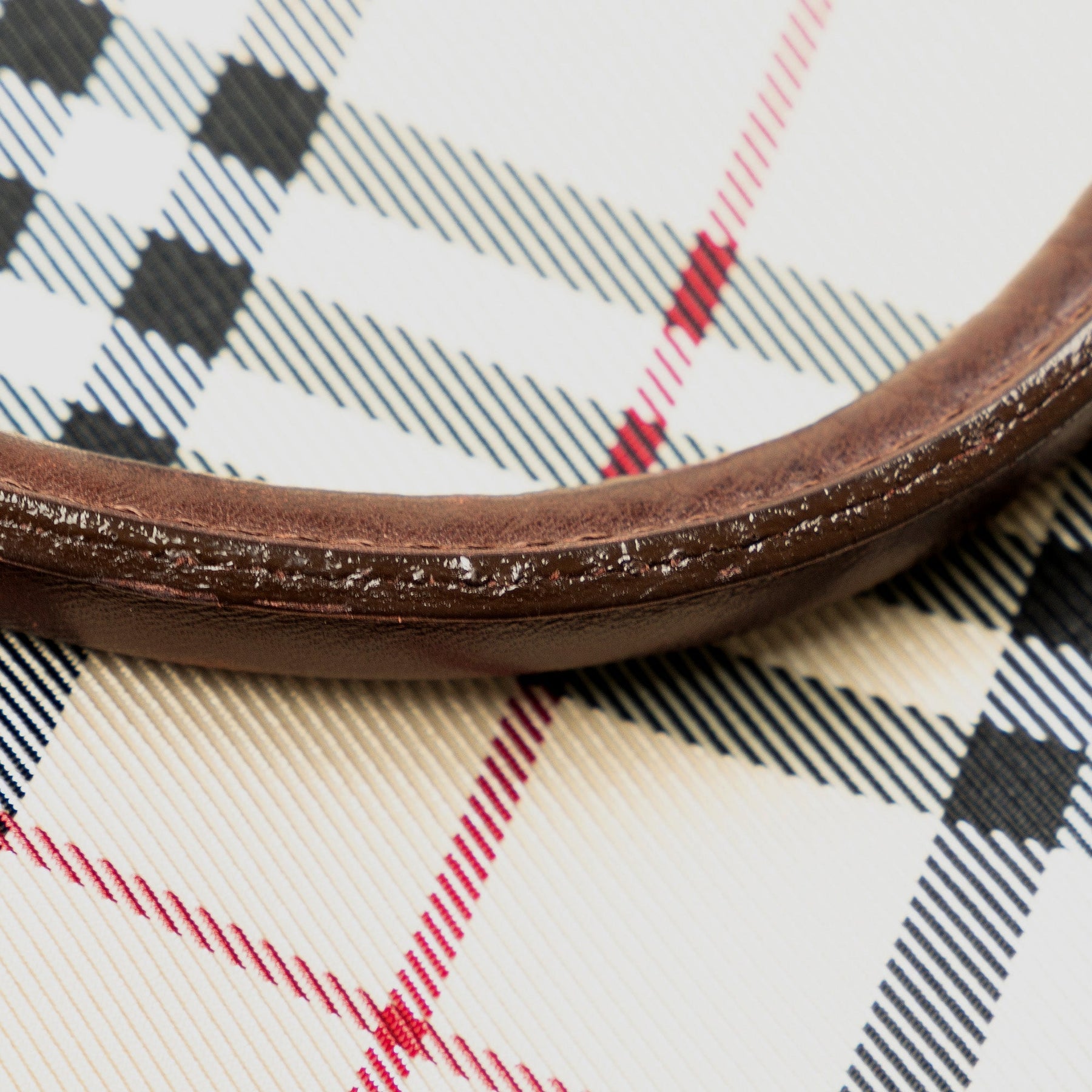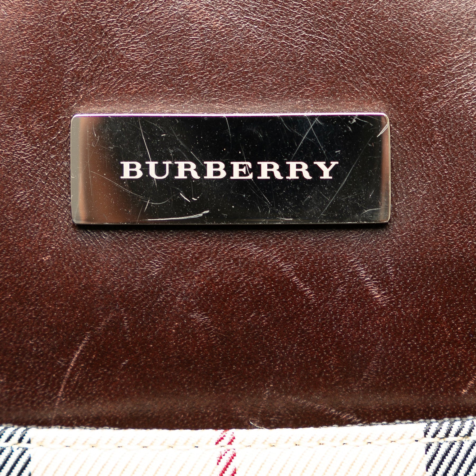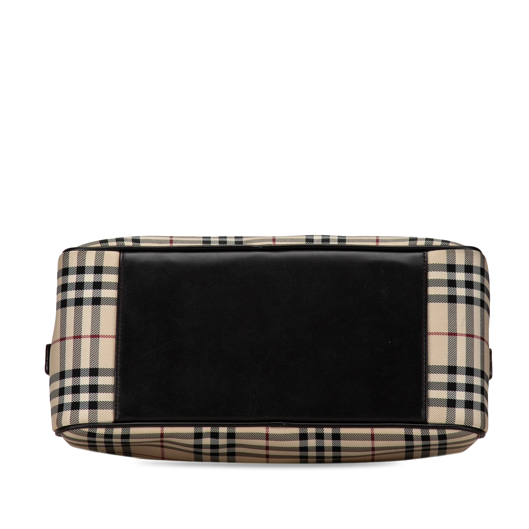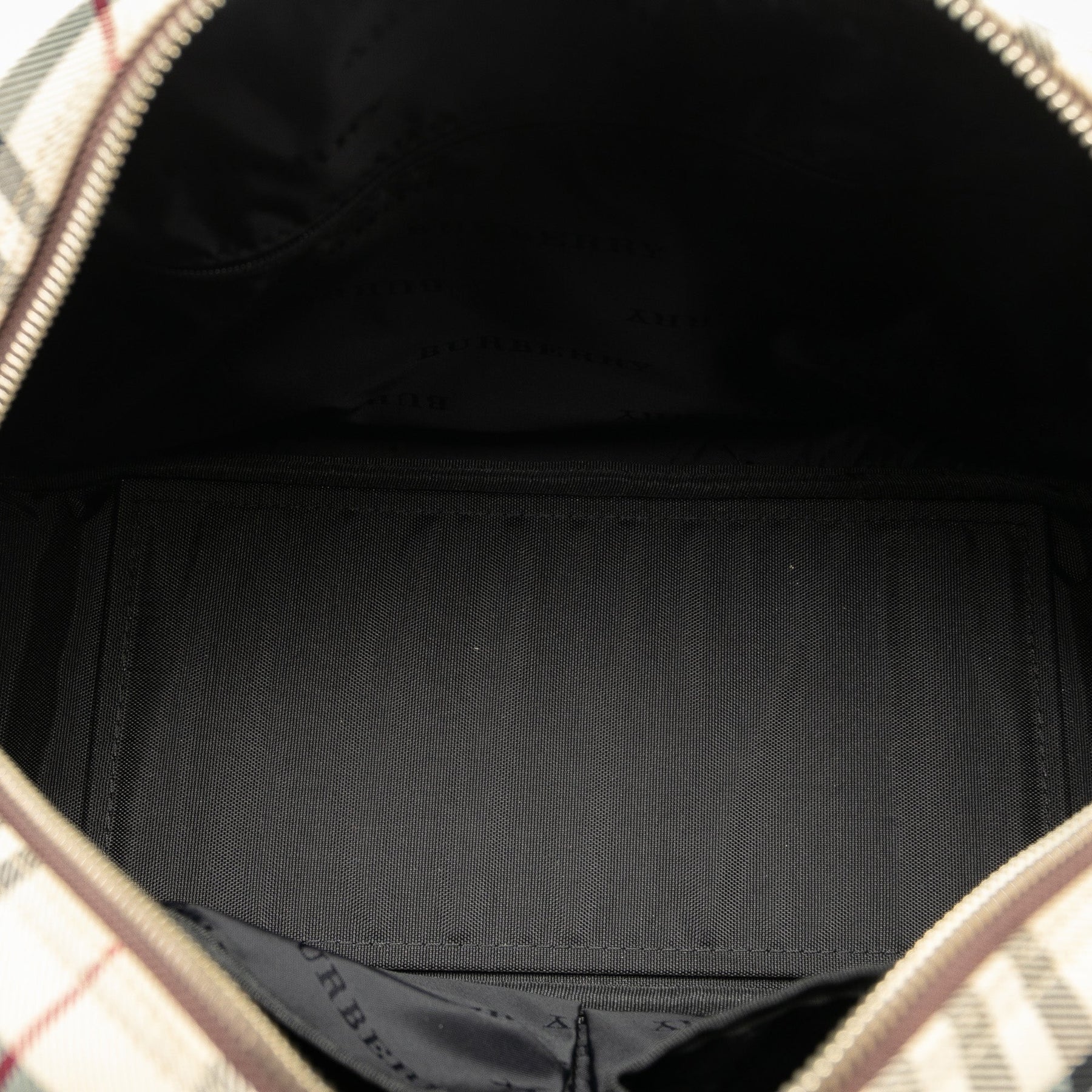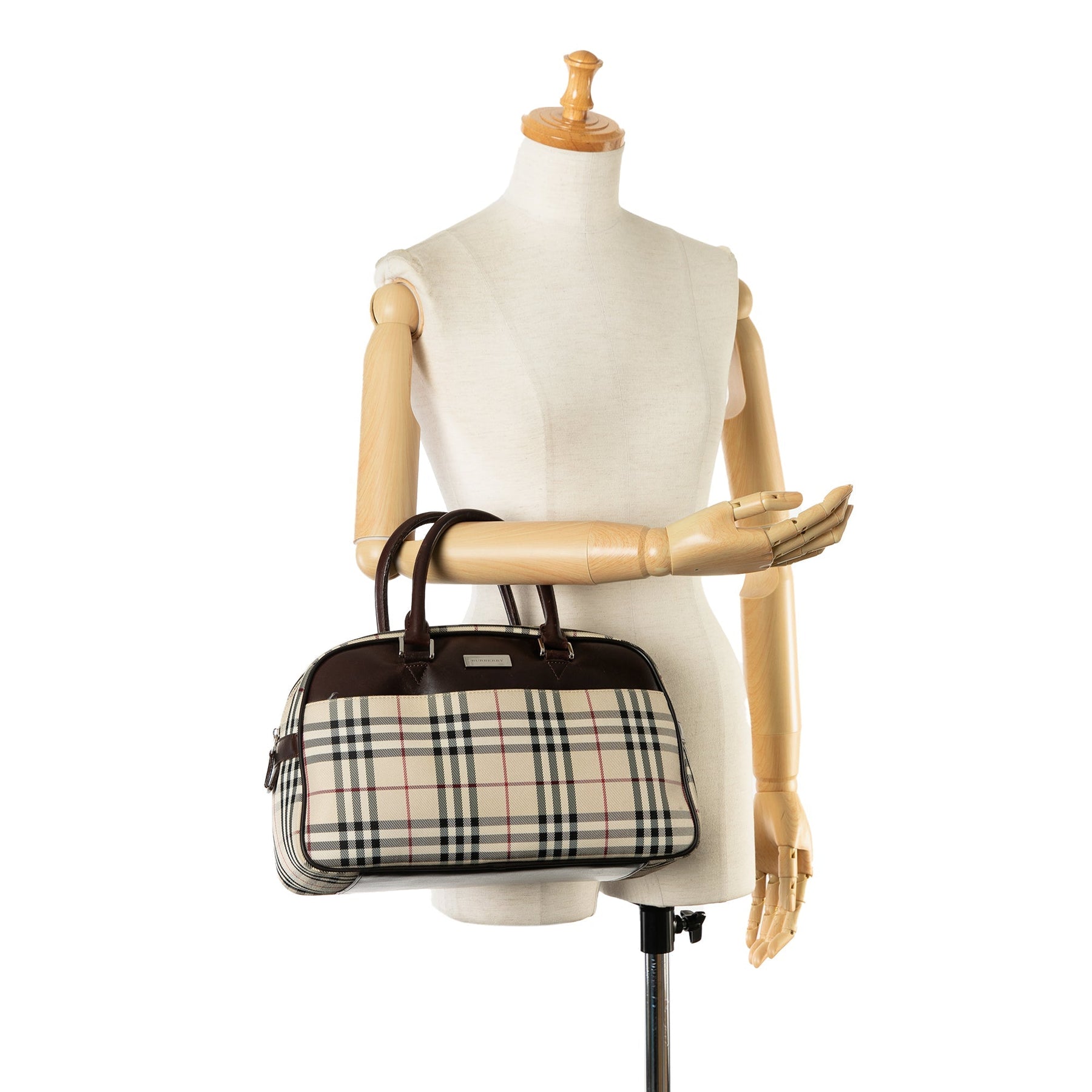 This handbag features a canvas body with leather trim, rolled leather handles, a top zip closure, an exterior slip pocket, and interior slip pockets.
