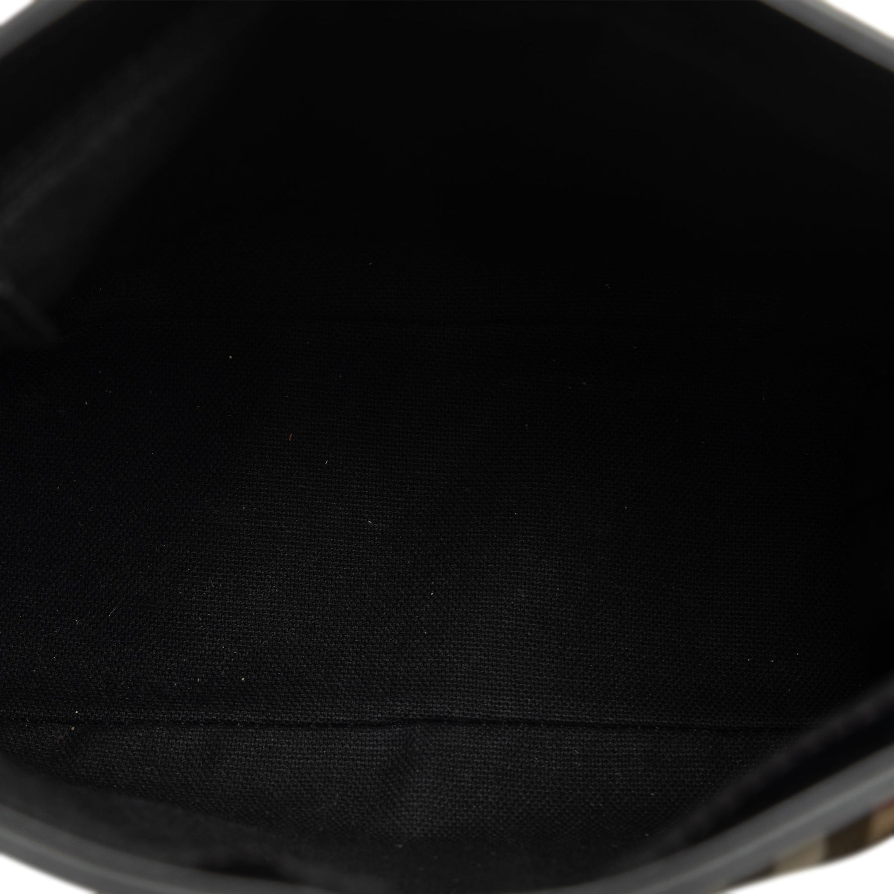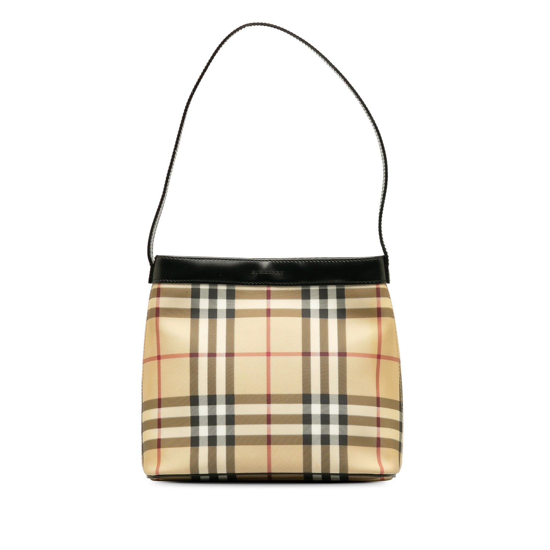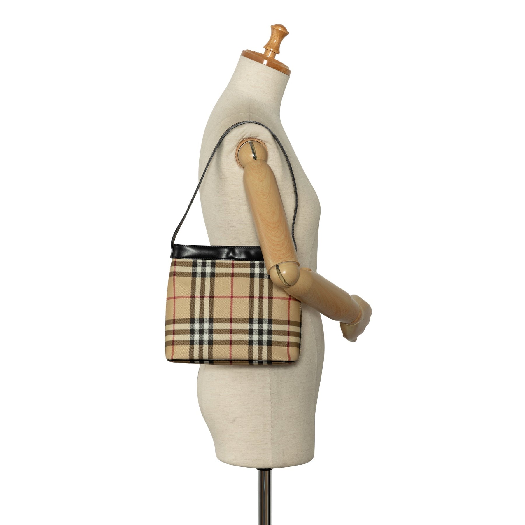 This shoulder bag features a canvas body with leather trim, a flat leather strap, an open top with a magnetic snap button closure, and interior zip and slip pockets.