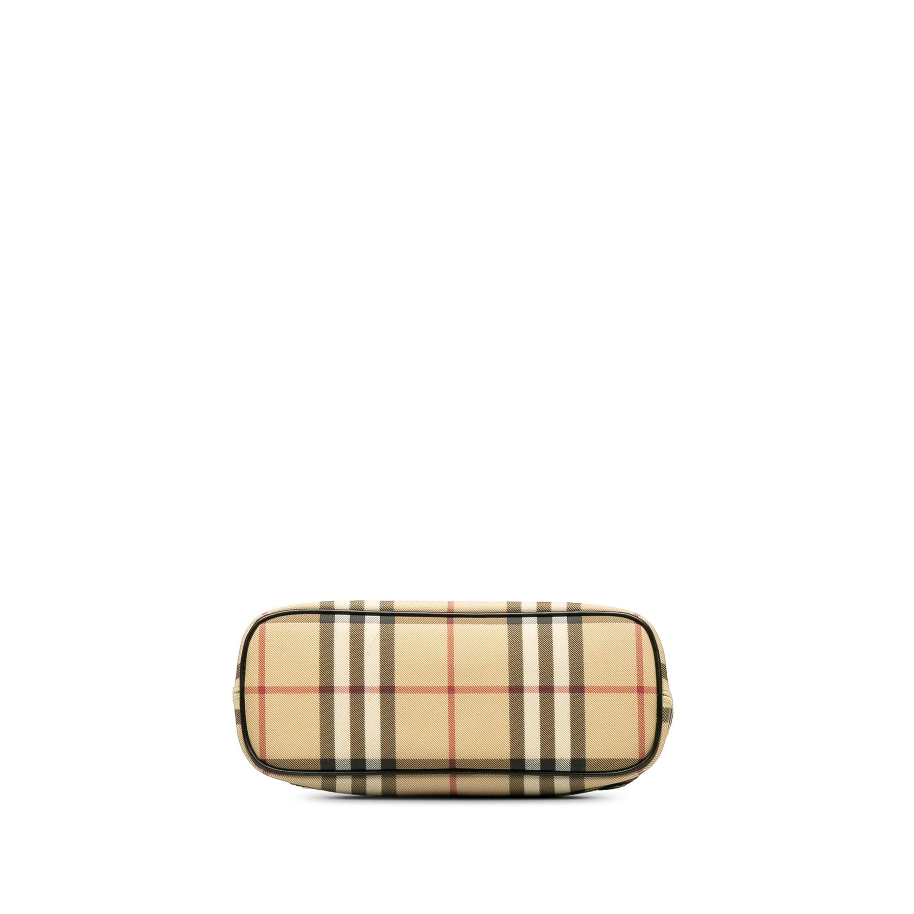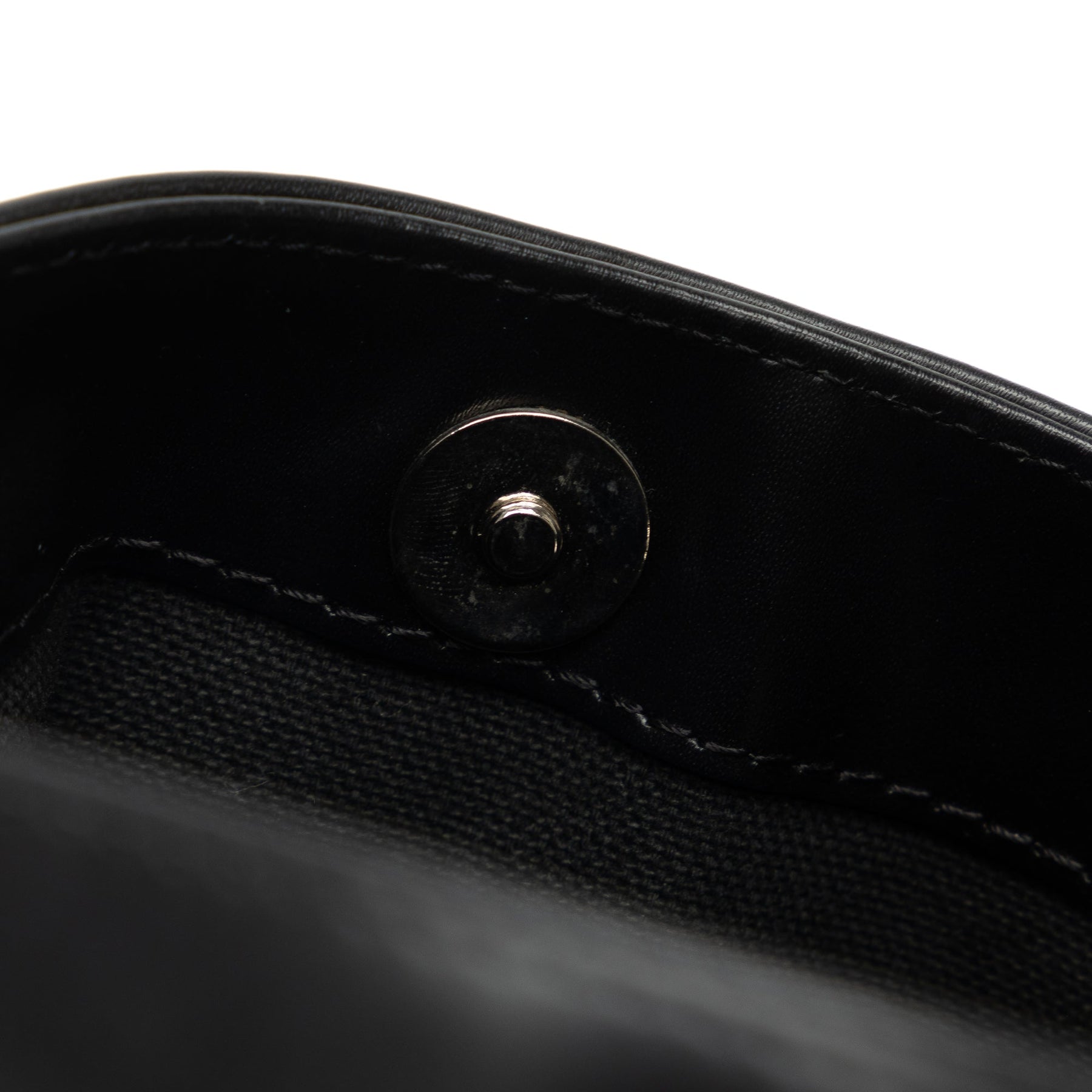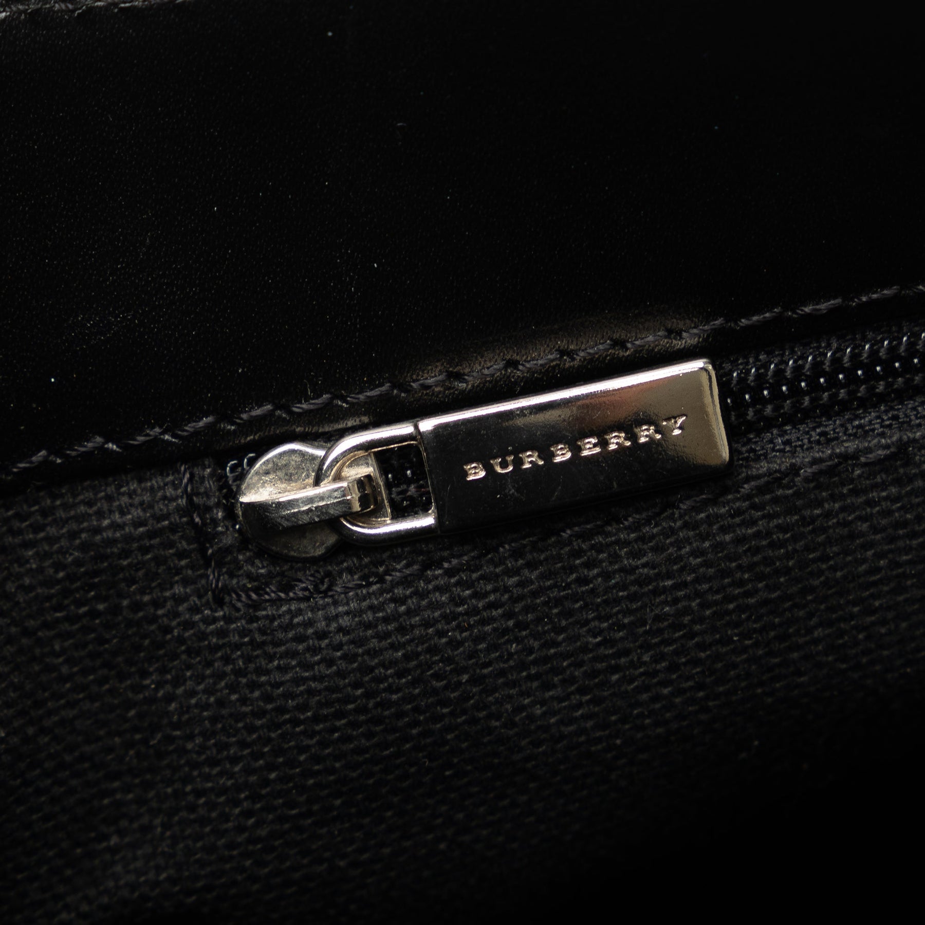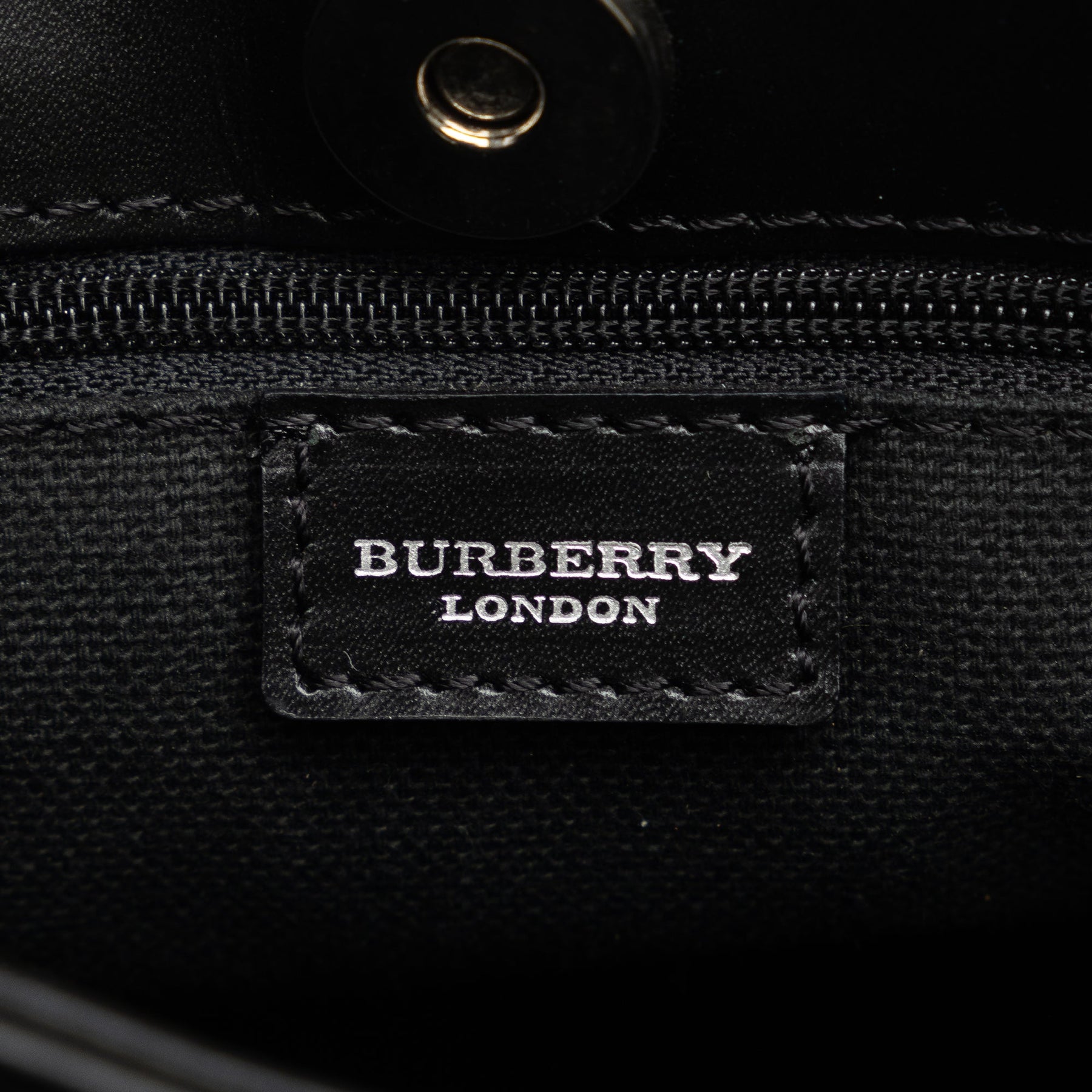 This shoulder bag features a canvas body with leather trim, a flat leather strap, an open top with a magnetic snap button closure, and interior zip and slip pockets.