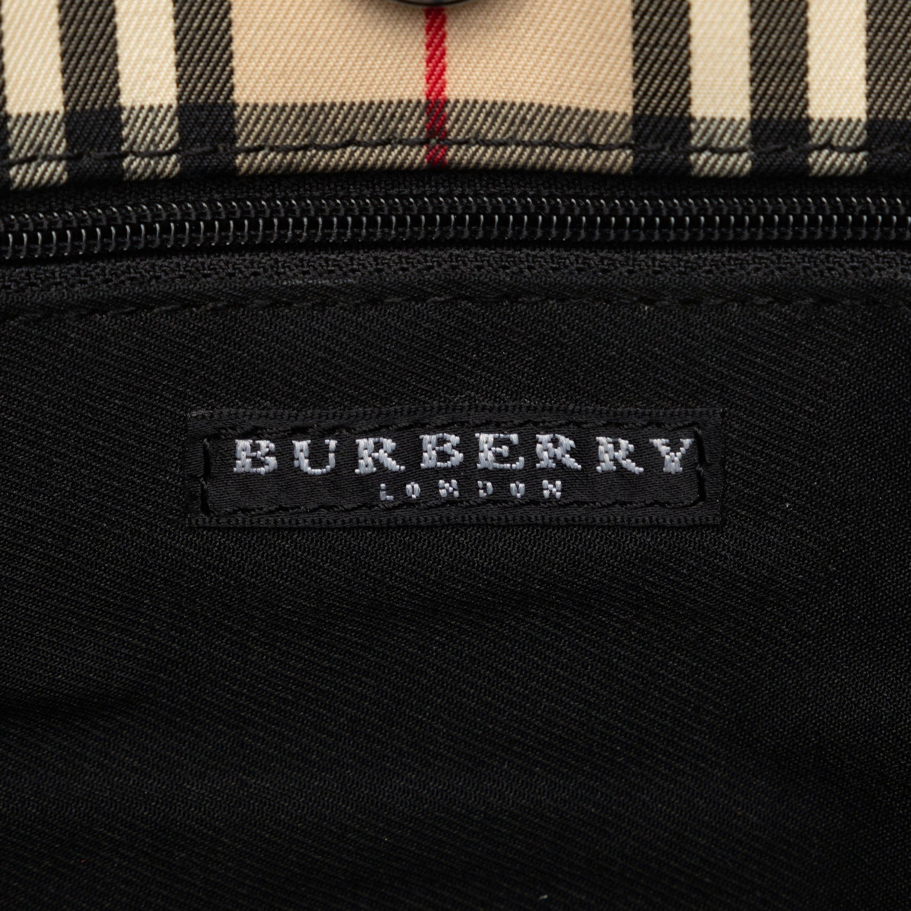 This tote bag features a plaid canvas body, rolled leather handles, and an open top with magnetic snap closure.