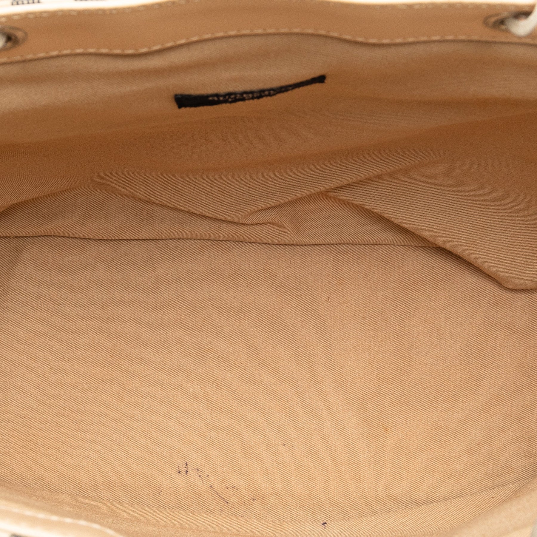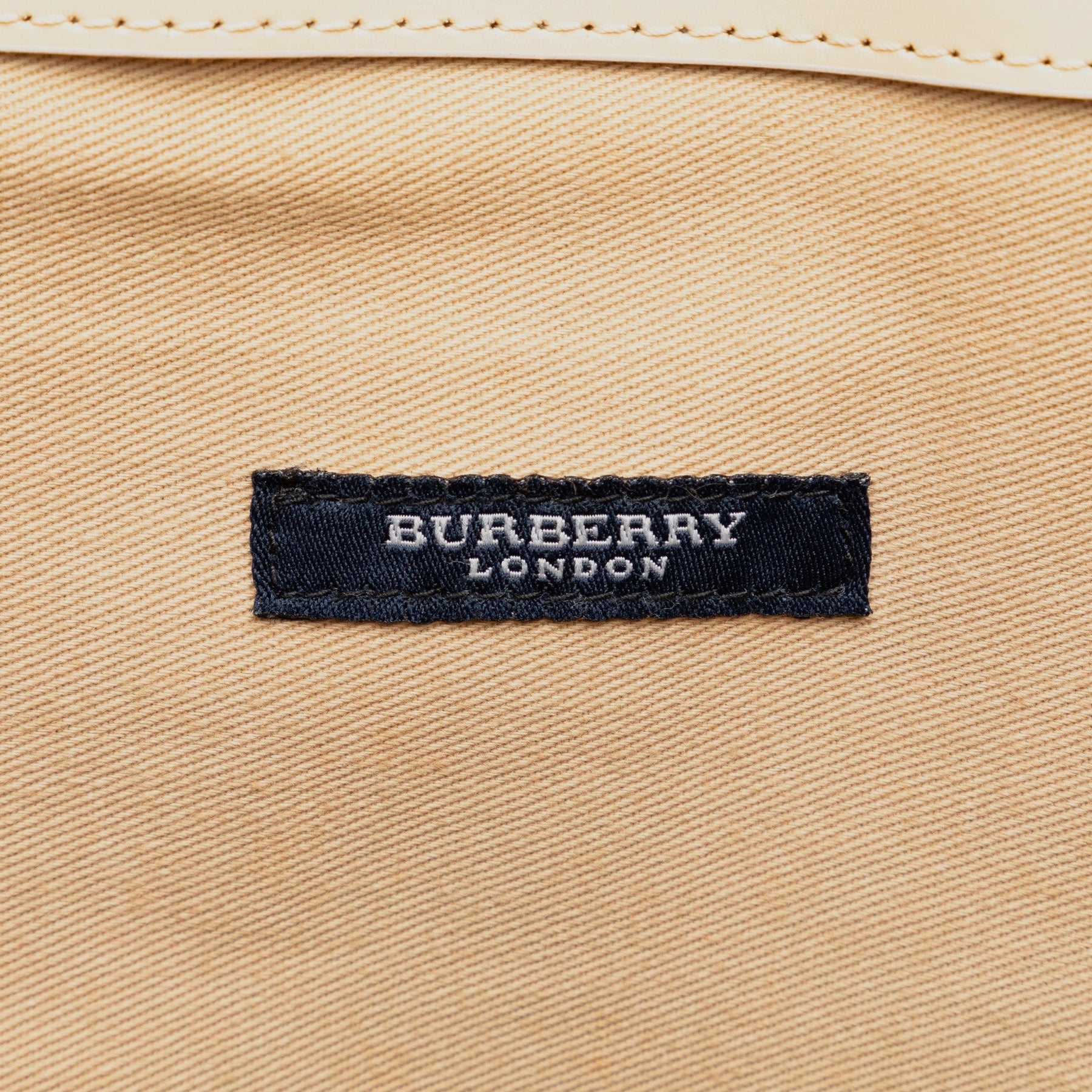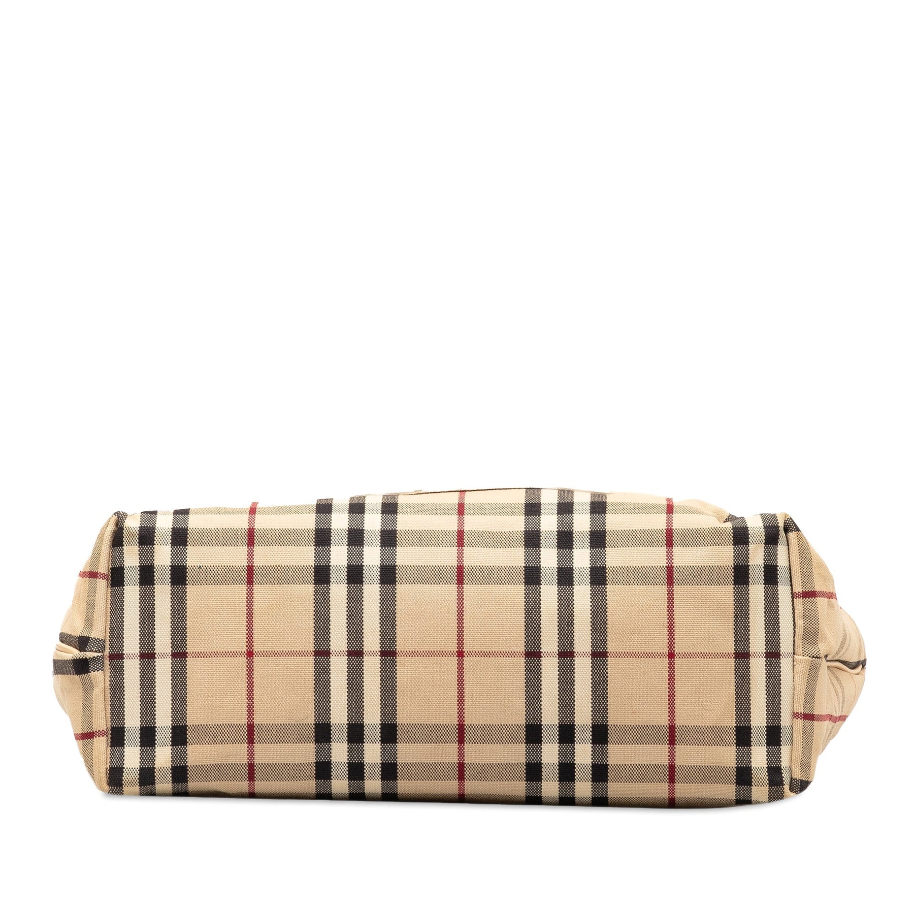 This tote bag features a plaid canvas body with leather trim, flat leather handles, an open top, exterior slip pocket, and interior zip and slip pockets.