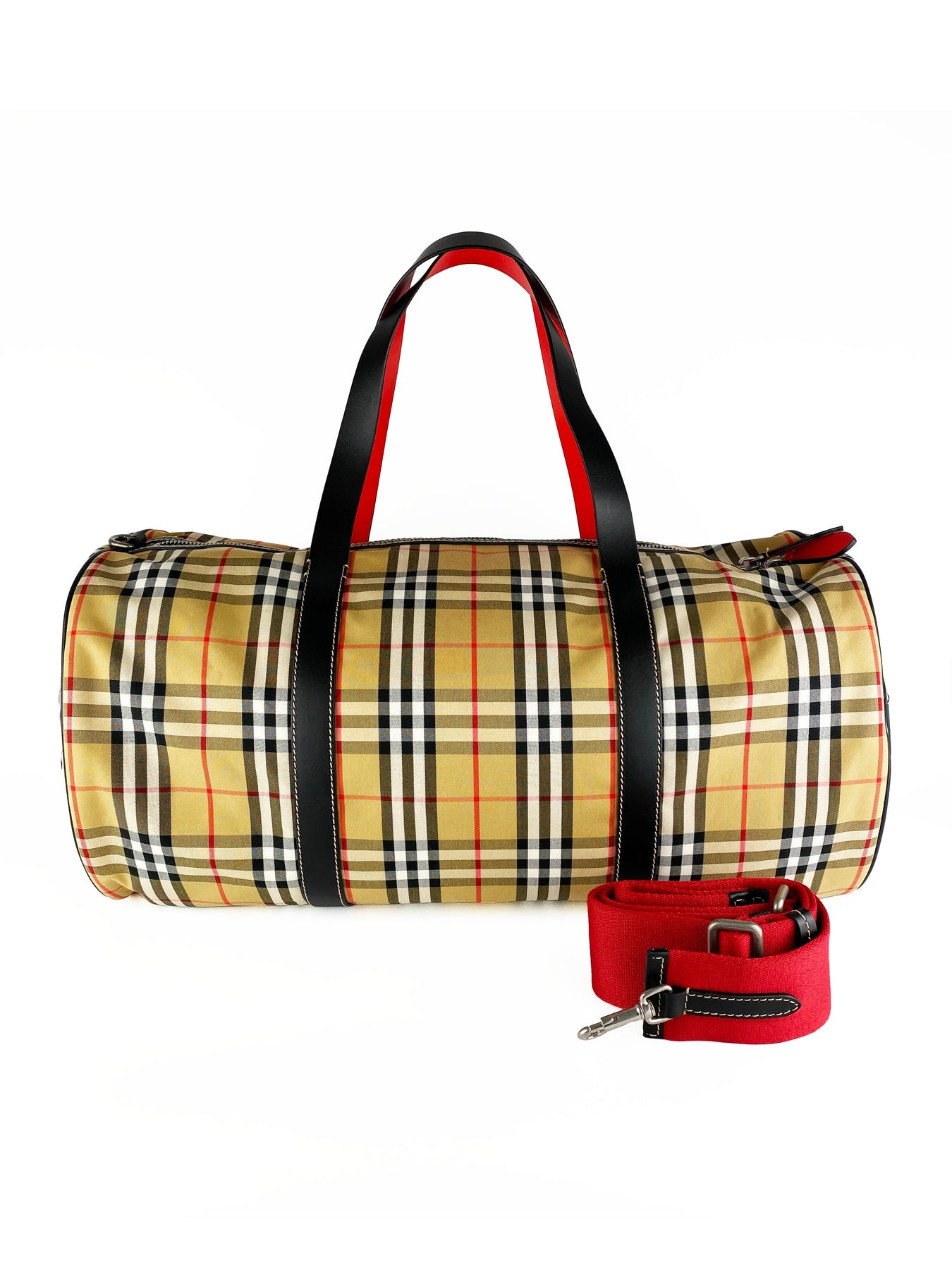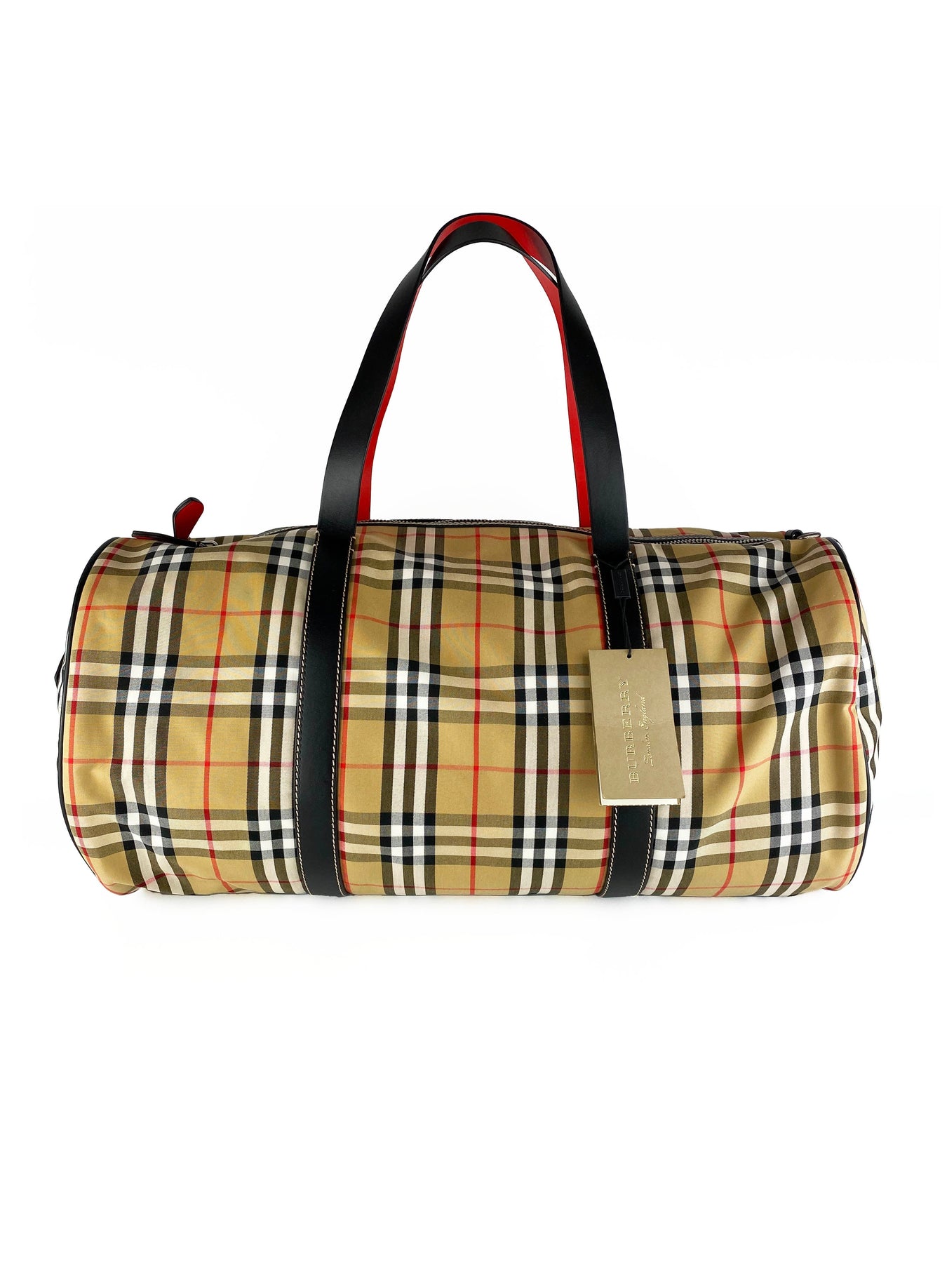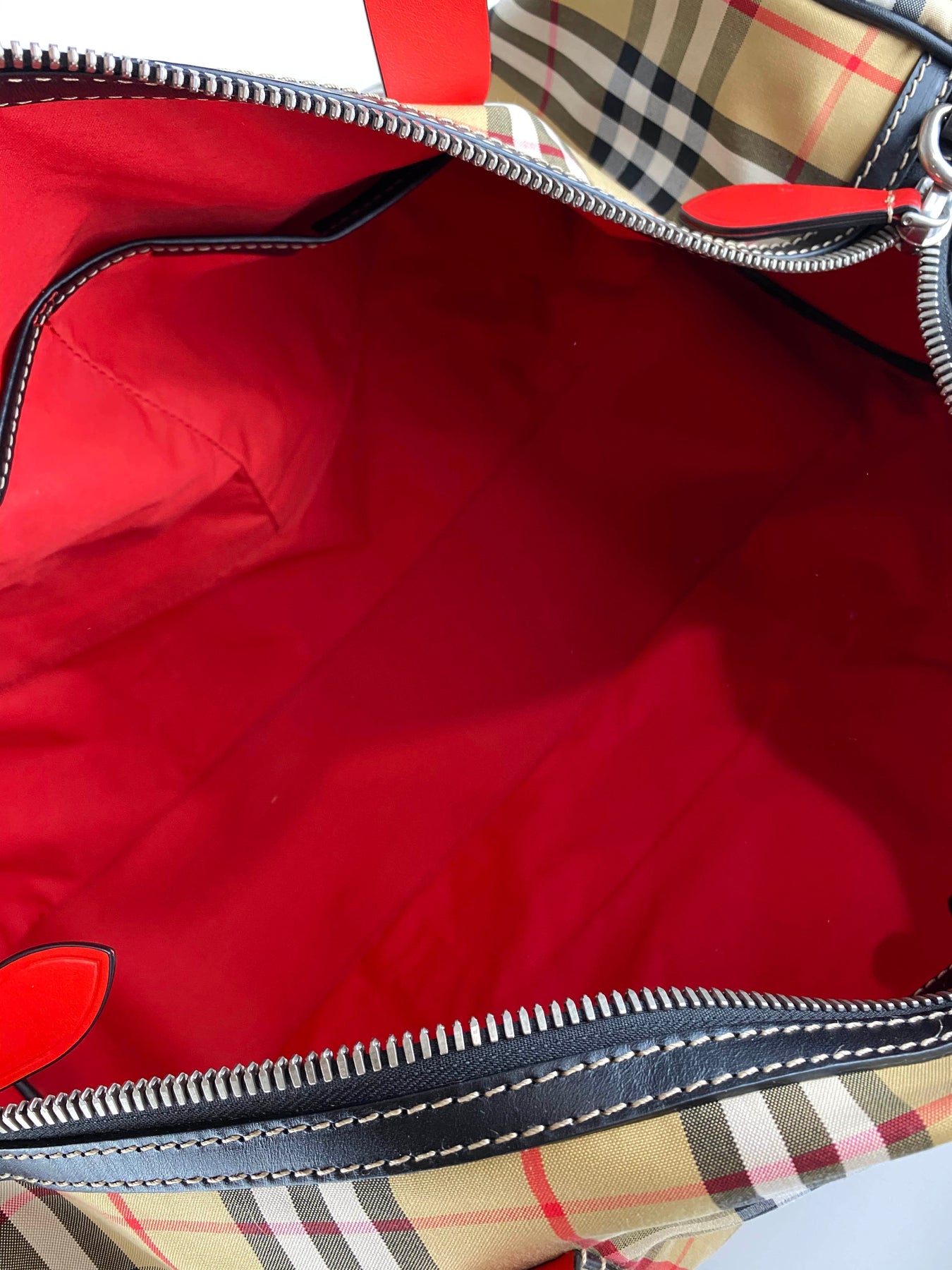 Description : The essential travel bag in signature Burberry haymarket check with bright red zip and handles. In pristine condition; brand new; slight dents at base