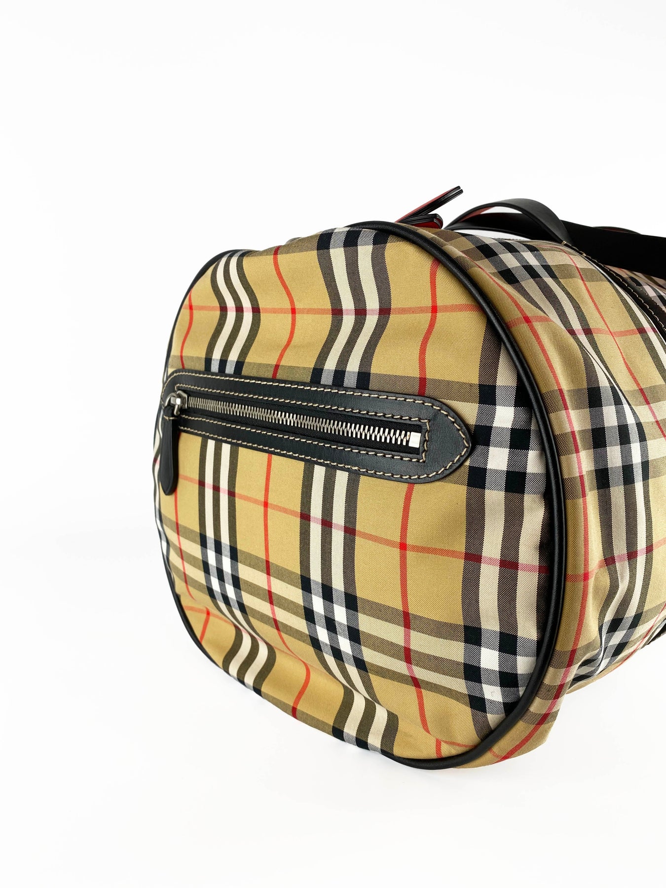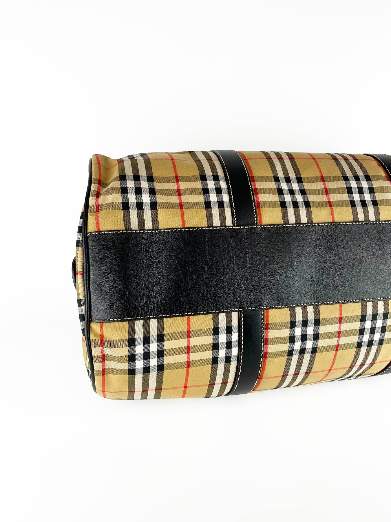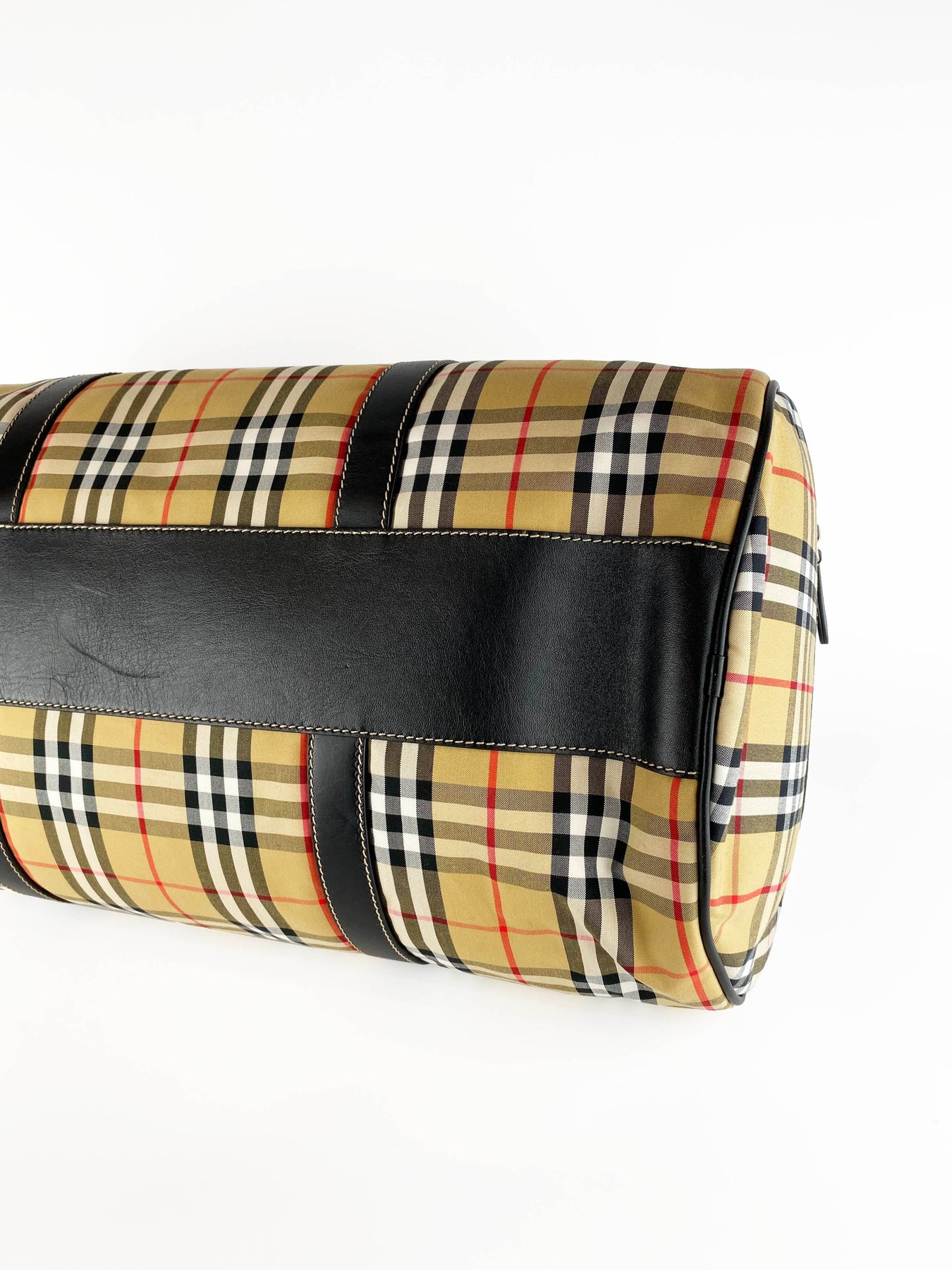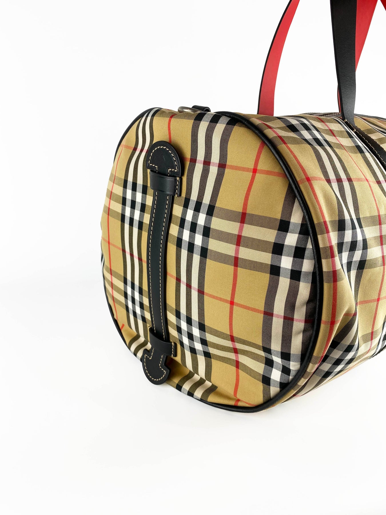 Description : The essential travel bag in signature Burberry haymarket check with bright red zip and handles. In pristine condition; brand new; slight dents at base