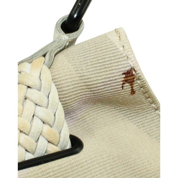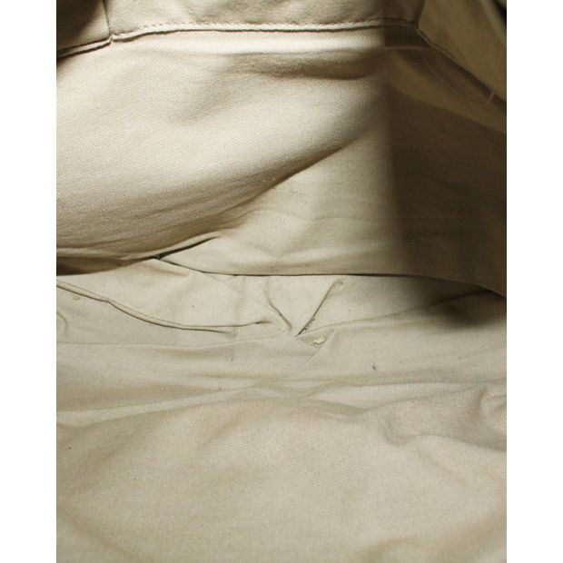 Huge design, spacious interior, very good condition with minimal discolourations visible, one leather top handle, one big brown stain on the farbic next to the top handle.