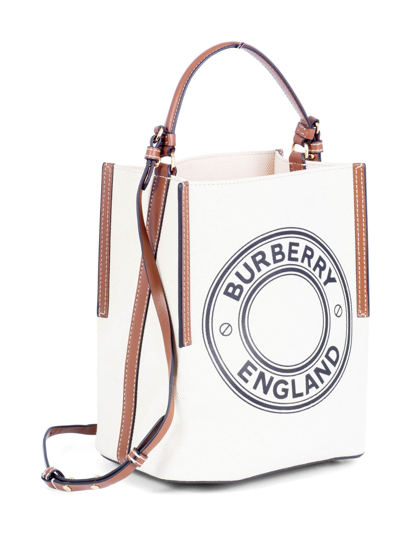 Burberry Logo Bucket Bag or 100 % of your . It is in tan canvas with brown leather trim and gold hardware. It features a frontal Burberry logo, a single top handle and an adjustable shoulder strap.