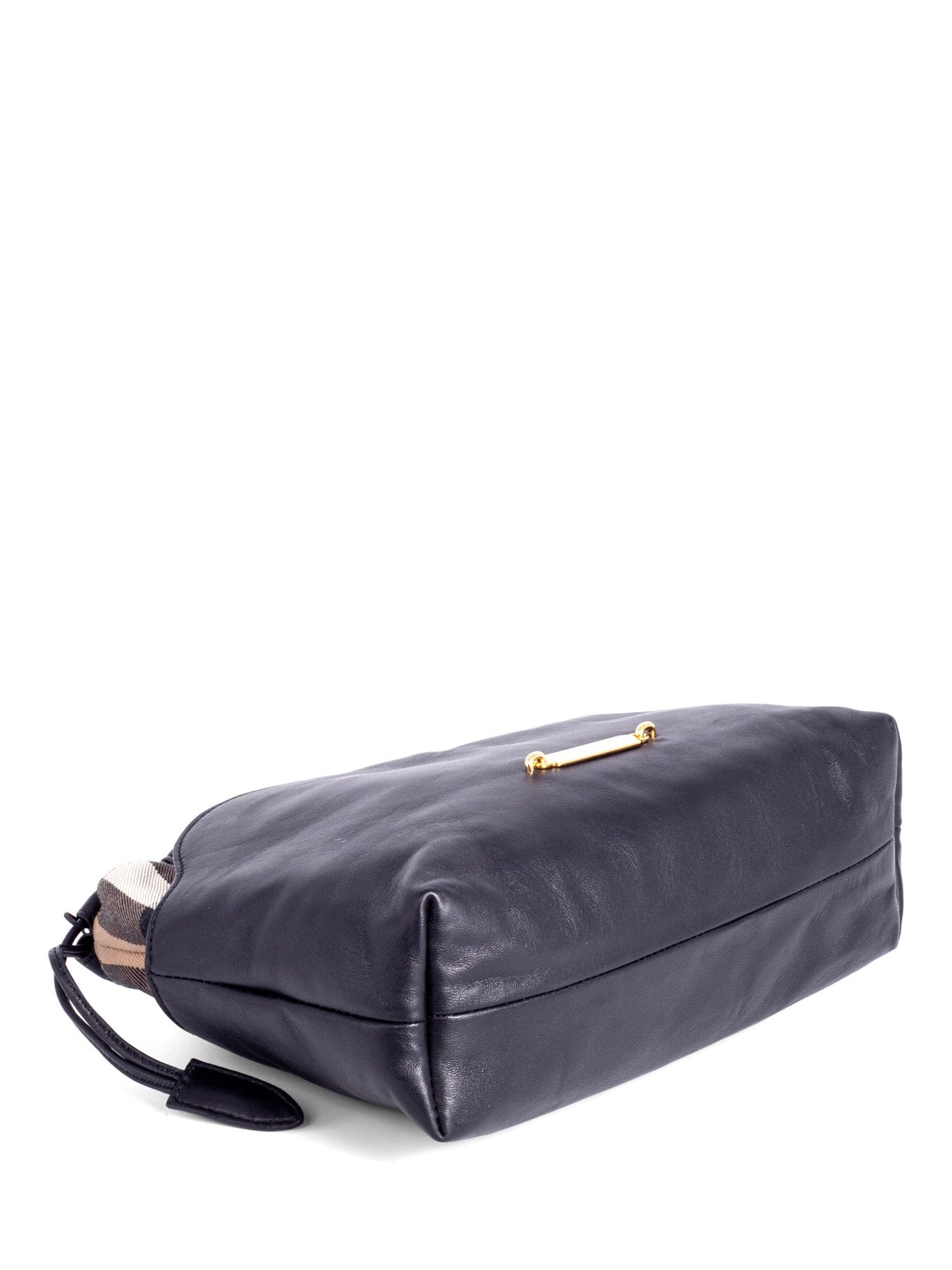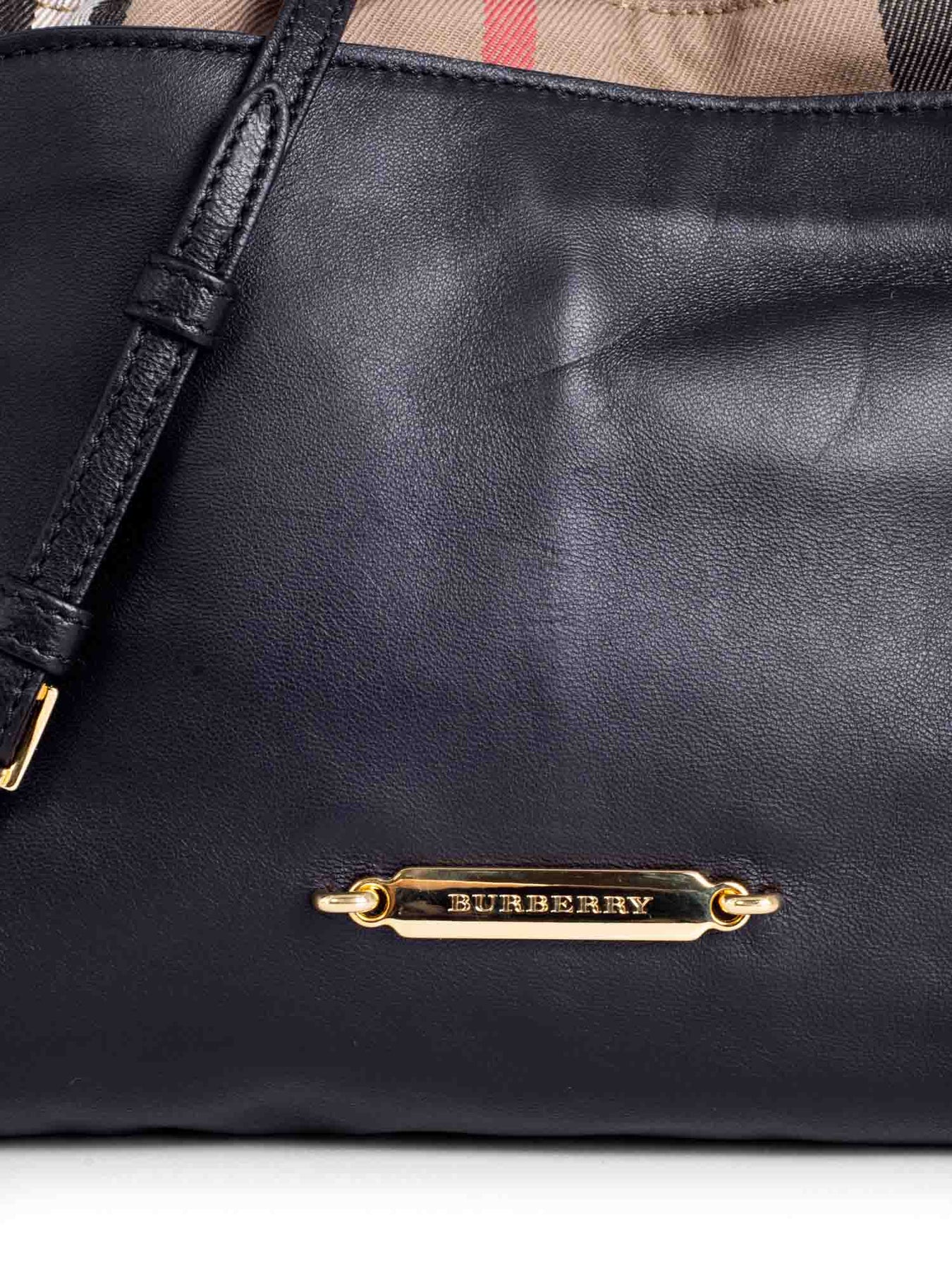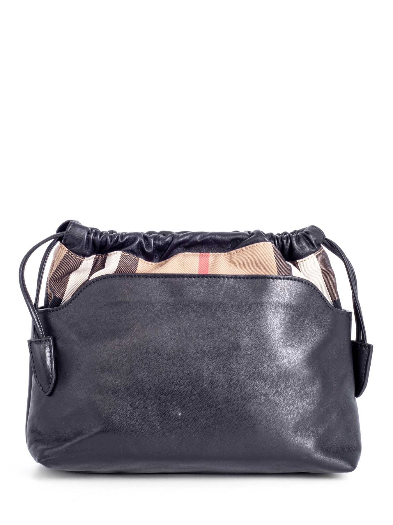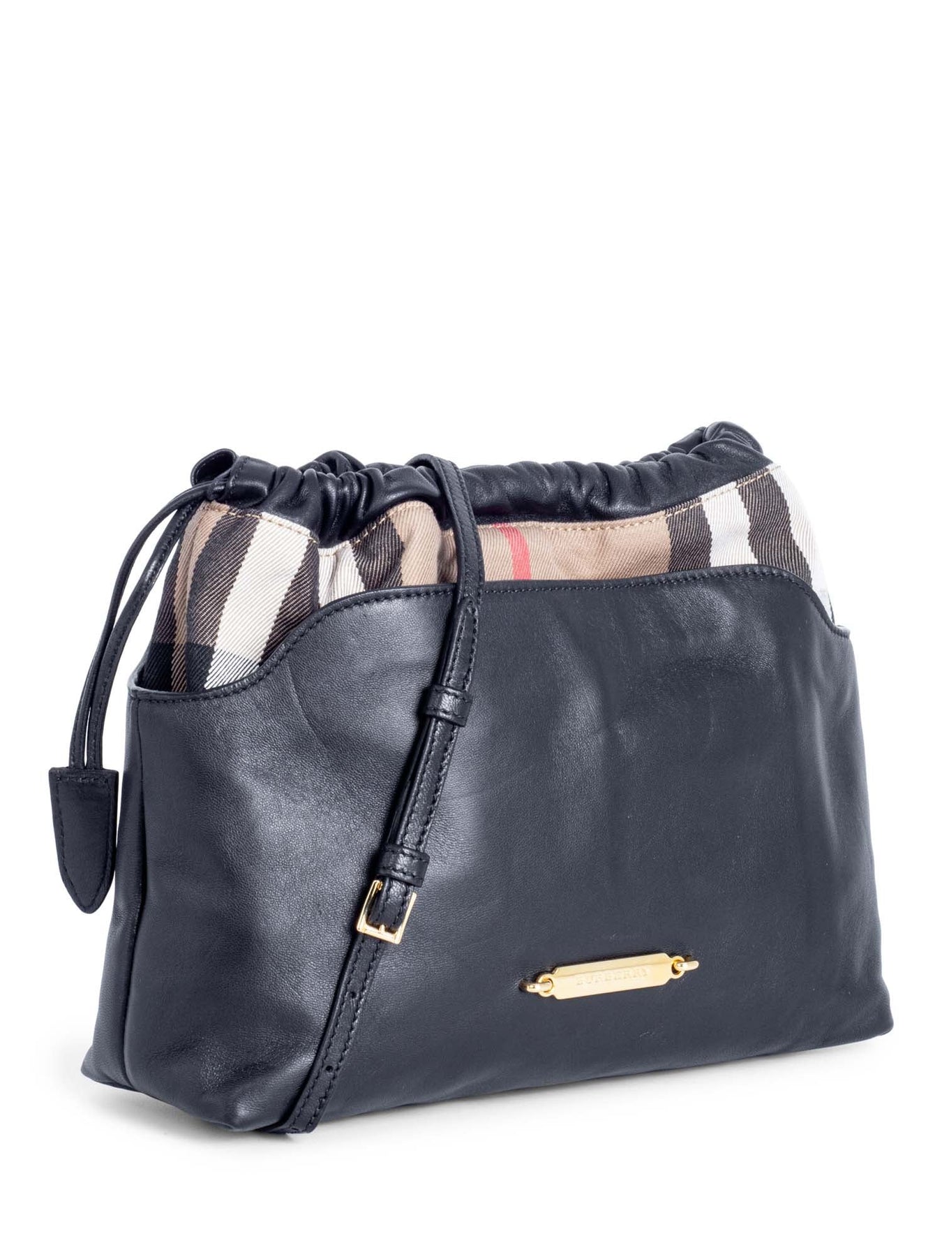 Burberry Bucket Messenger Bag or . This Burberry bag is in black leather with house check print featuring gold hardware, adjustable and detachable leather strap, and black canvas interior. It has a drawstring and snap closure.