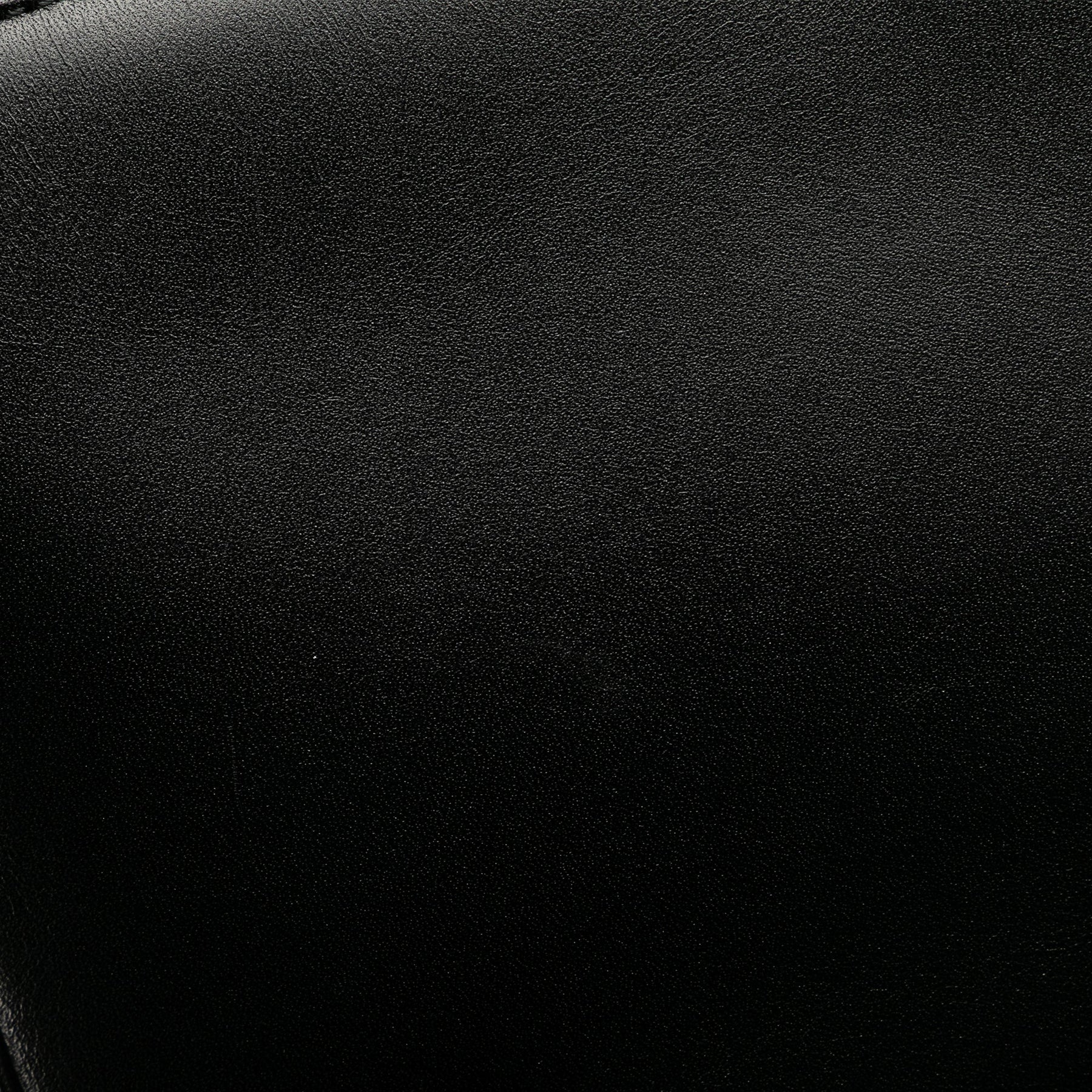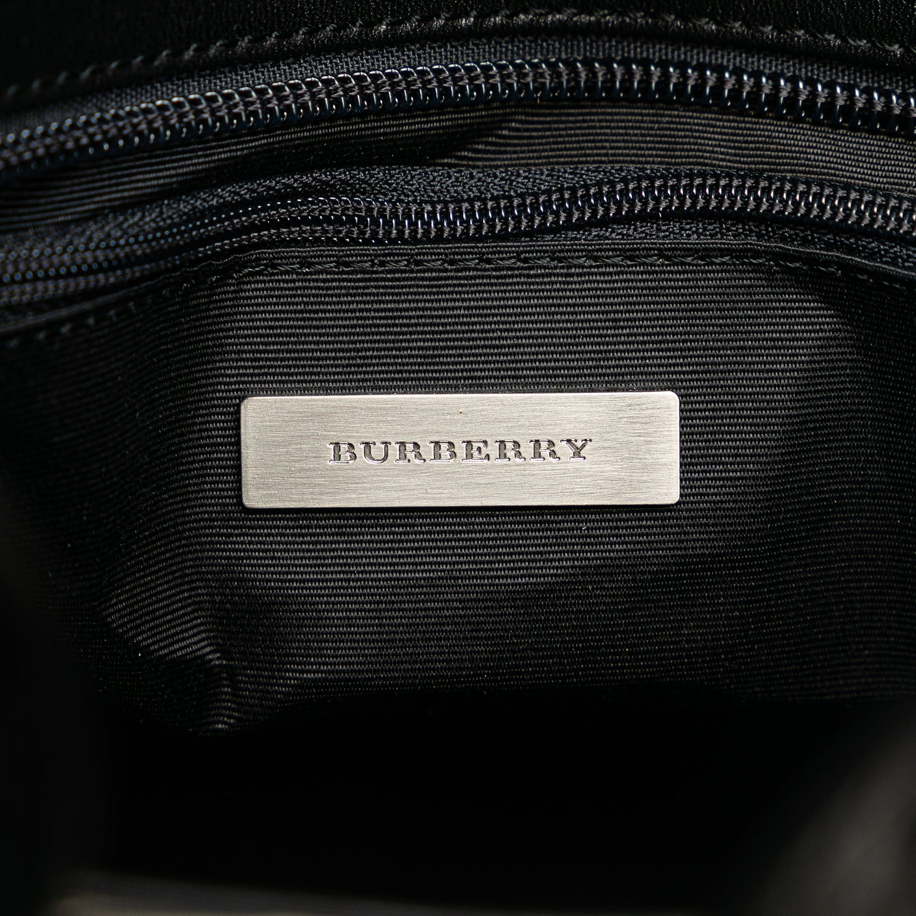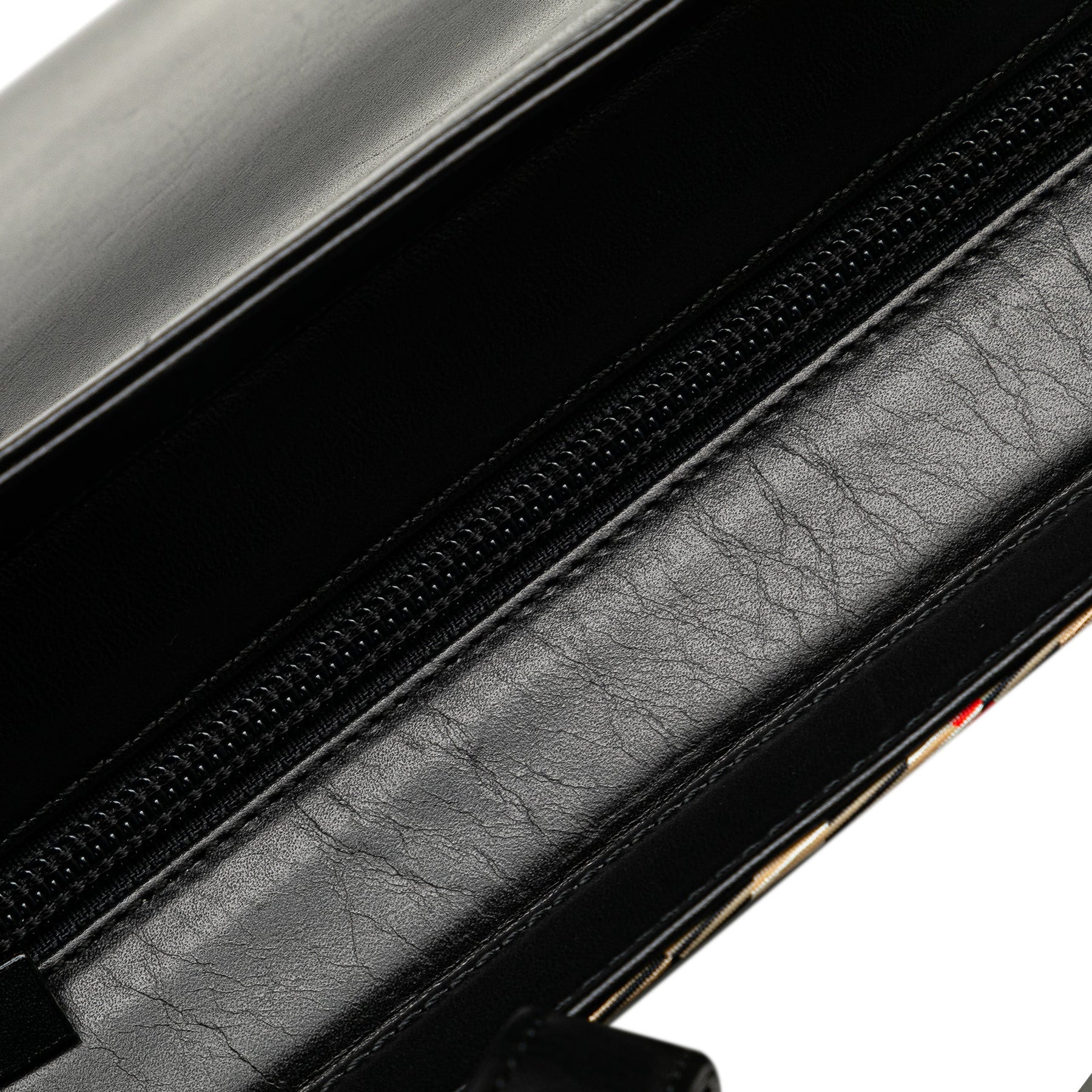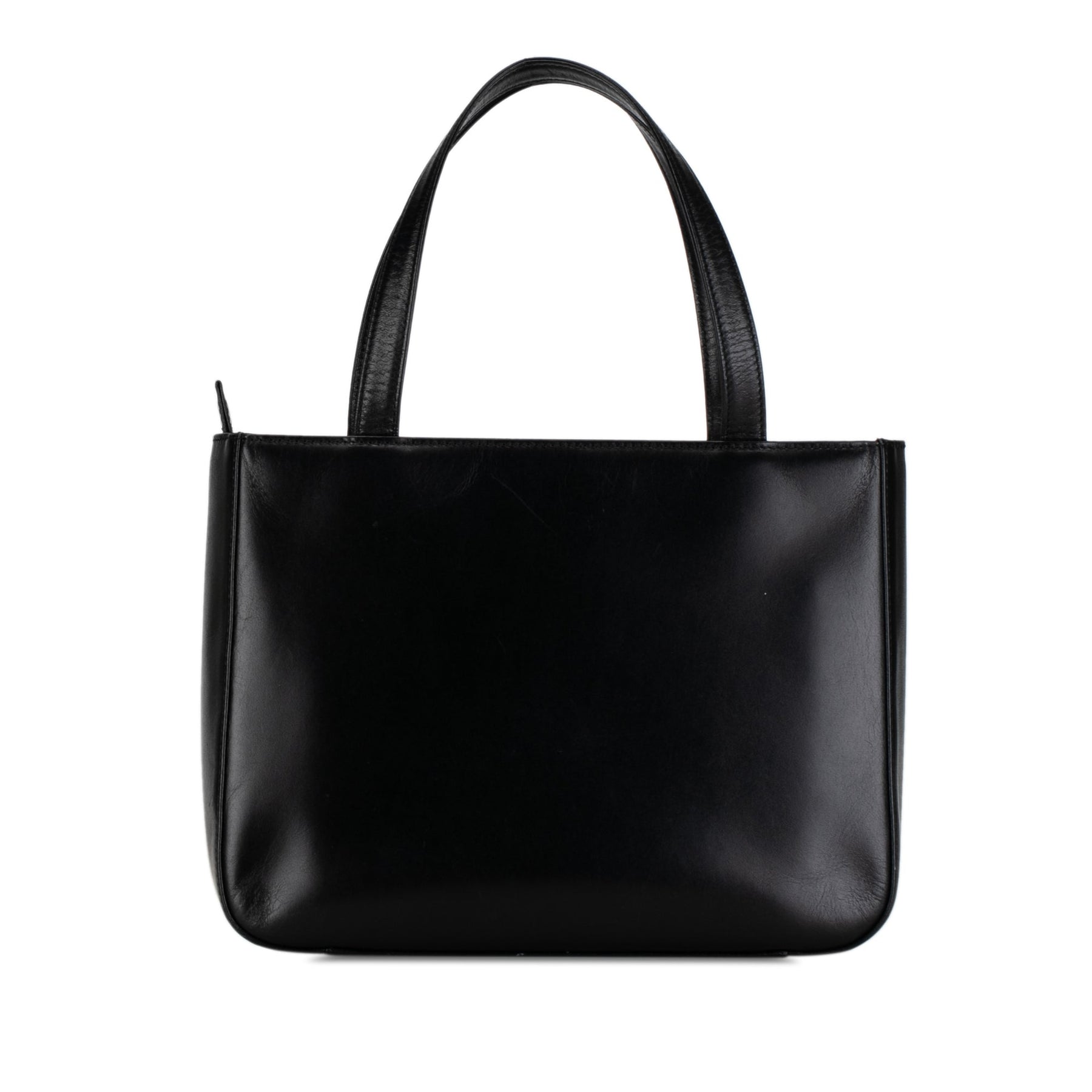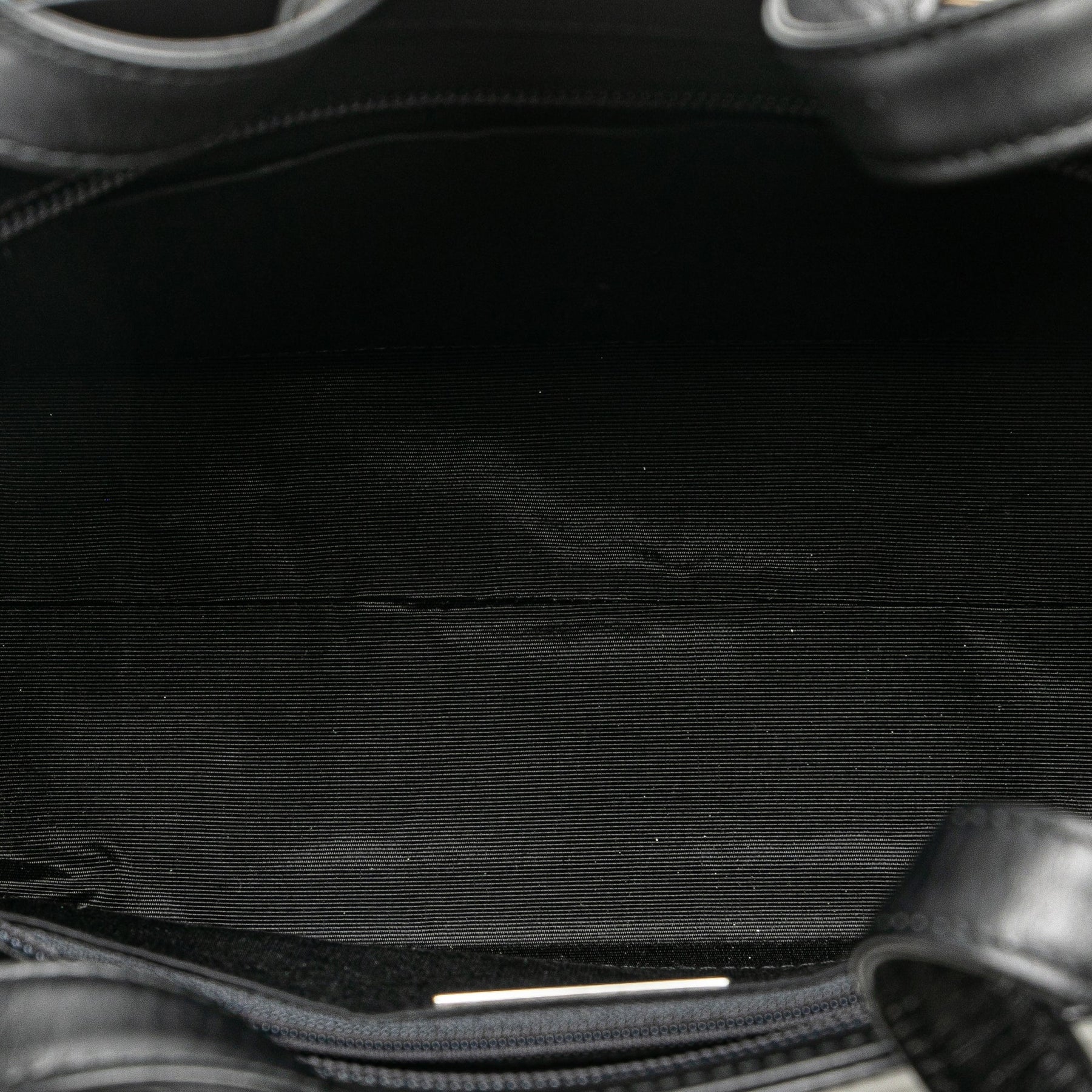This handbag features a leather body with canvas trim, flat leather handles, a top zip closure, and an interior zip pocket.