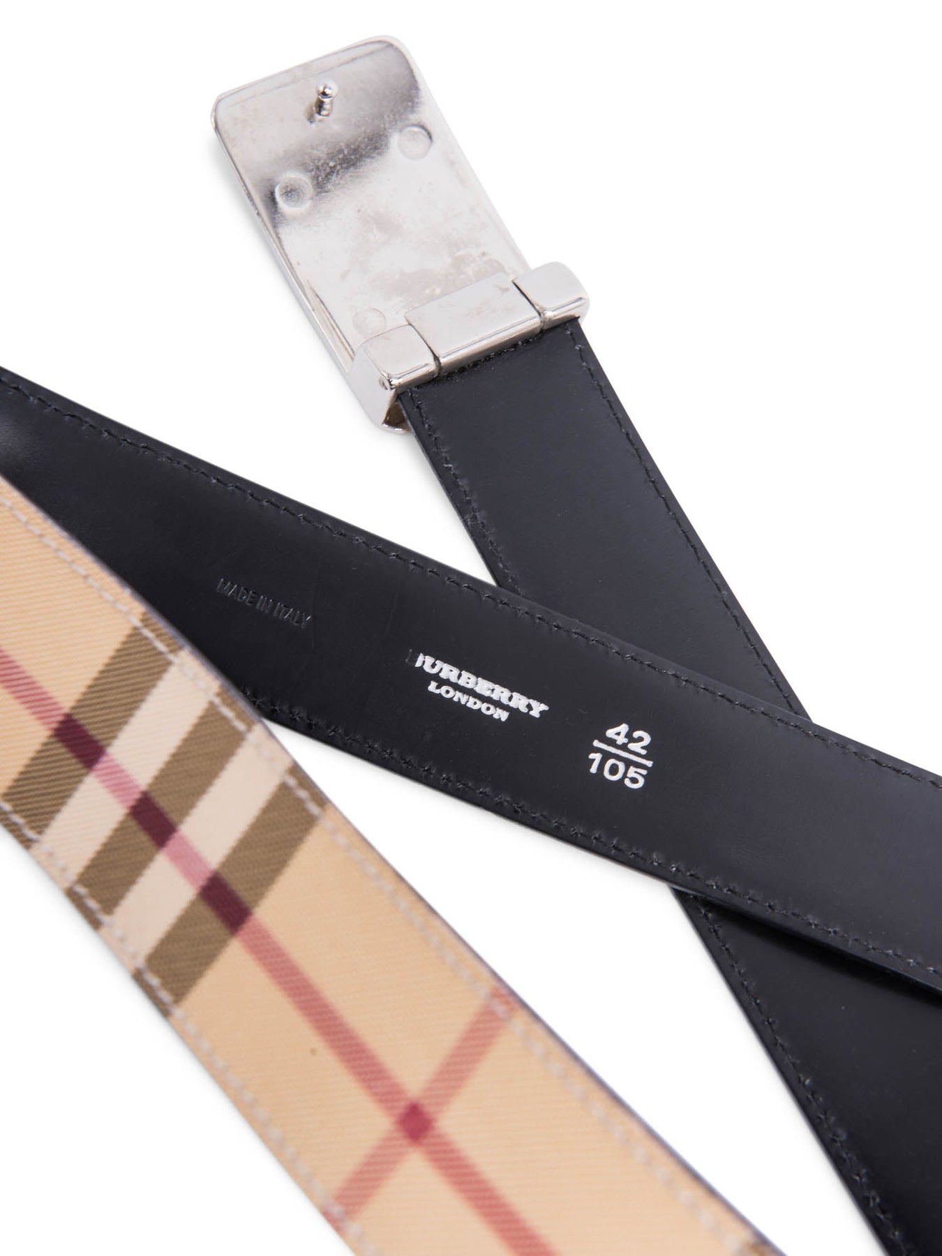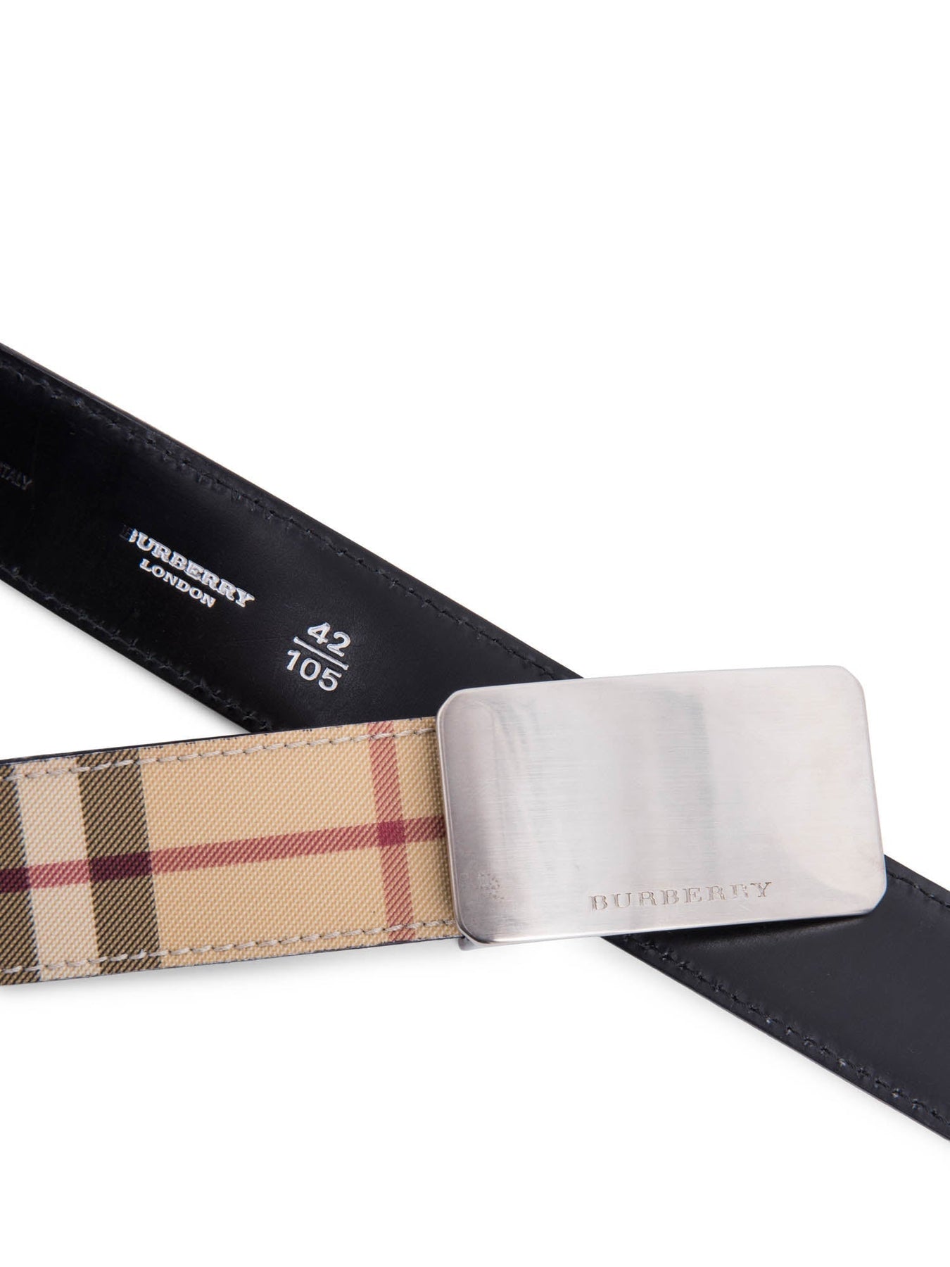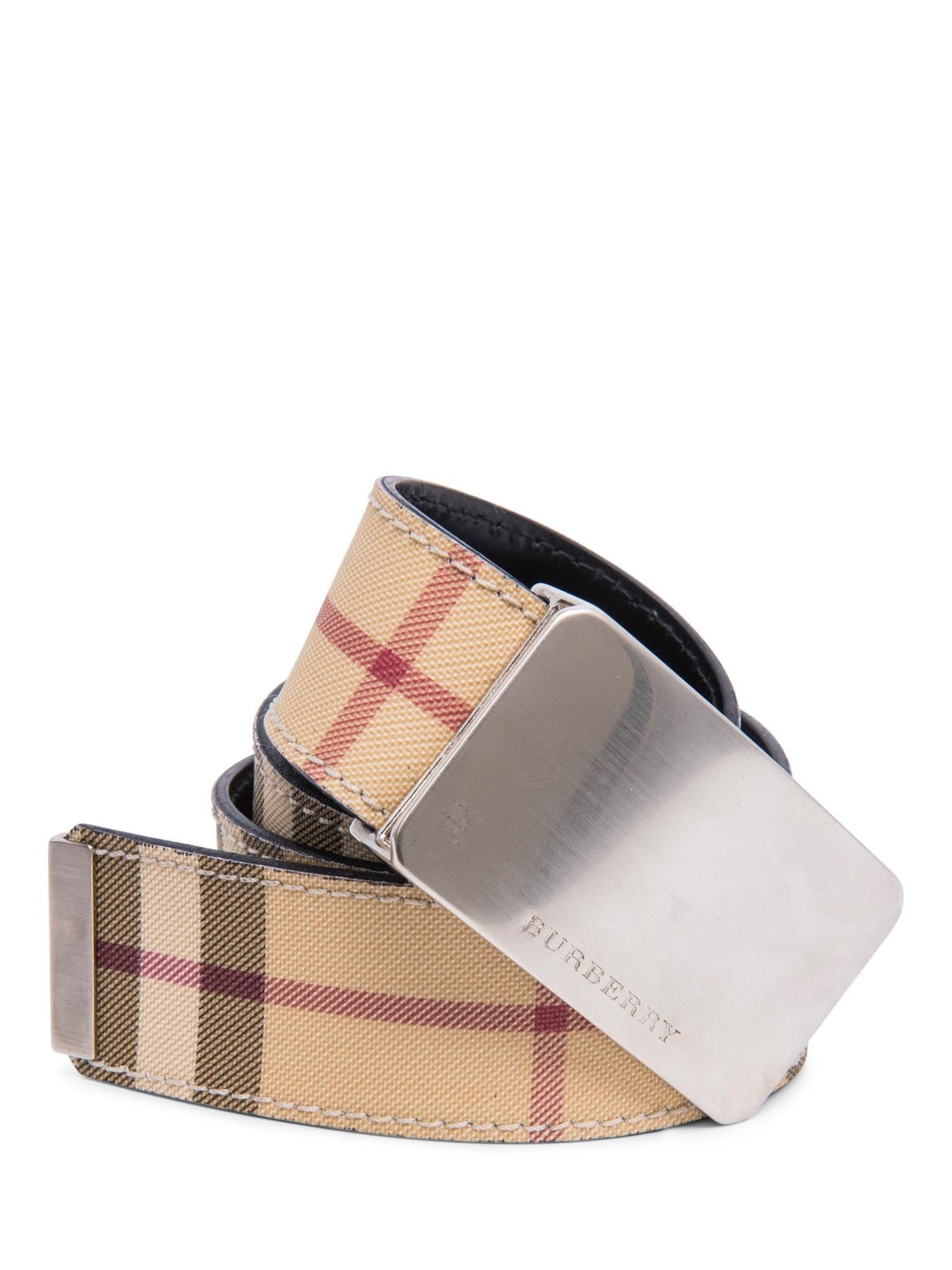 Burberry House Check Belt or . This Burberry belt is crafted in signature House check canvas with black leather accents and silver tone hardware. The buckle showcases a brushed finish with the Burberry logo and the strap features five holes to adjust the fit.