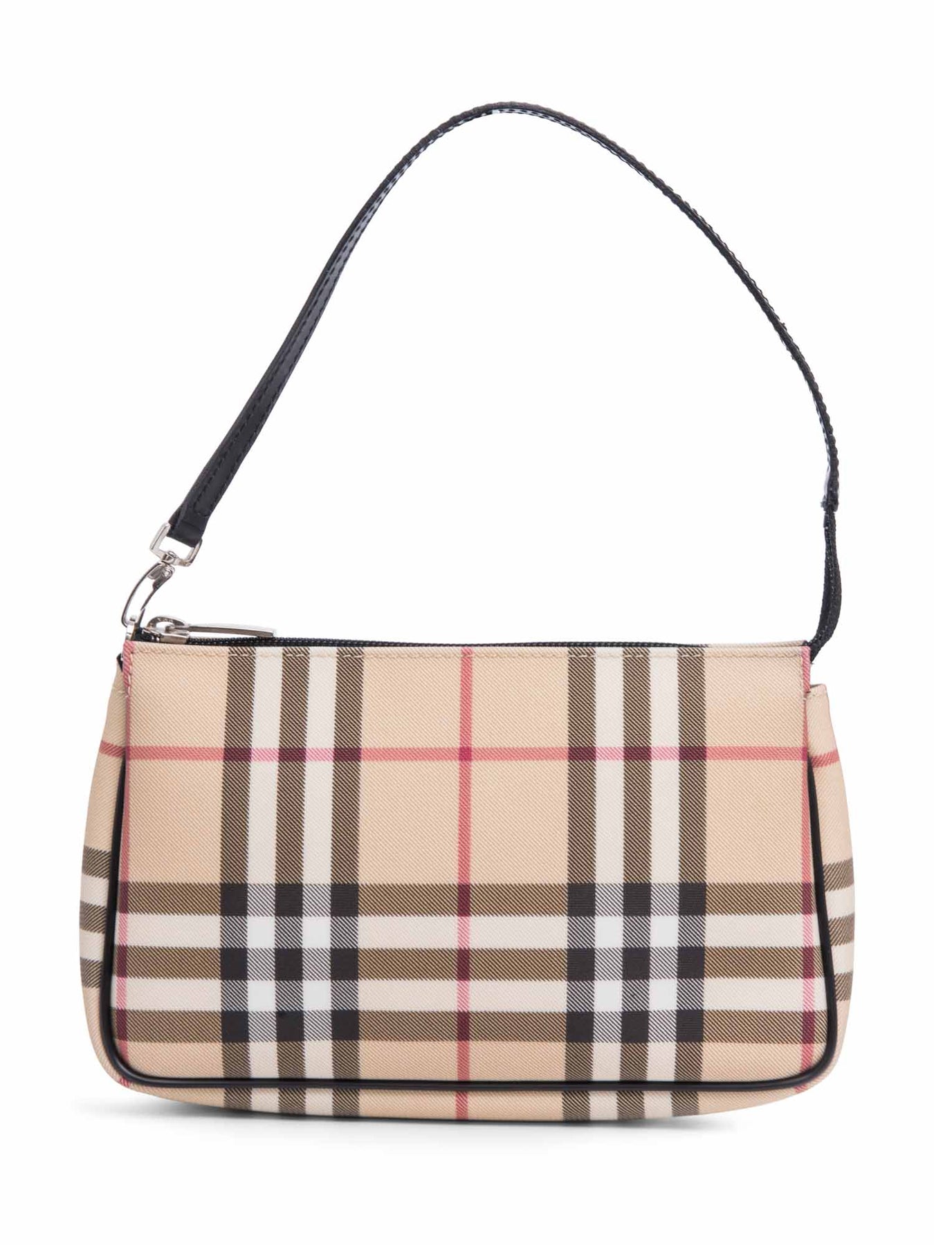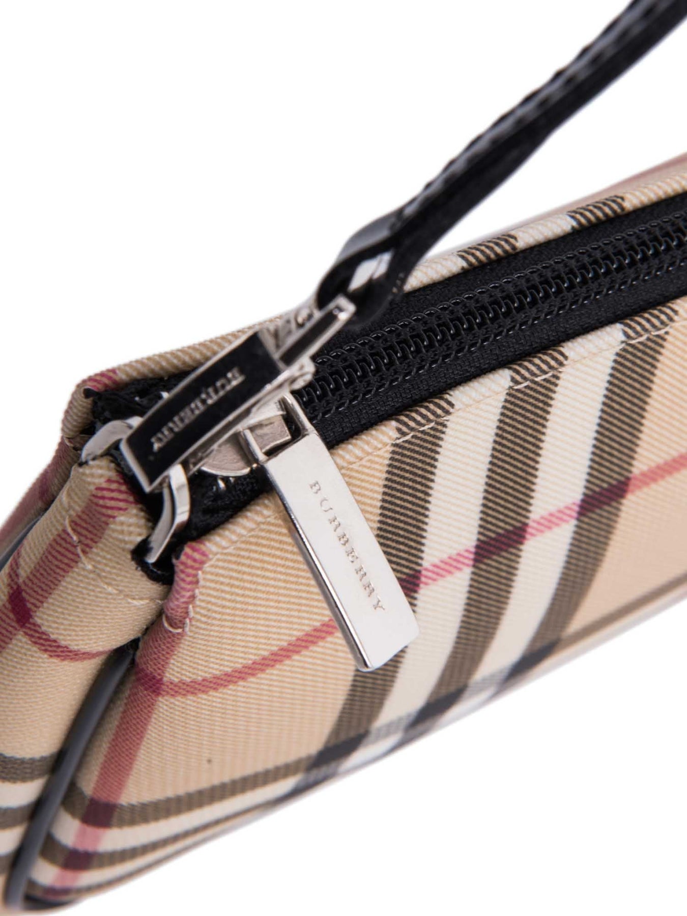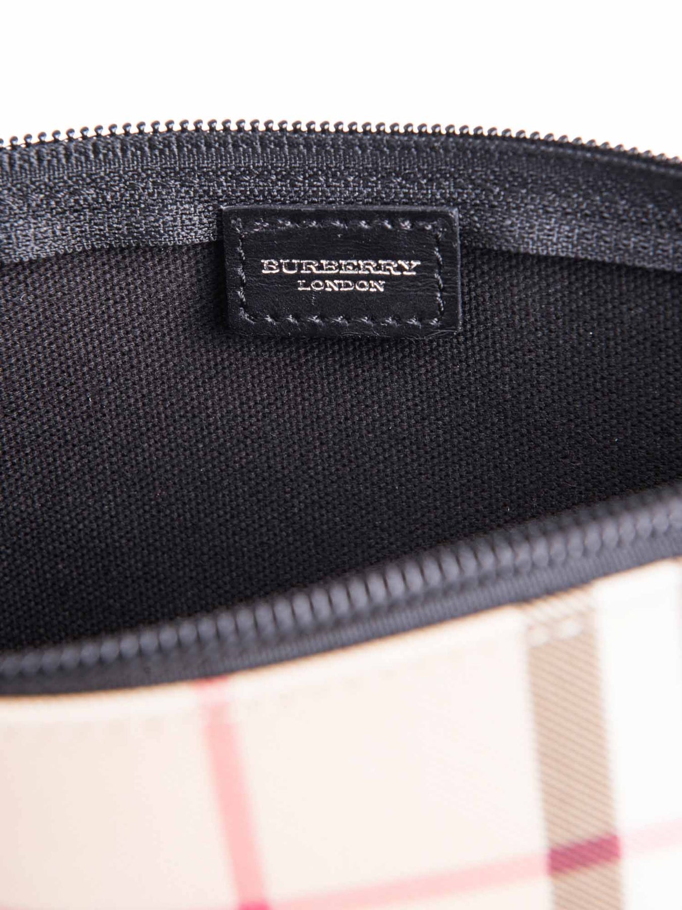 Burberry House Check Pochette Bag or . This Burberry bag is crafted in signature House check canvas with black leather accents and silver tone hardware. This bag features a magnetic buckle closure and a black canvas lined interior with one zipper pocket.