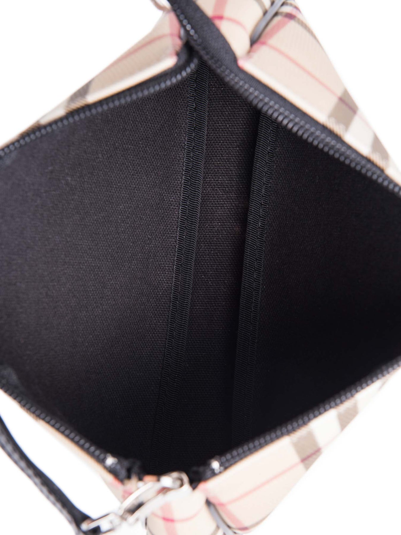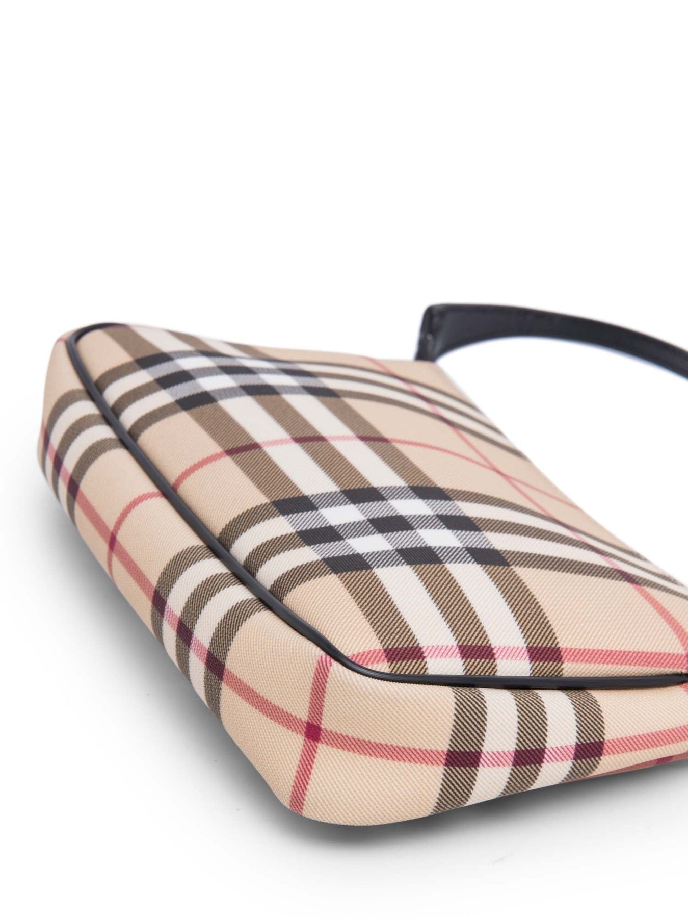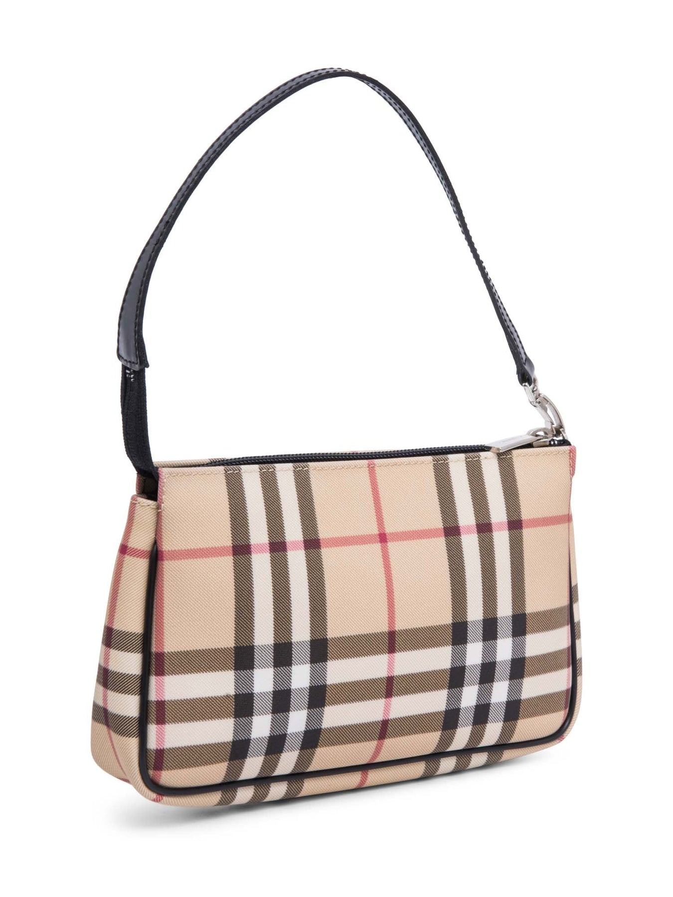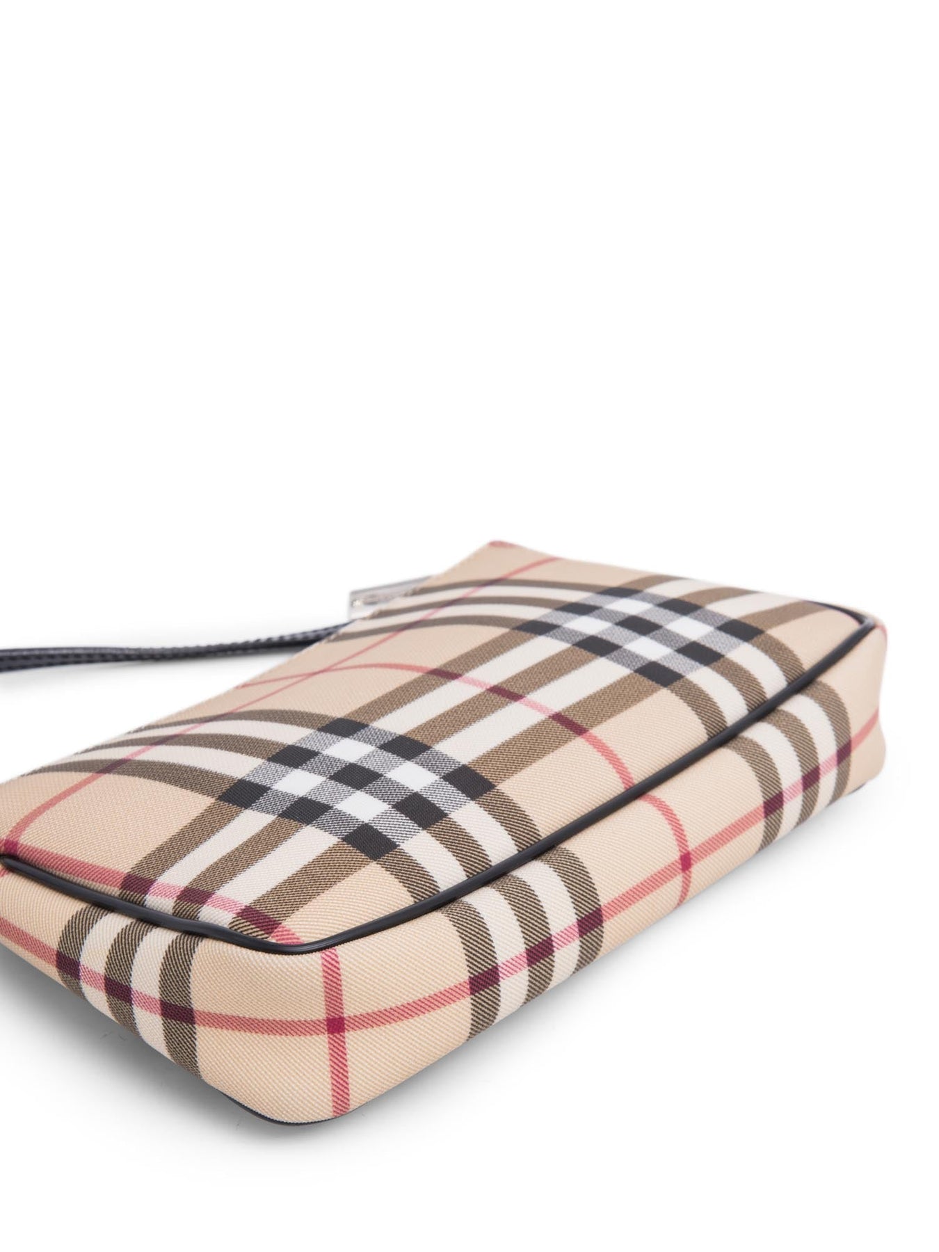 Burberry House Check Pochette Bag or . This Burberry bag is crafted in signature House check canvas with black leather accents and silver tone hardware. This bag features a magnetic buckle closure and a black canvas lined interior with one zipper pocket.
