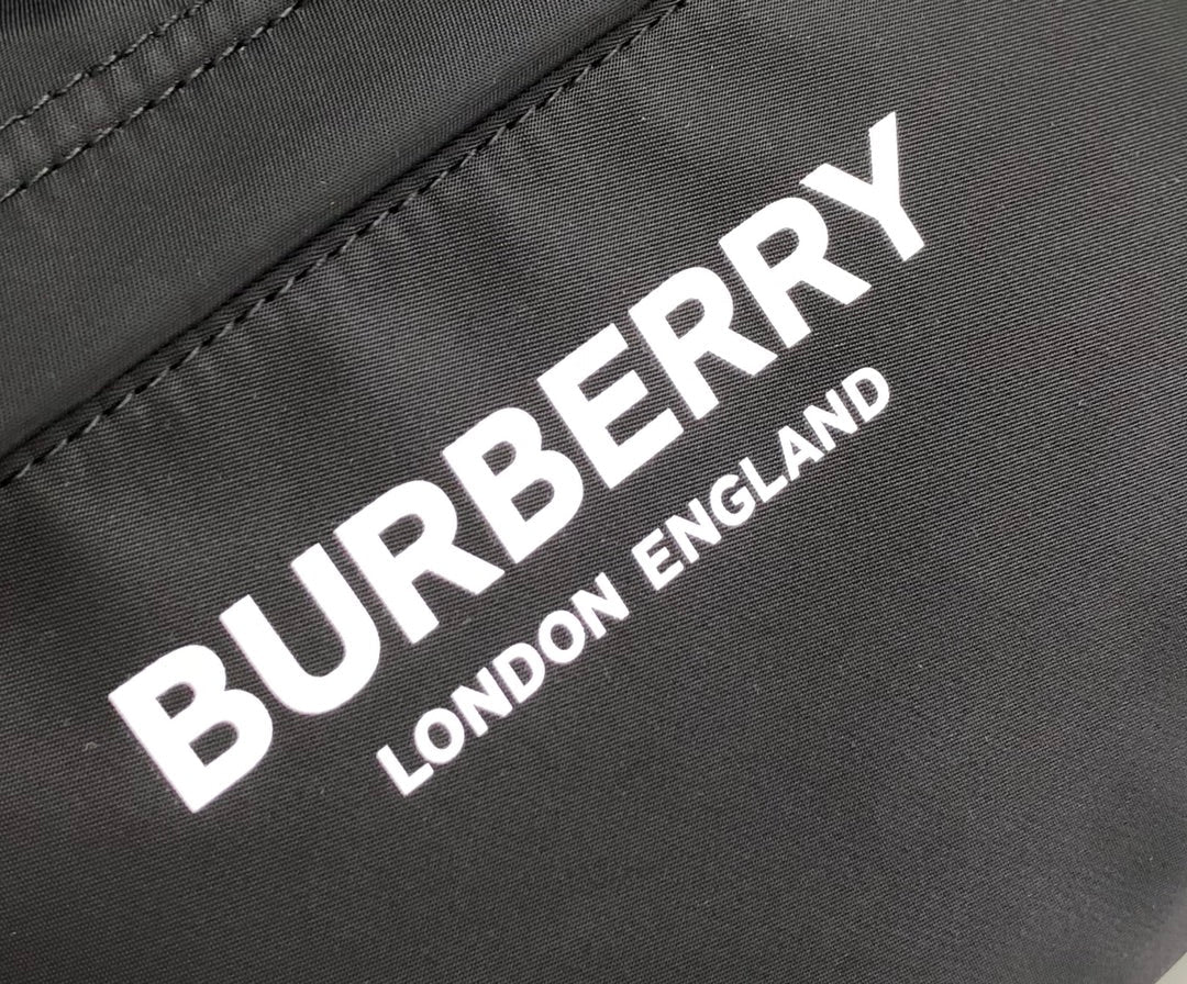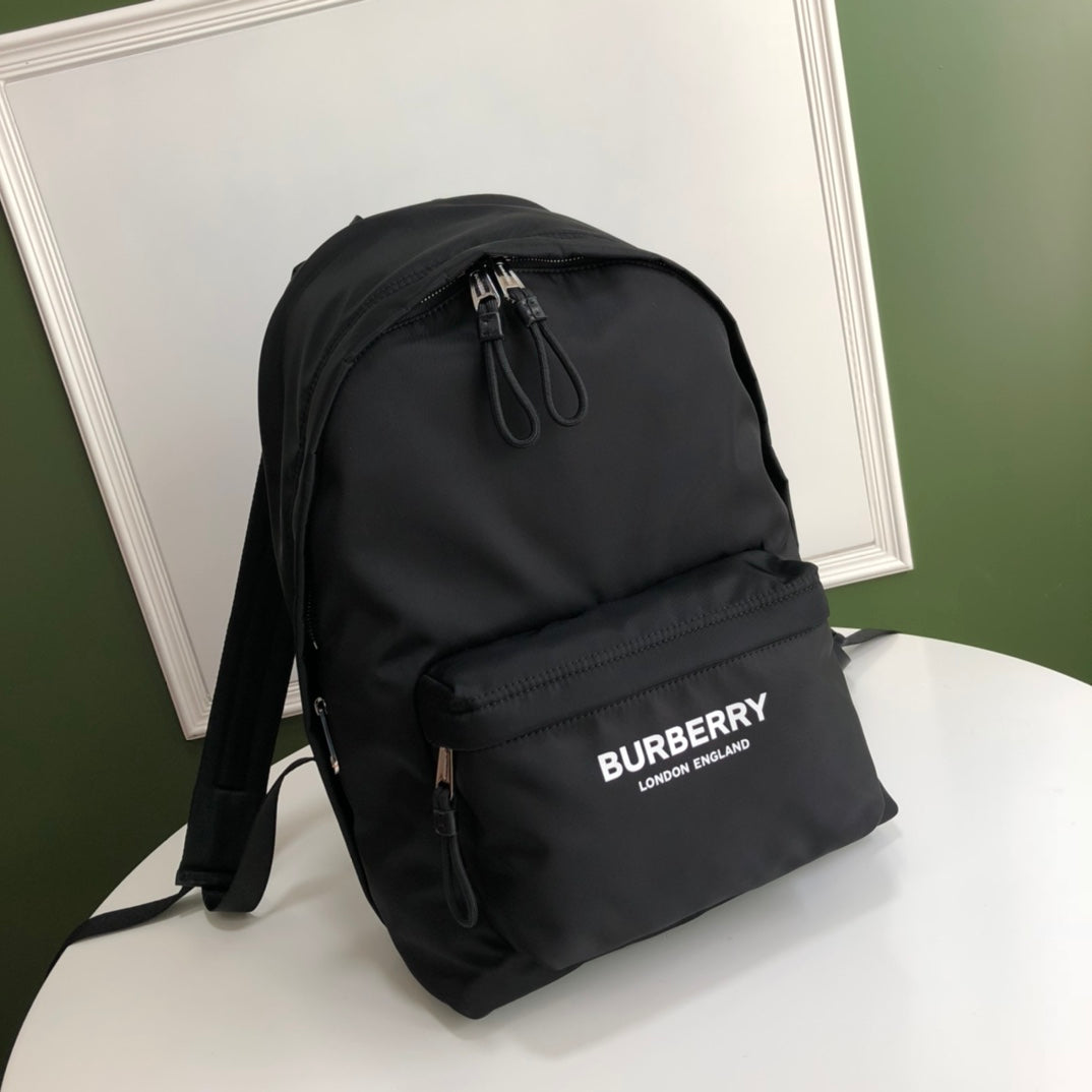 - A backpack reworked in logo-tagged ECONYL® – a sustainable nylon yarn made from regenerated fishing nets, fabric scraps and industrial plastic – featuring smooth leather trims and jacquard-woven Burberry lettering at the shoulder straps.