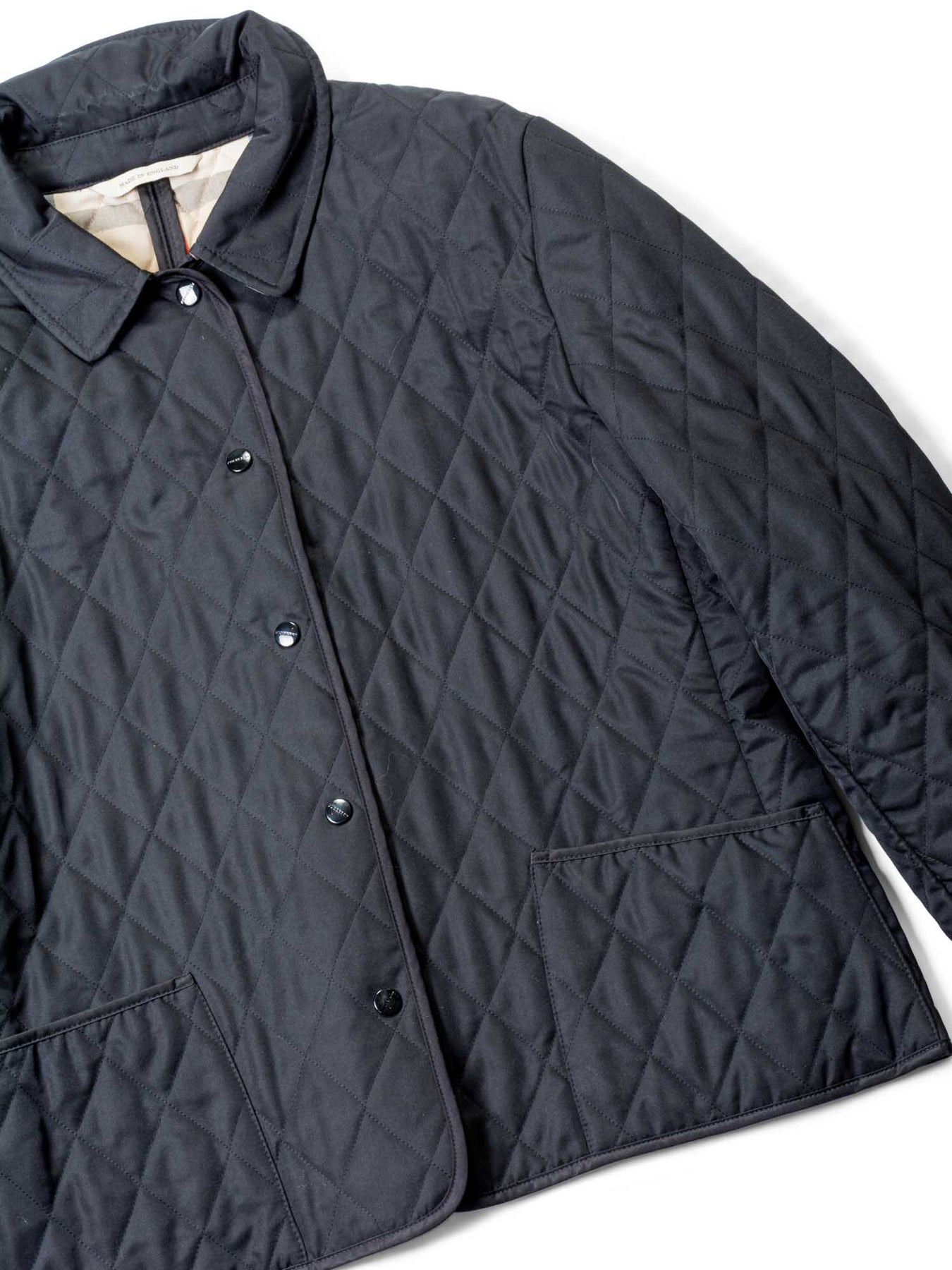 Burberry Quilted Jacket or . This Burberry jacket is in a quilted black fabric with beige nova check lining, featuring two front pockets, adjustable cuff buckles, and front Burberry button closure.