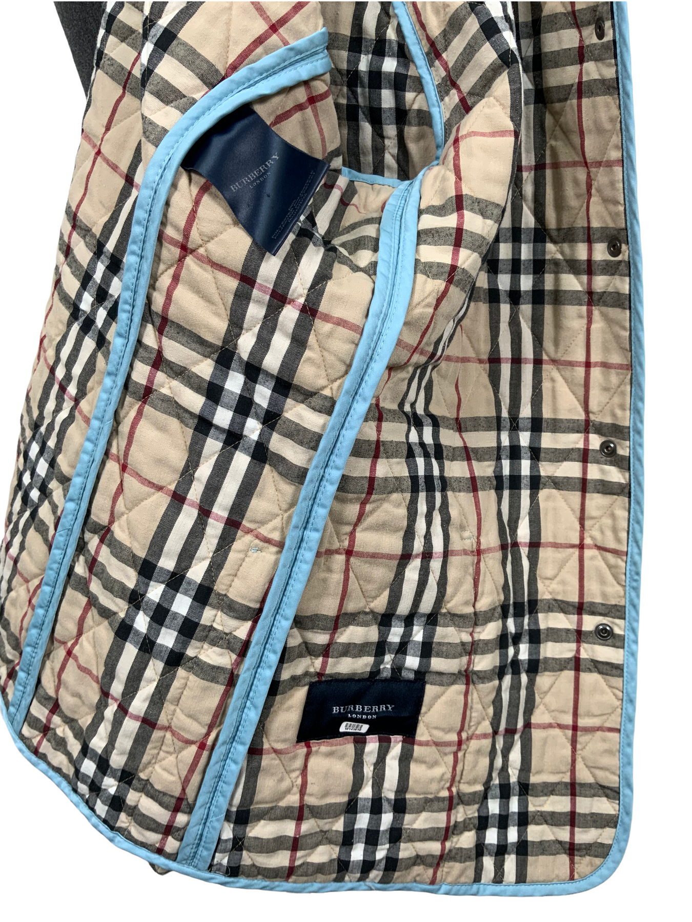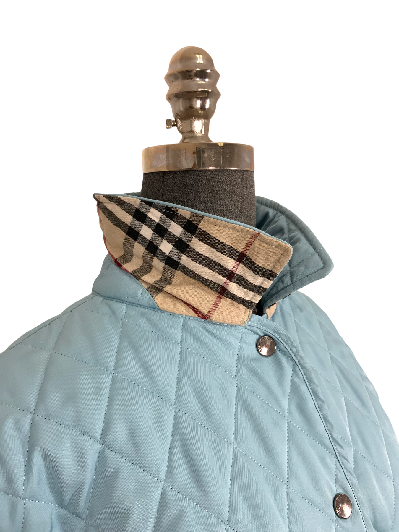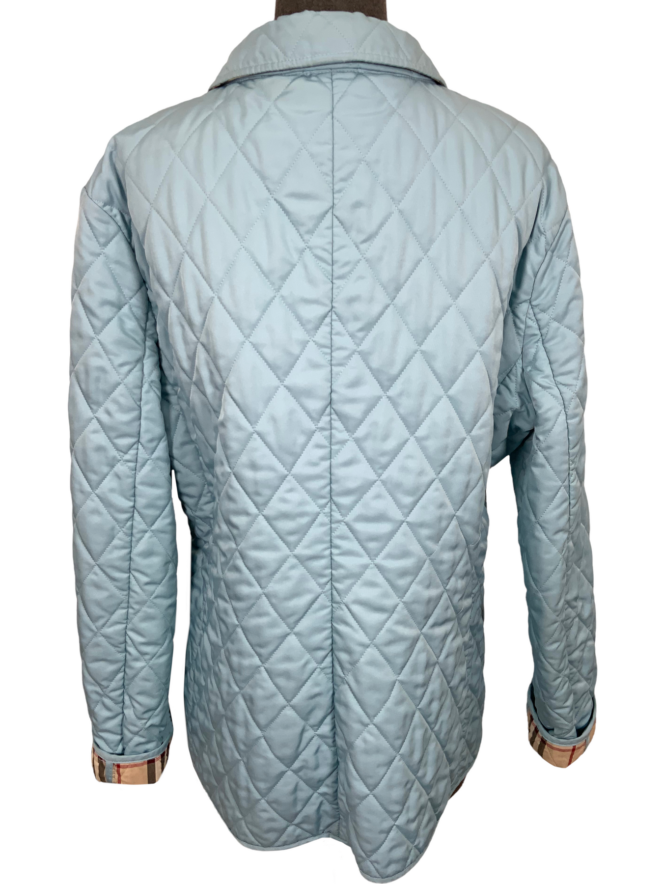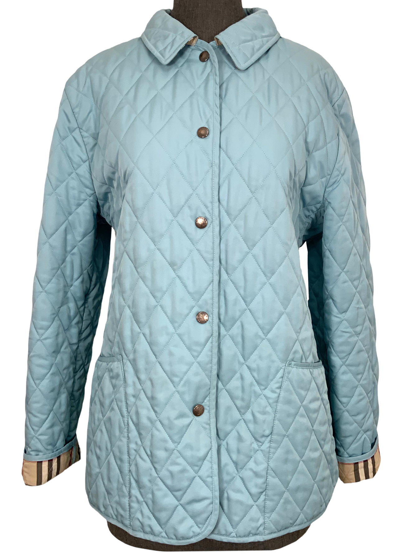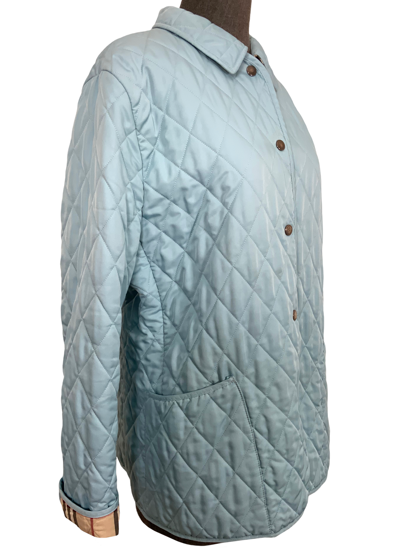 We the ity of this Burberry London Diamond Quilted Jacket Size M in light blue featuring a trim fit with long sleeves, dual slip pockets, front snap closures and classic checkered lining.