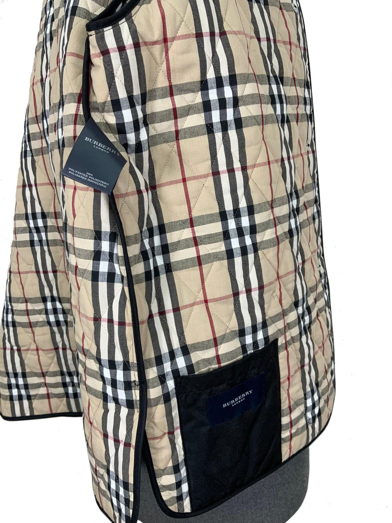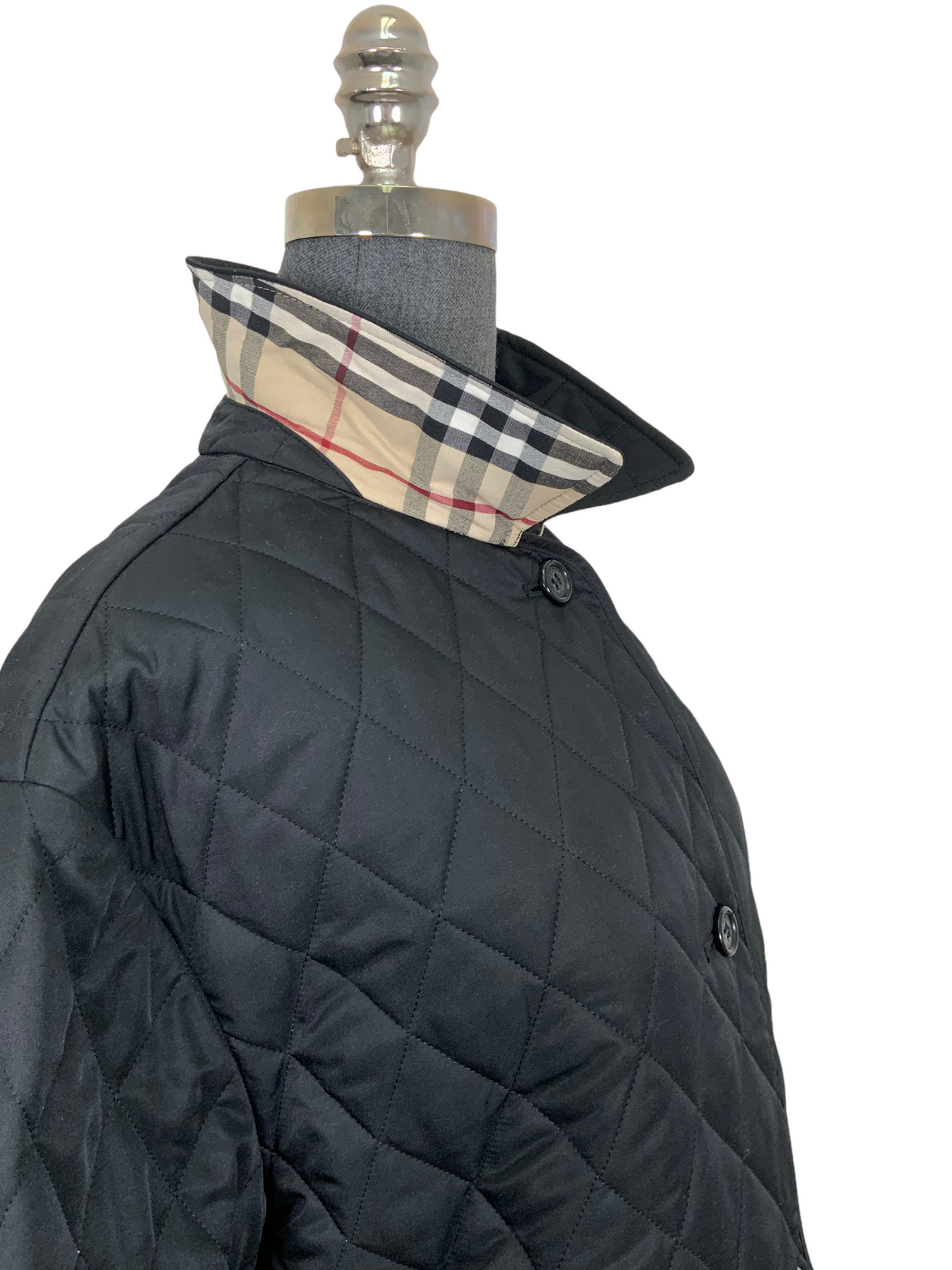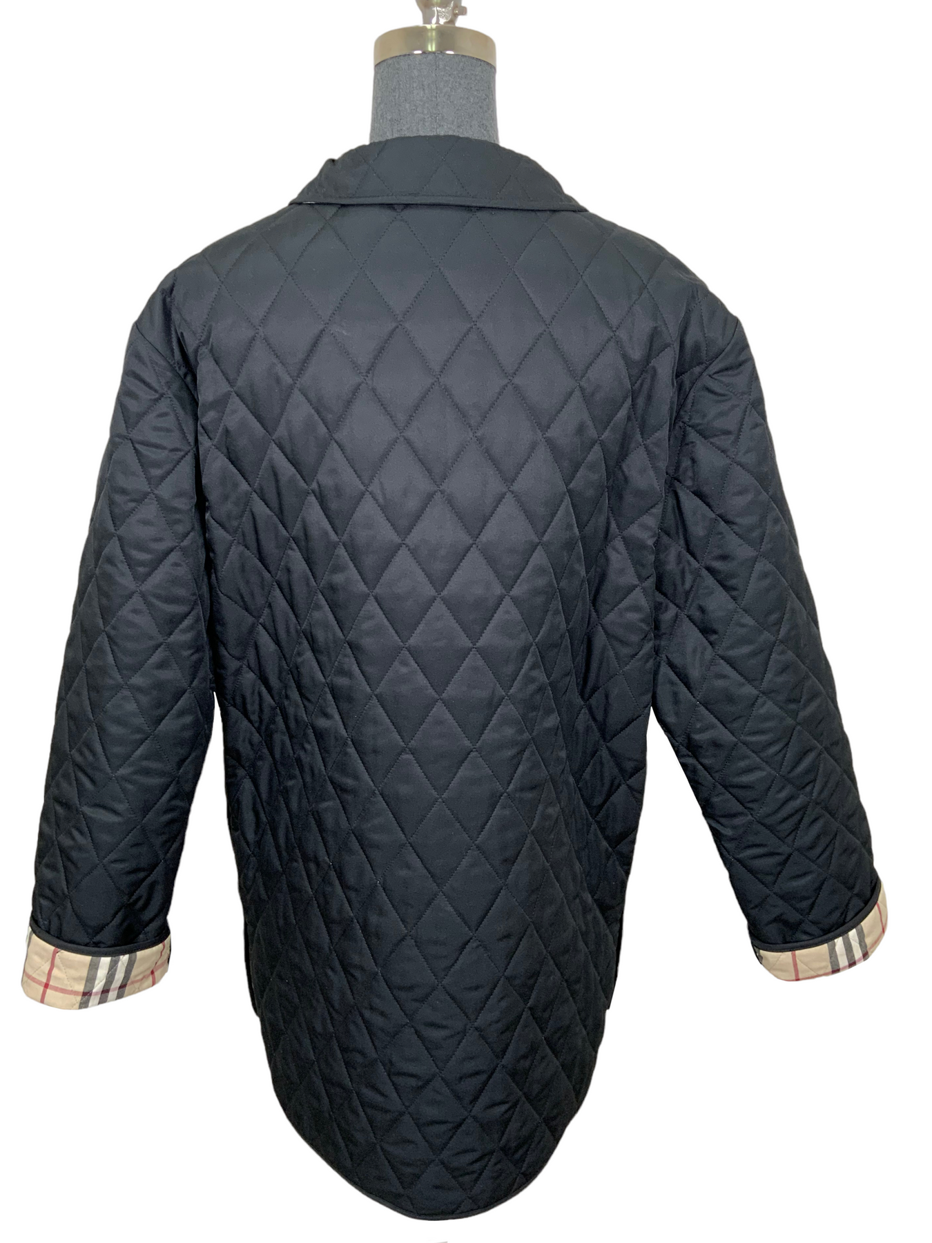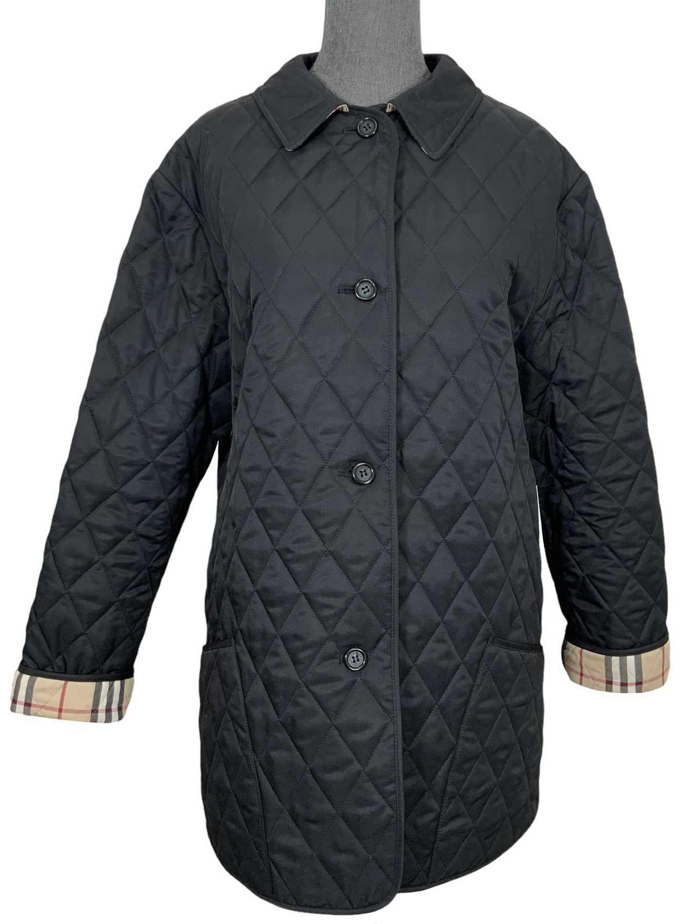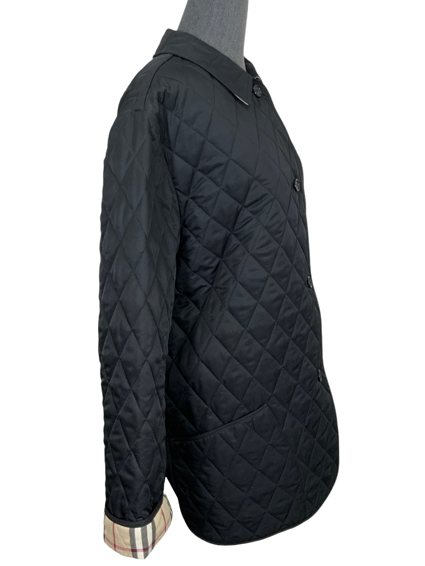 We the ity of this Burberry London Diamond Quilted Jacket Size M featuring a trim fit with long sleeves, dual slip pockets, front button closures and classic checkered lining.