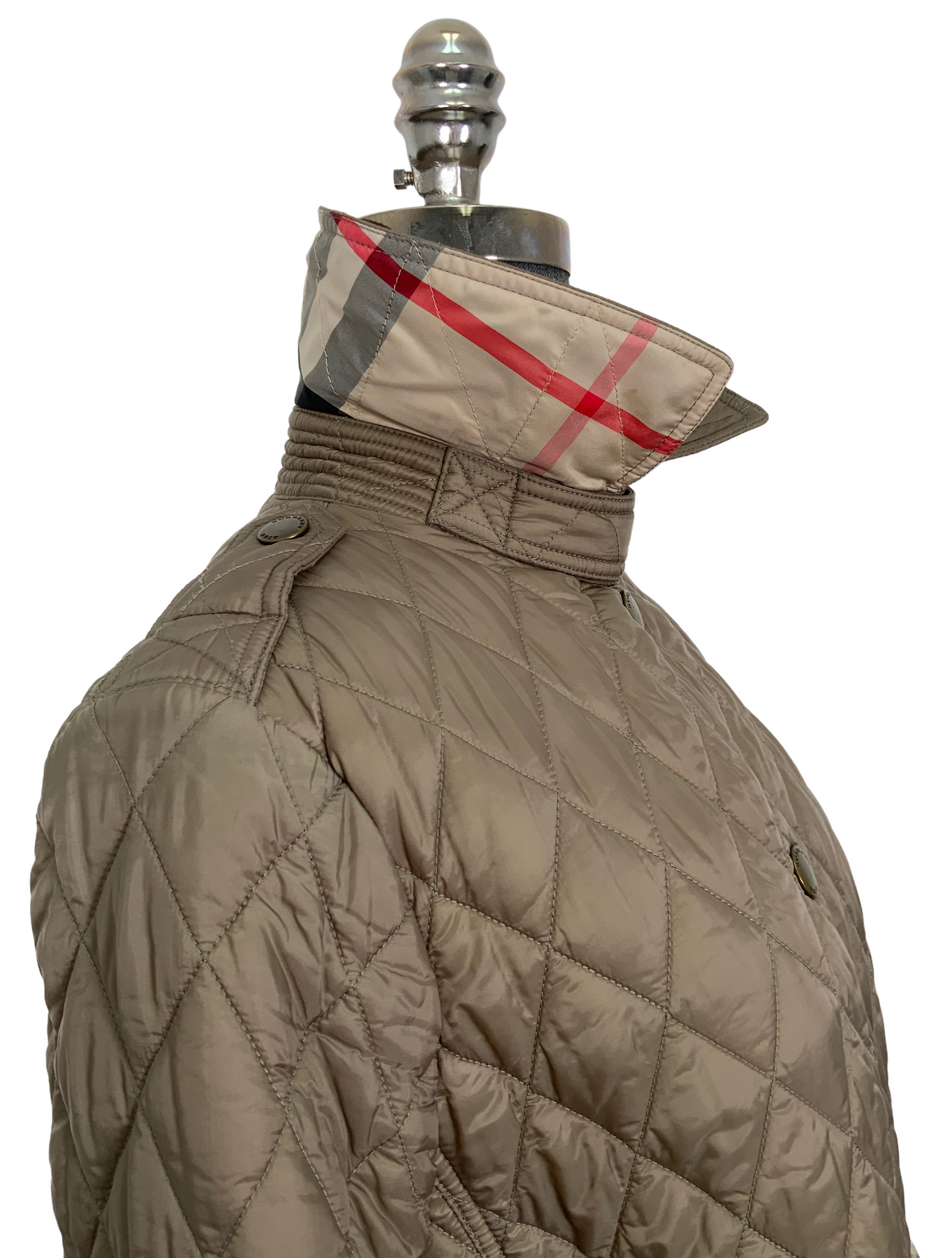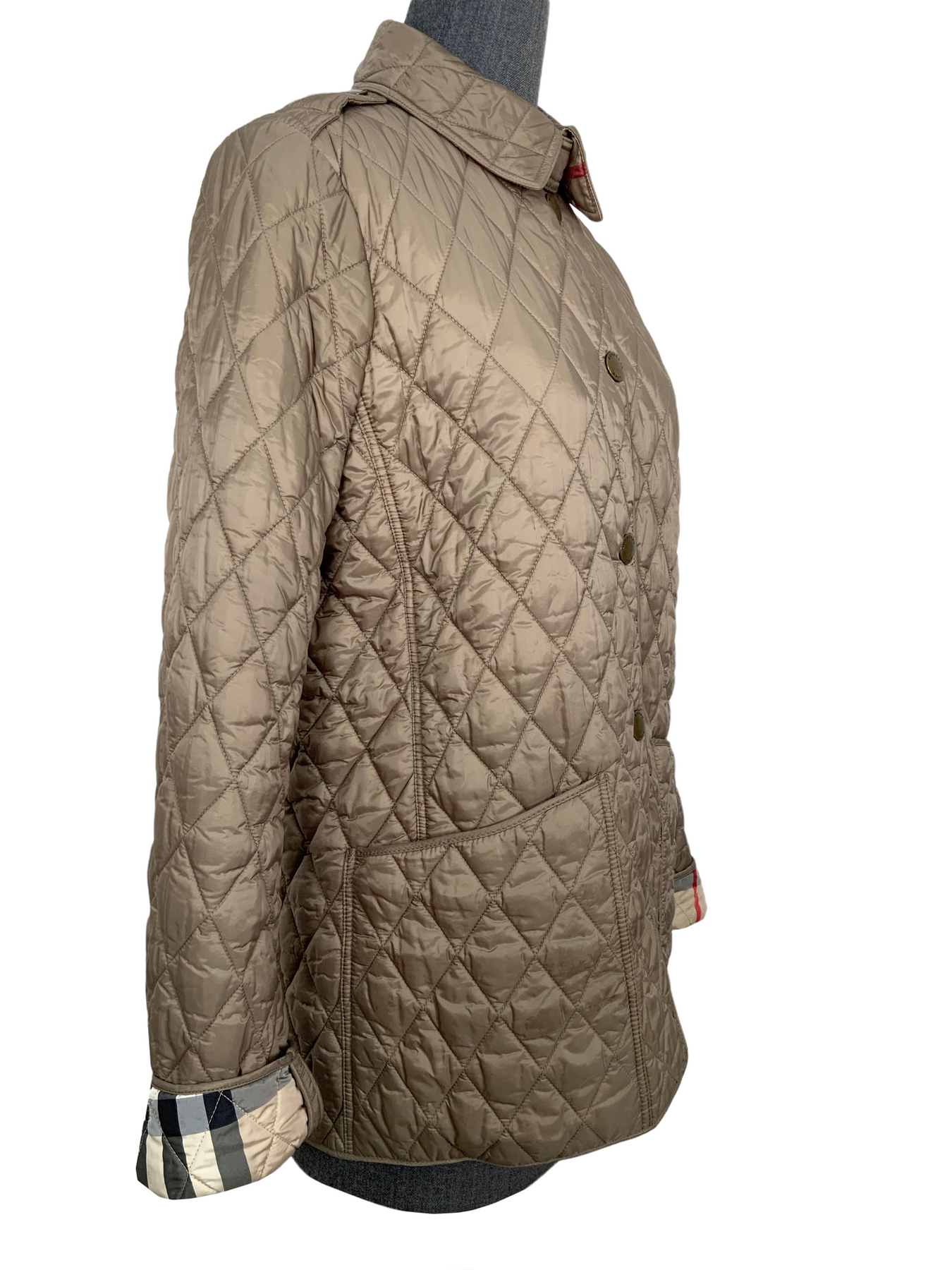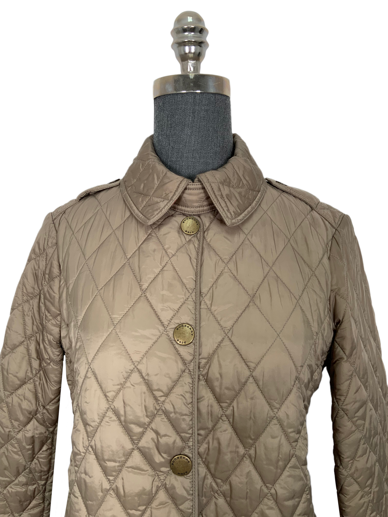 We the ity of this Burberry London Diamond Quilted Jacket Size S in taupe featuring a trim fit with long sleeves, dual patch pockets, front logo-engraved snap closures and classic checkered lining.