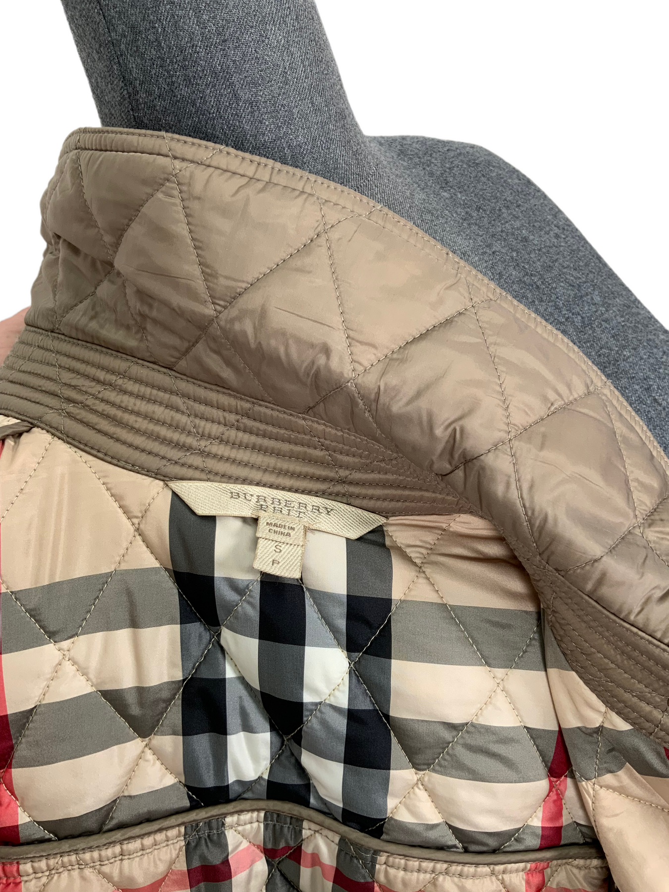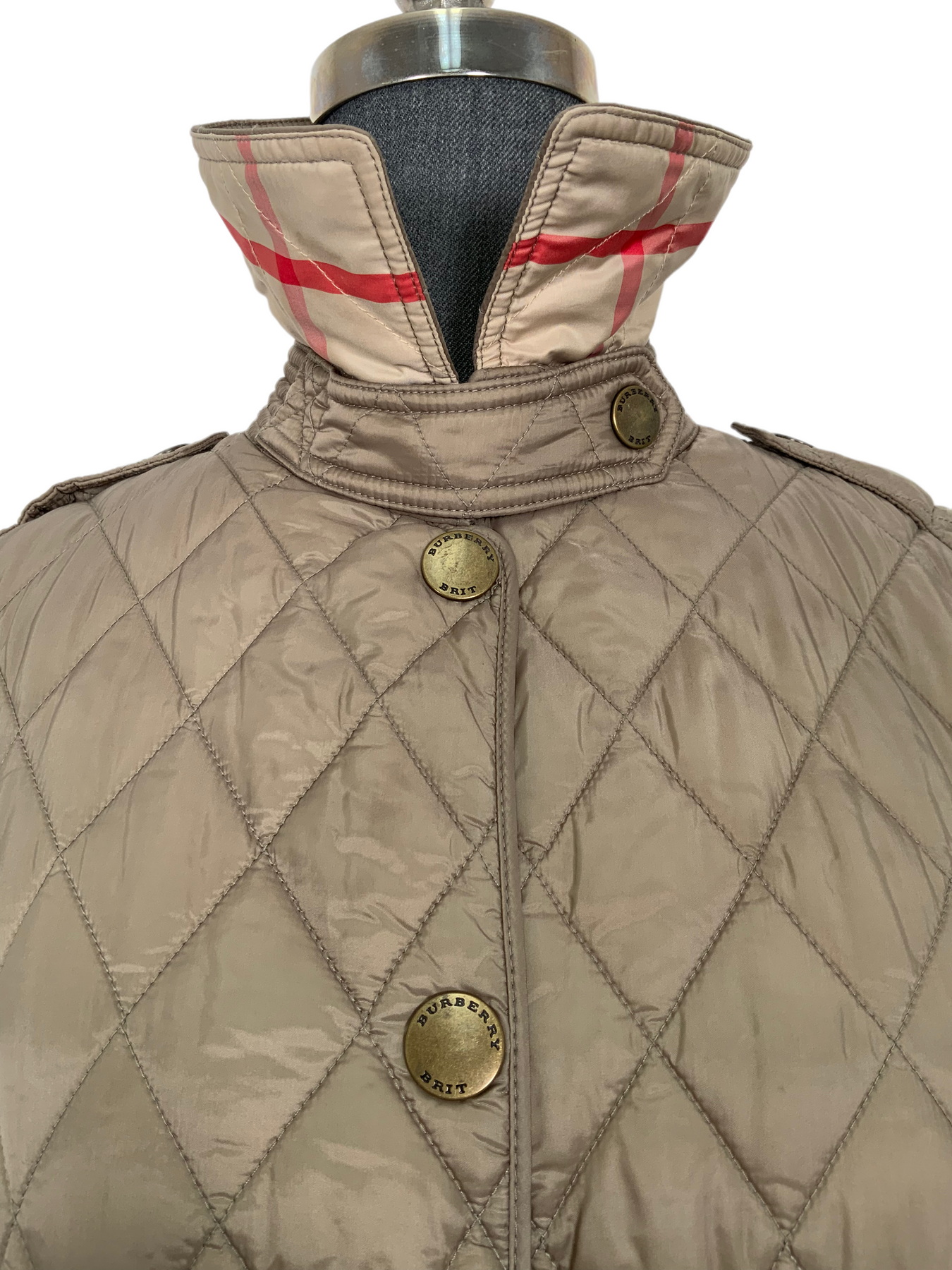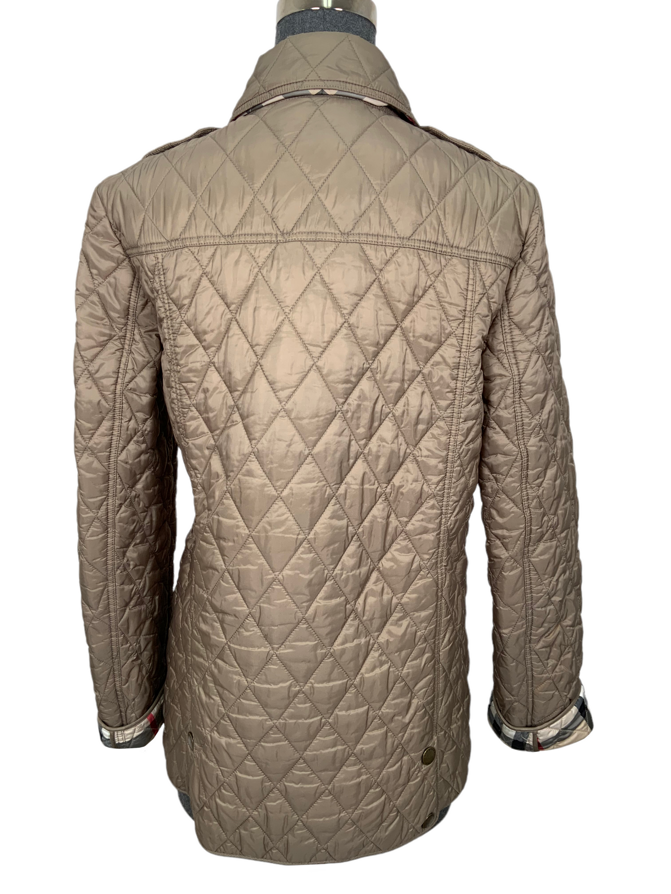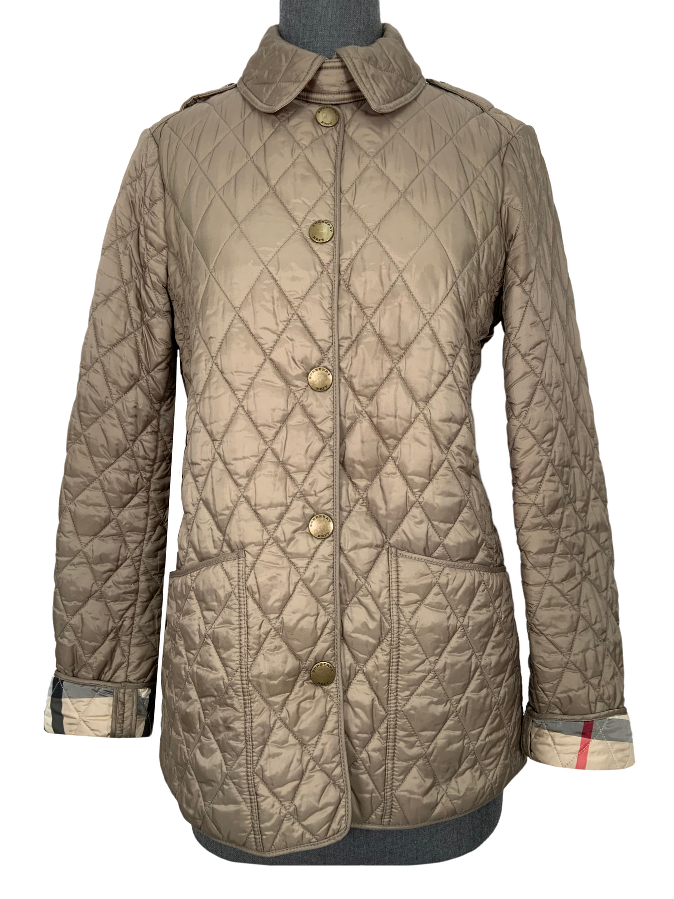 We the ity of this Burberry London Diamond Quilted Jacket Size S in taupe featuring a trim fit with long sleeves, dual patch pockets, front logo-engraved snap closures and classic checkered lining.