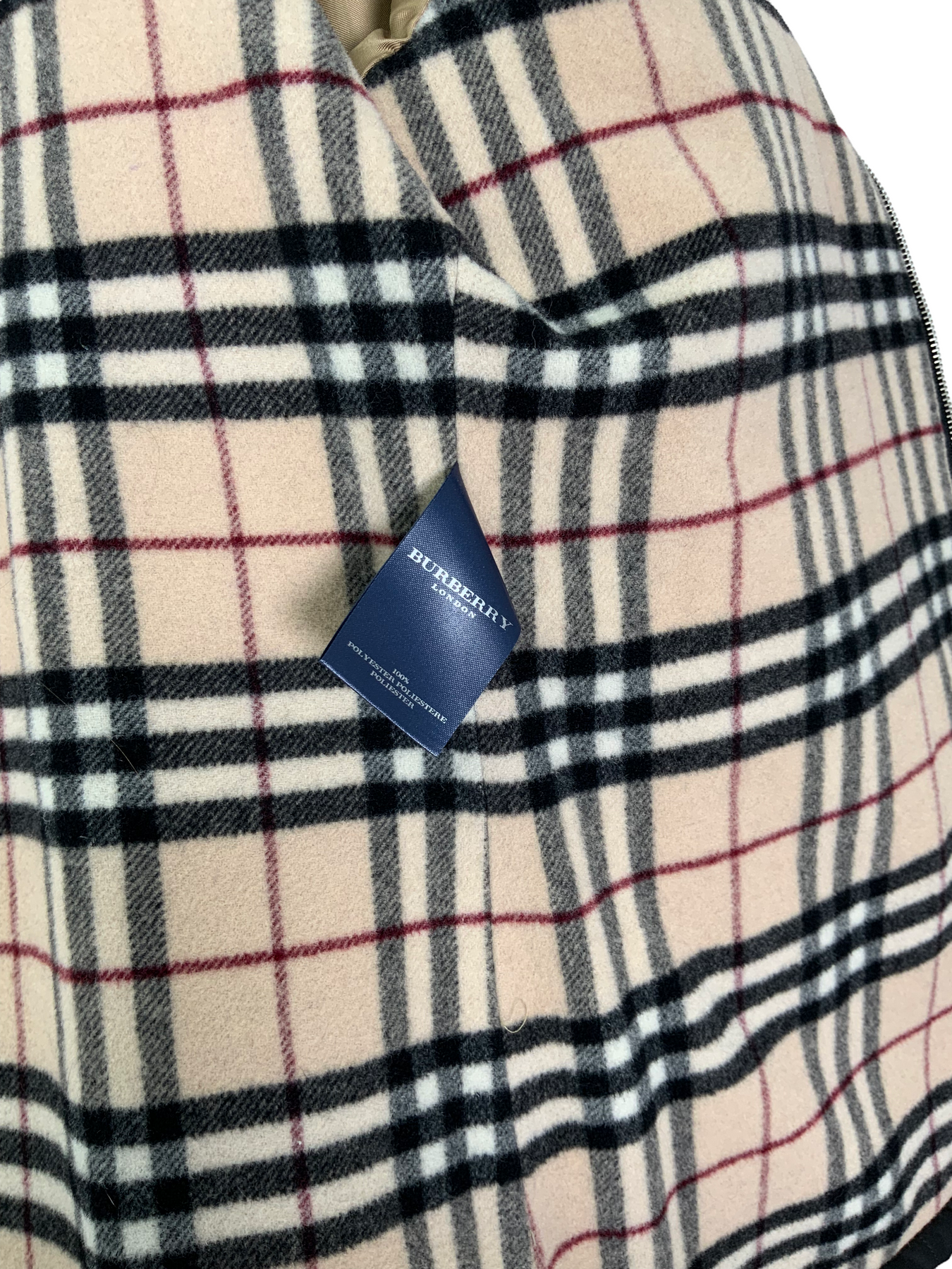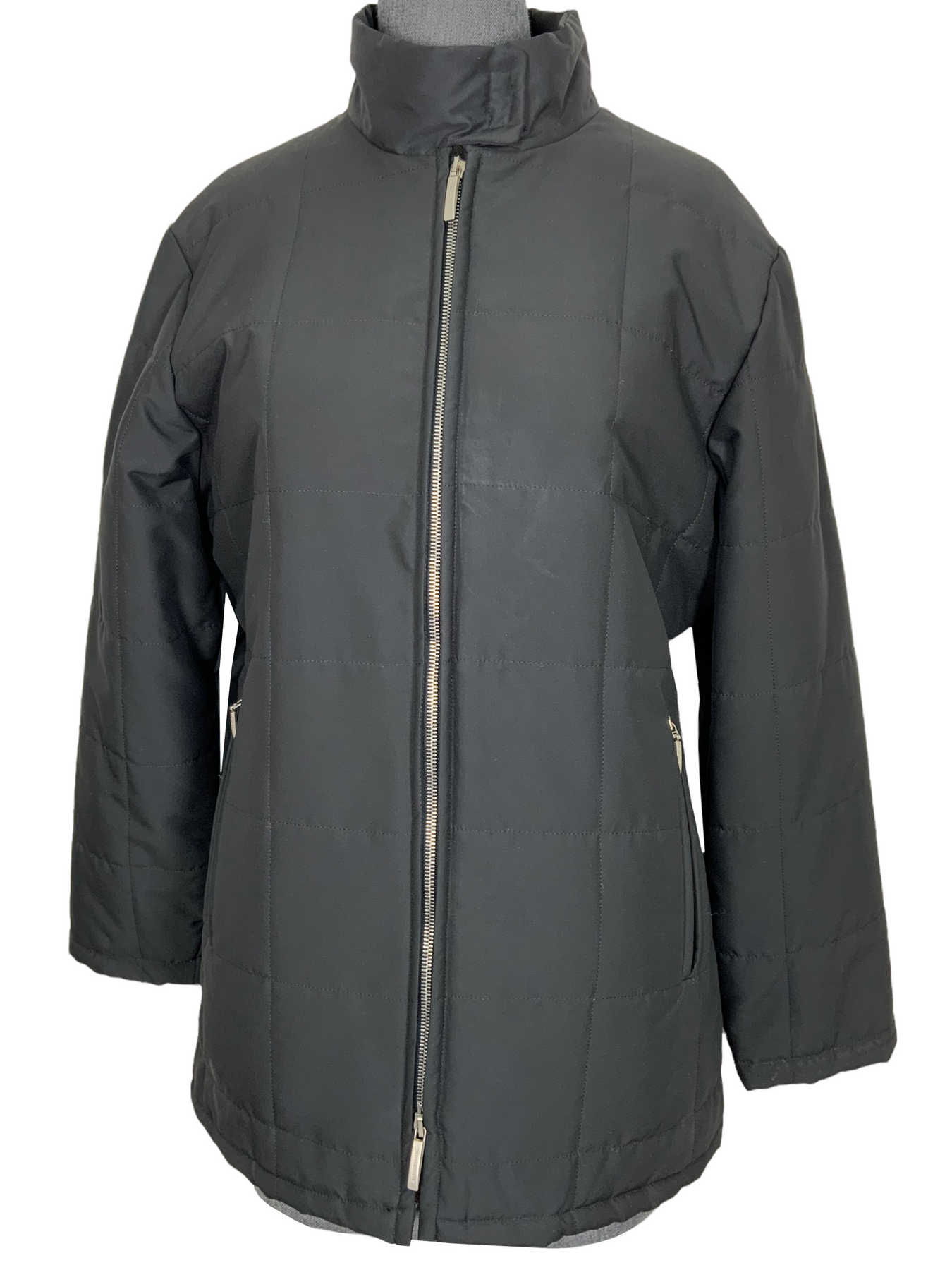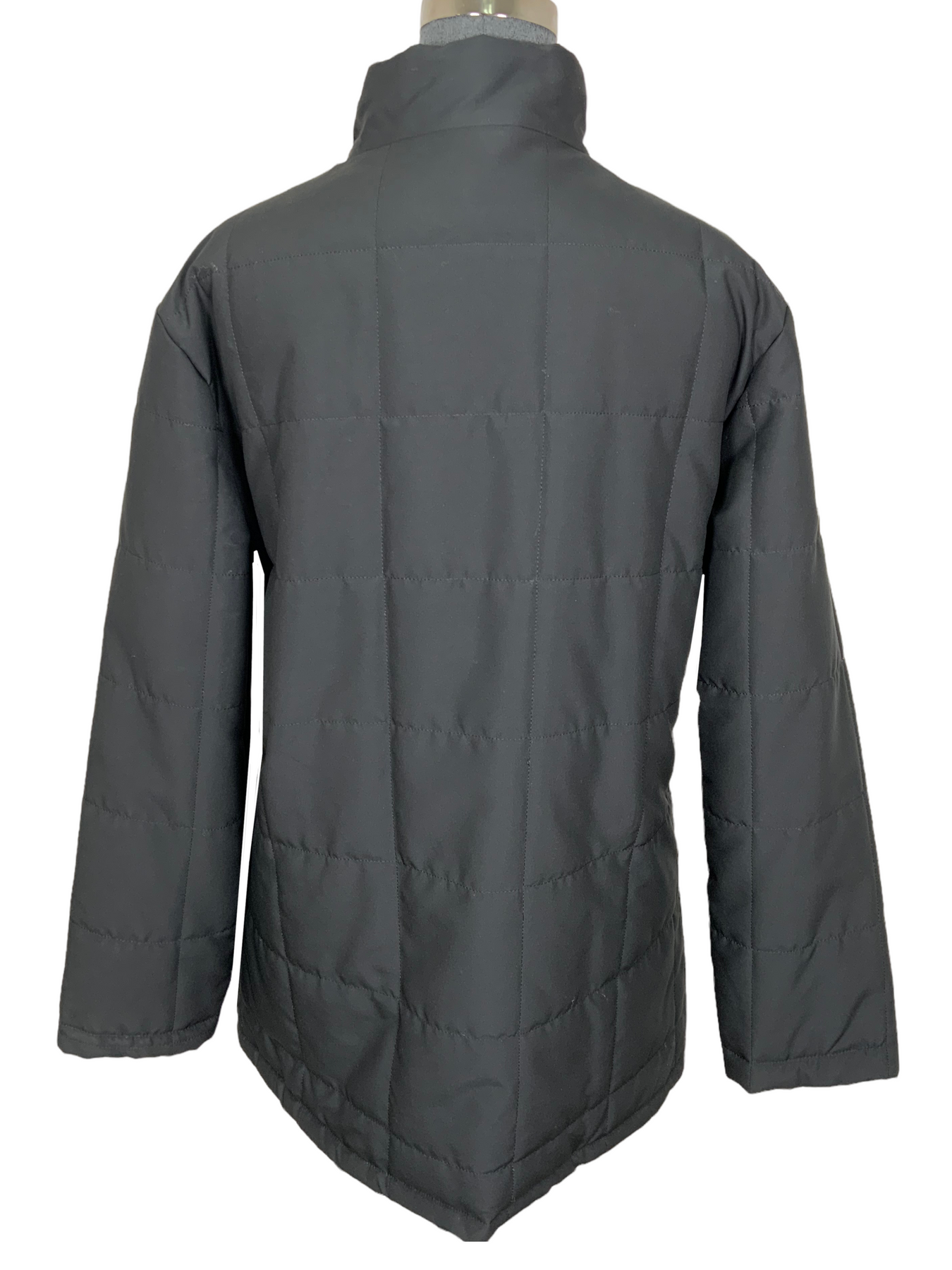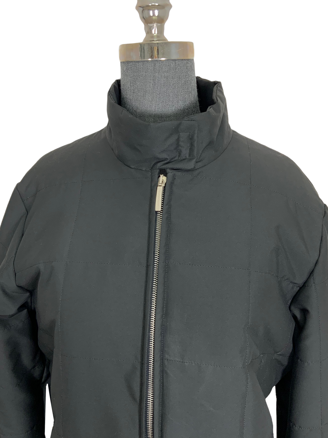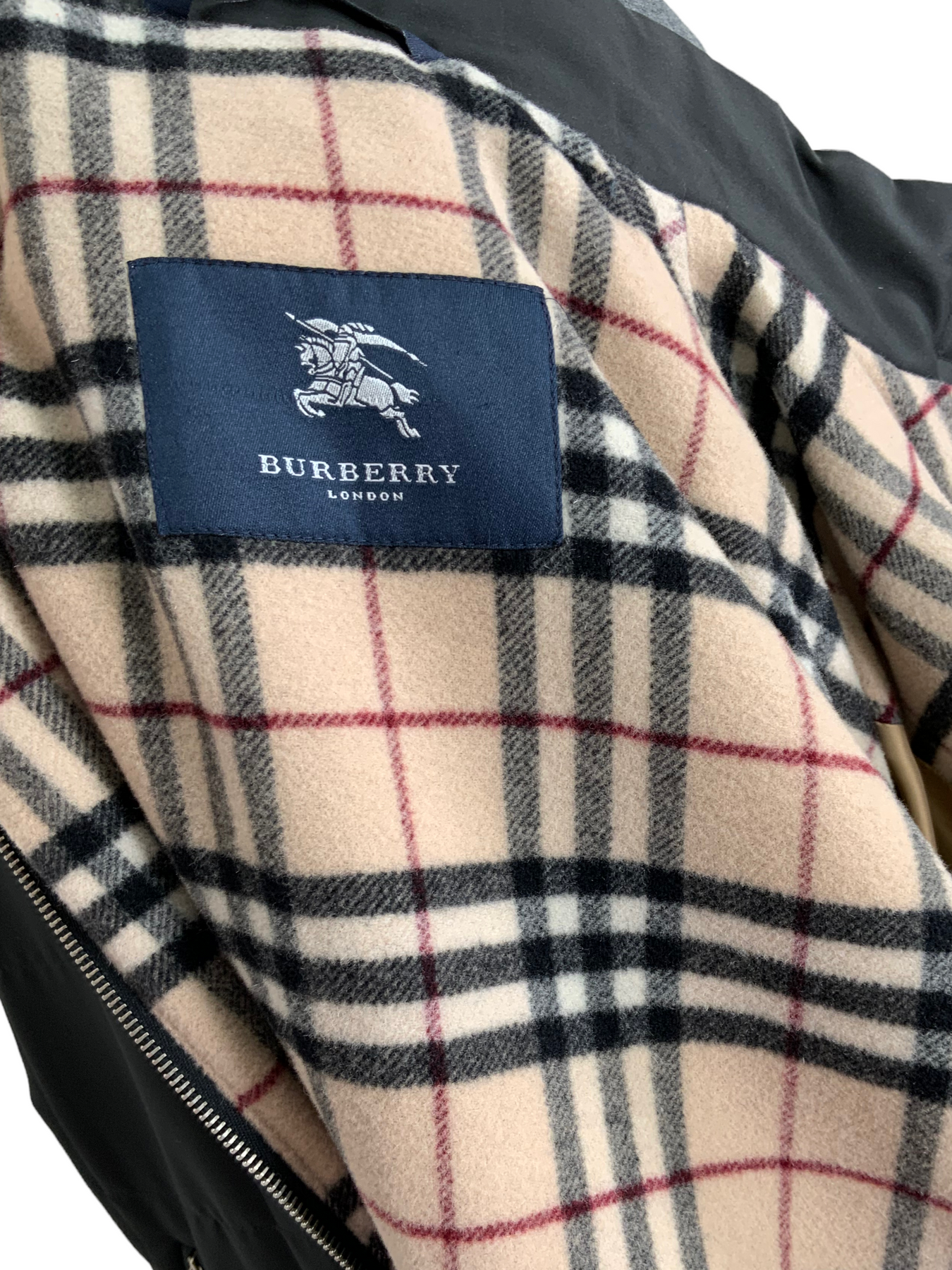 d classic Burberry London Quilted Car Coat Size L (US 14) crafted in beautiful signature black polyester. Featuring a stand collar, poly filling under the square quilting for added warmth, silver-tone metal logo-engraved zippers and signature checkered wool lining.