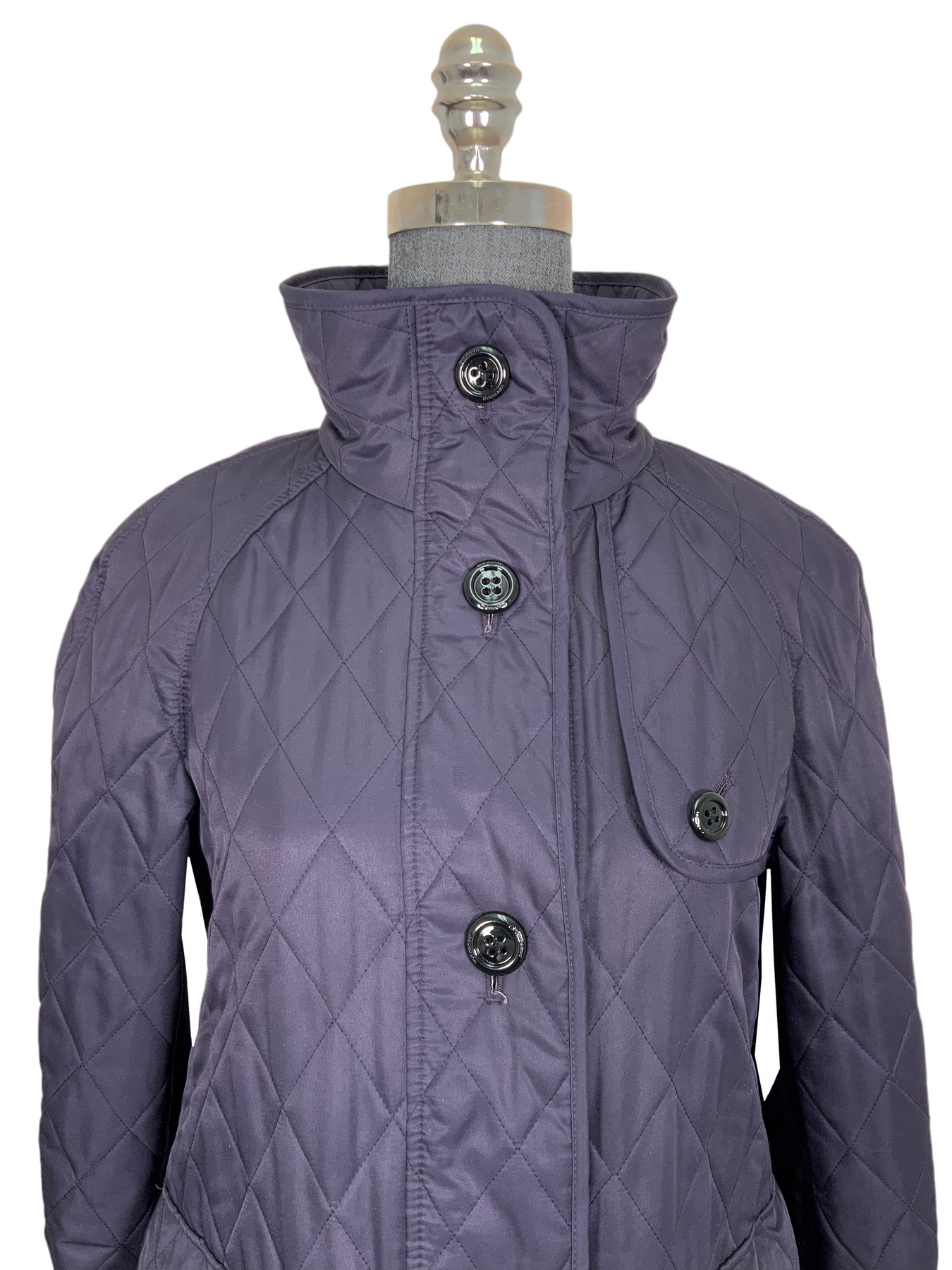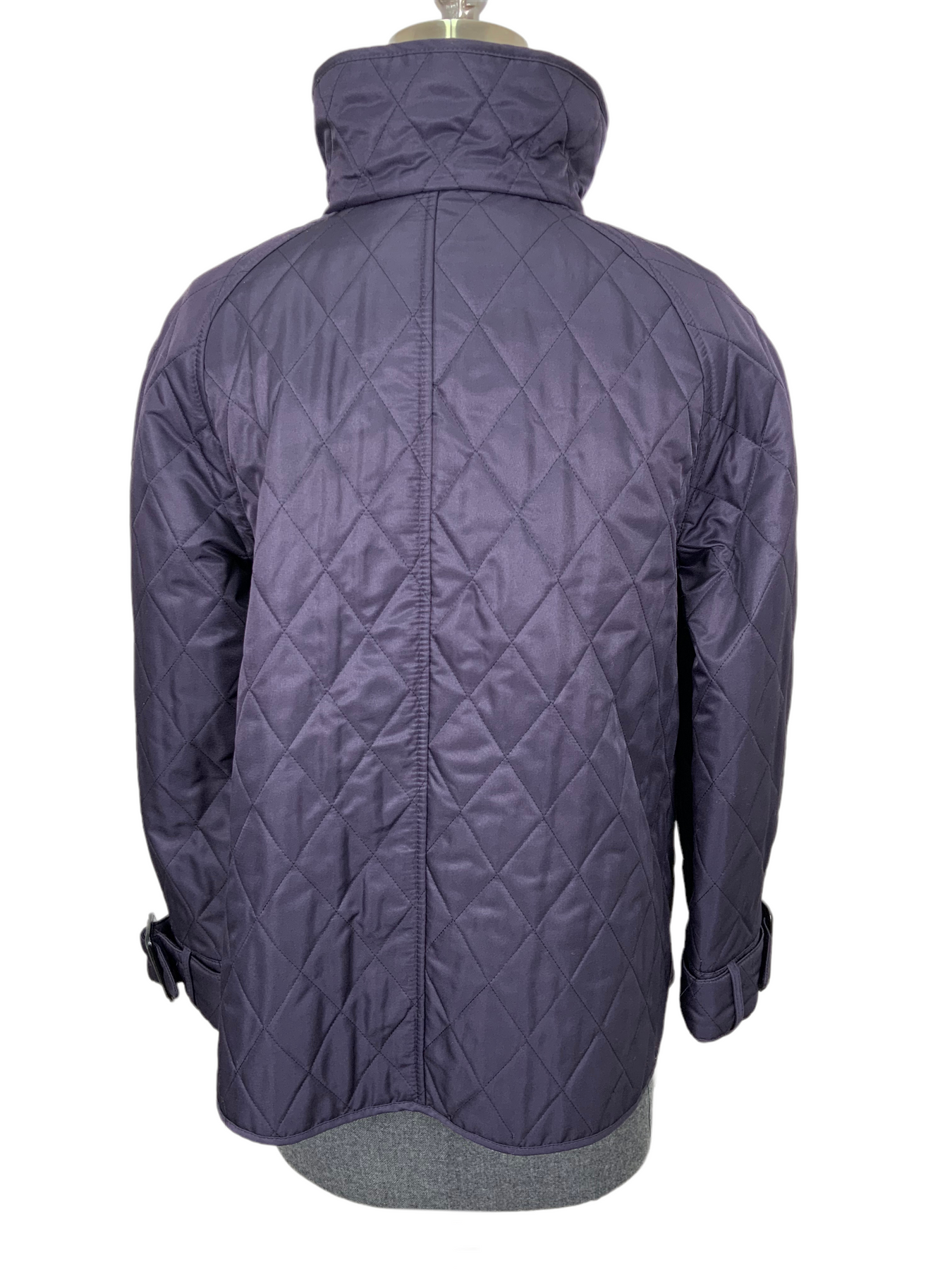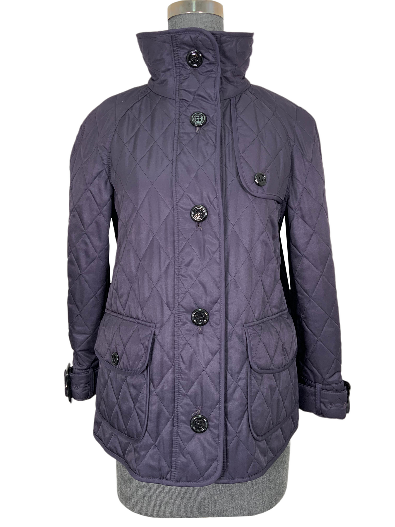 d classic Burberry London Quilted Stand Collar Jacket Size S (US 6) crafted in beautiful signature purple polyester. Featuring a stand collar, oversized front patch pockets, black logo-engraved button closures and signature checkered lining.