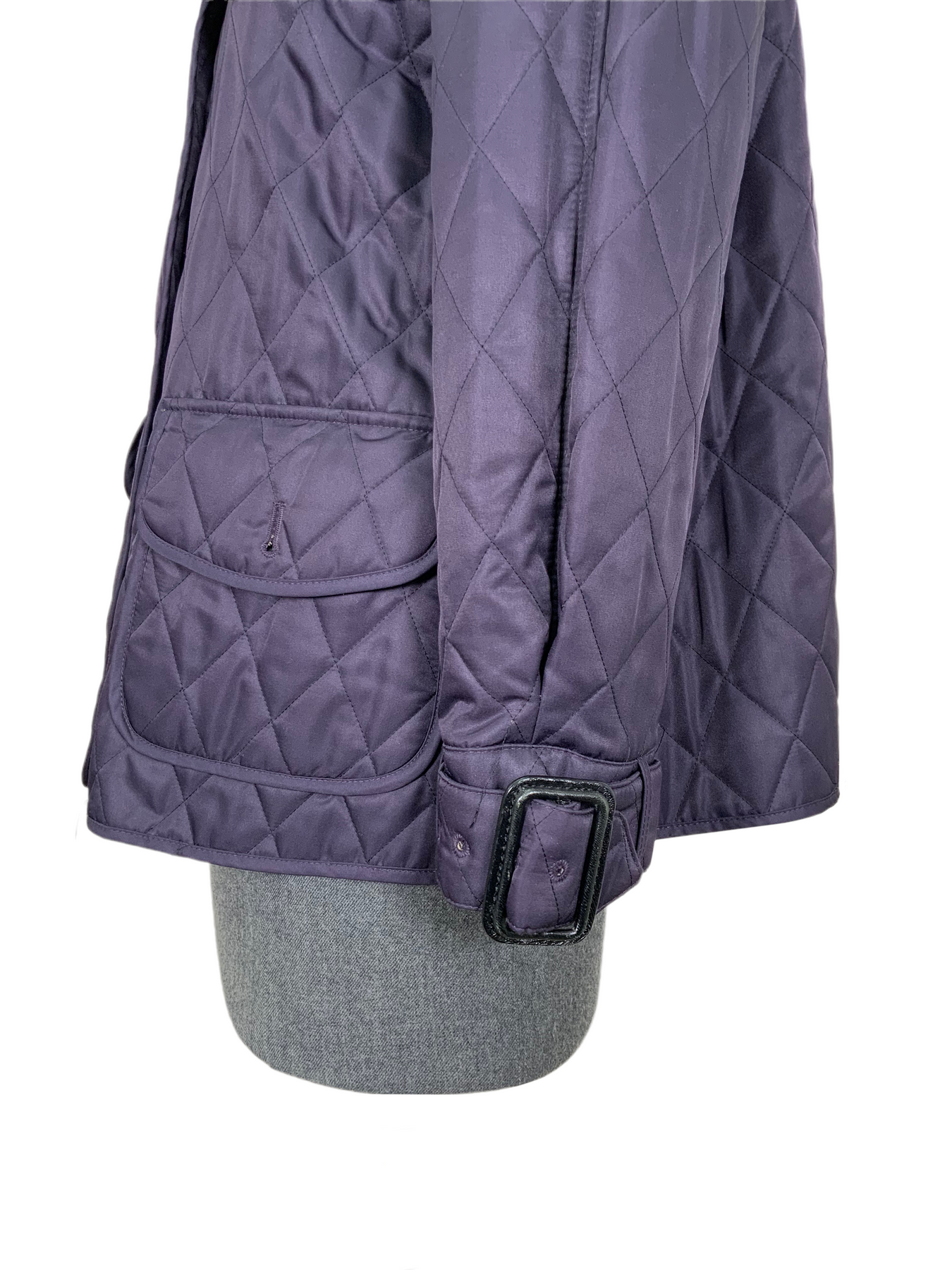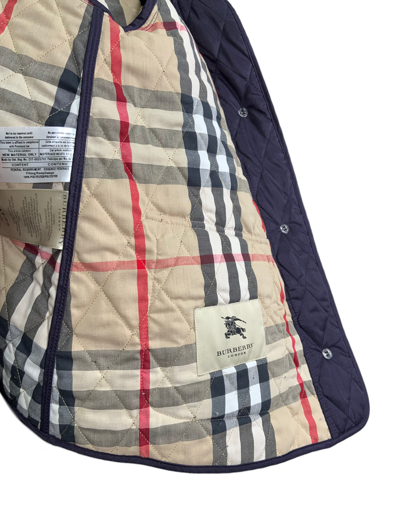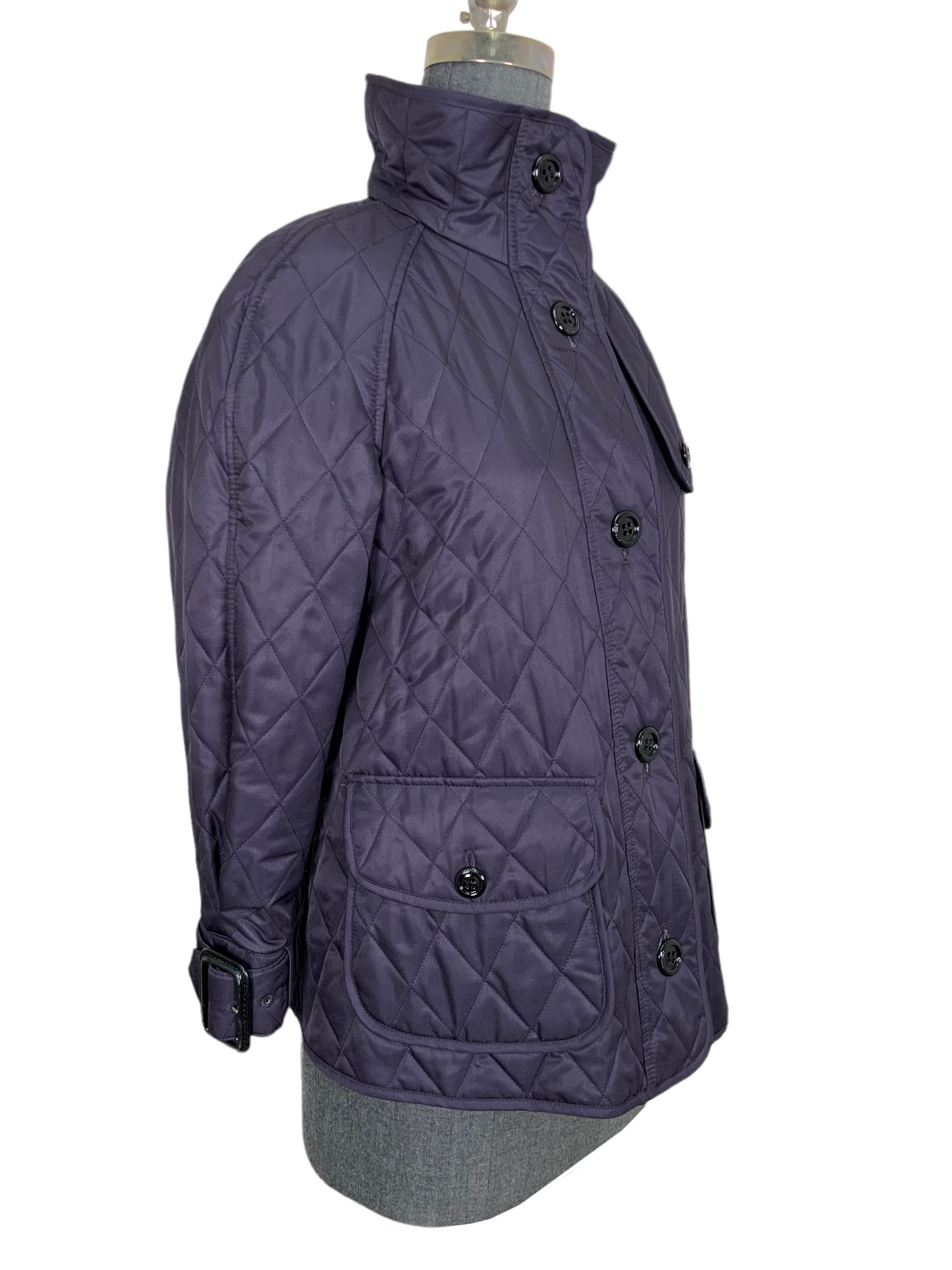 d classic Burberry London Quilted Stand Collar Jacket Size S (US 6) crafted in beautiful signature purple polyester. Featuring a stand collar, oversized front patch pockets, black logo-engraved button closures and signature checkered lining.