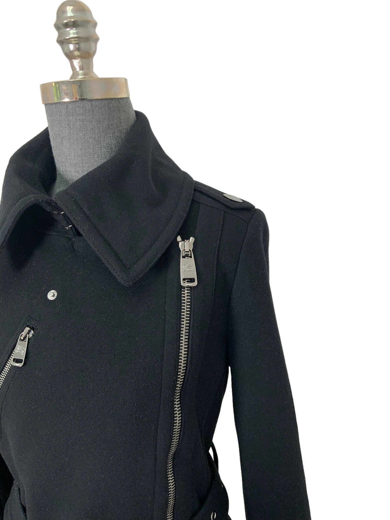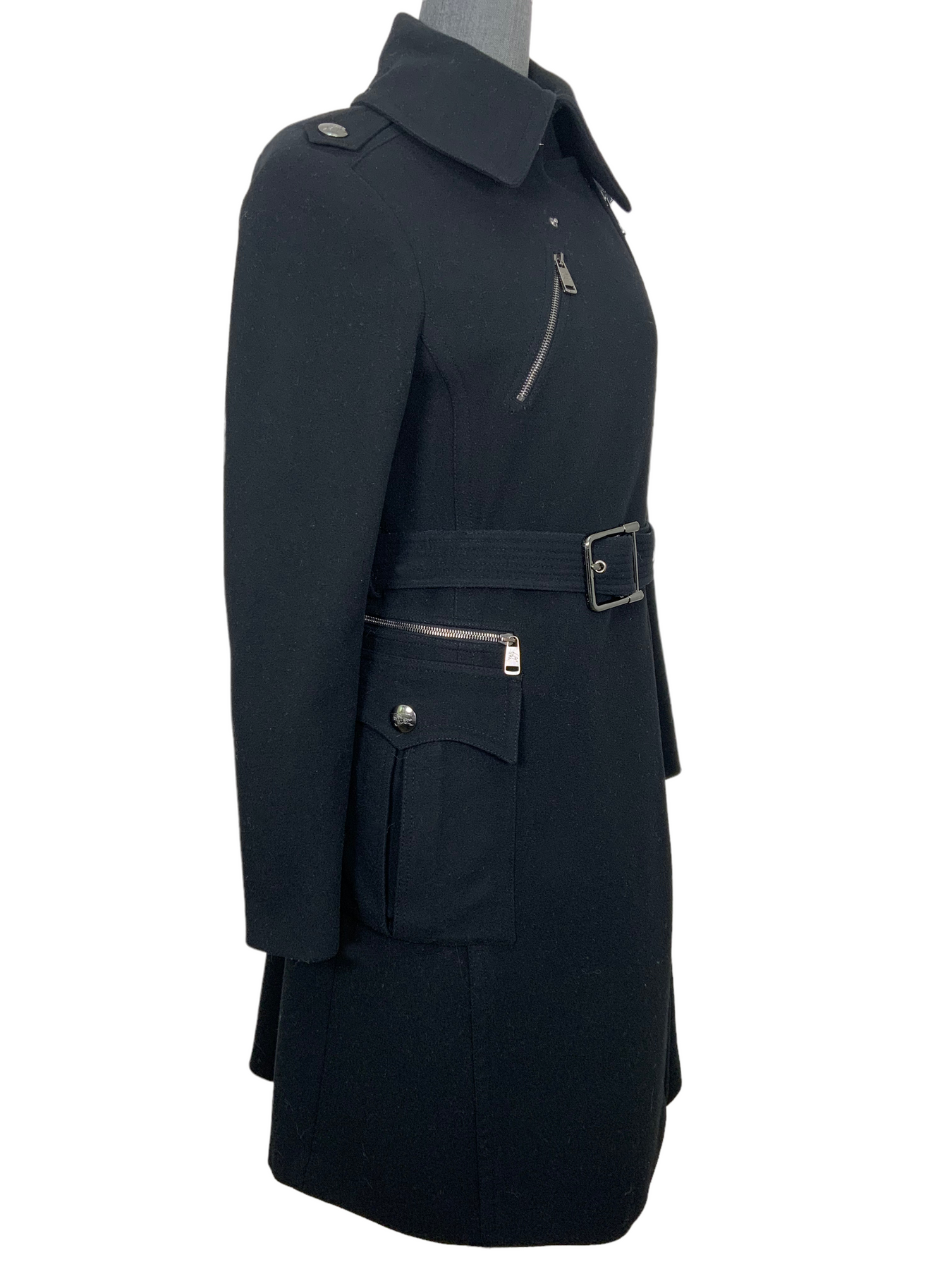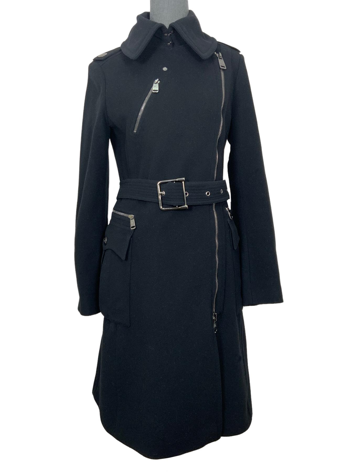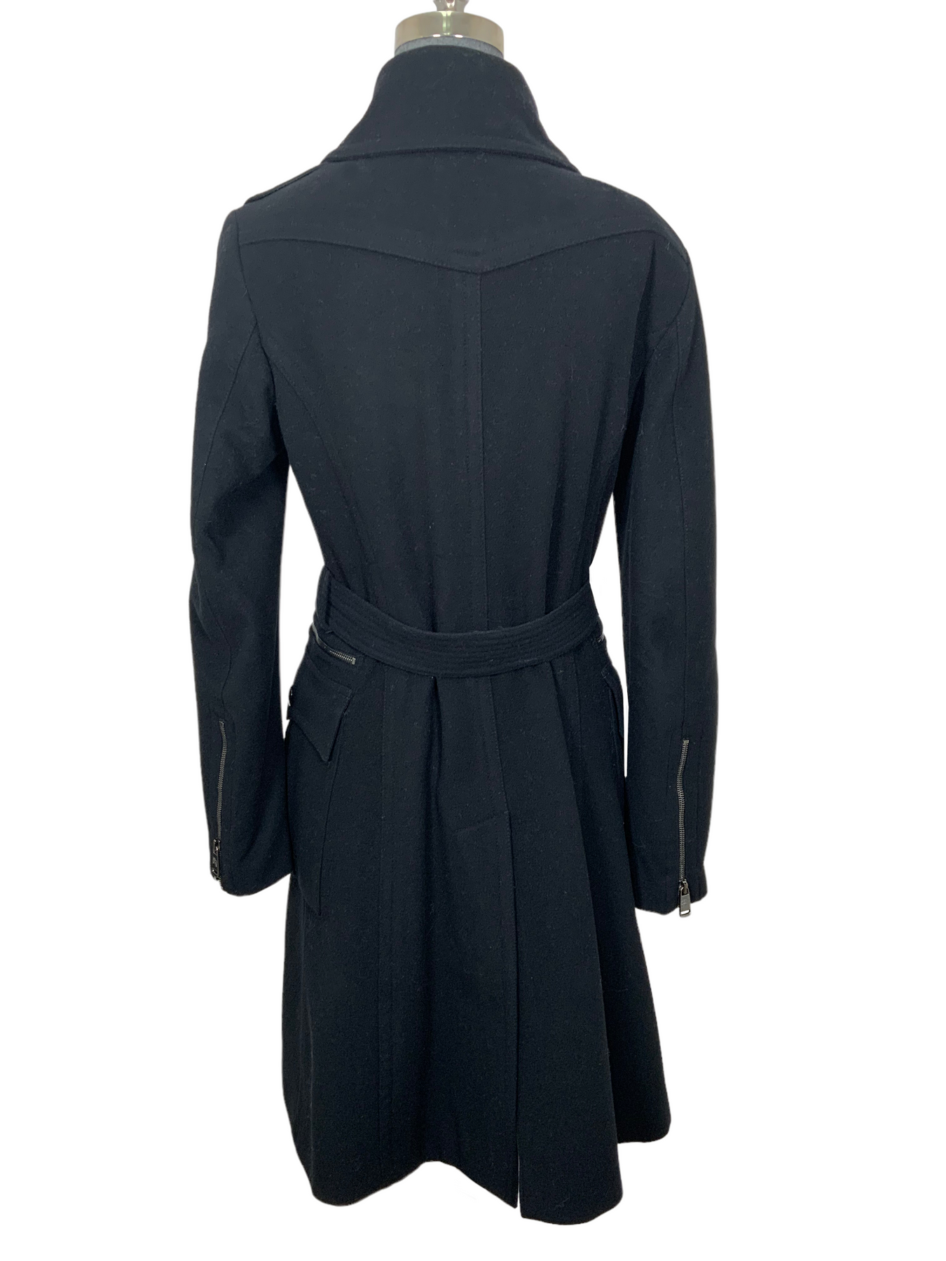 This is an BURBERRY London Wool Trench Coat Size M (US 6) featuring metallic buttons, epaulettes, belted waist, a zipper cuff, central back vent hook and eye collar, logo-engraved zip and patch pockets and trademark leather buckles.