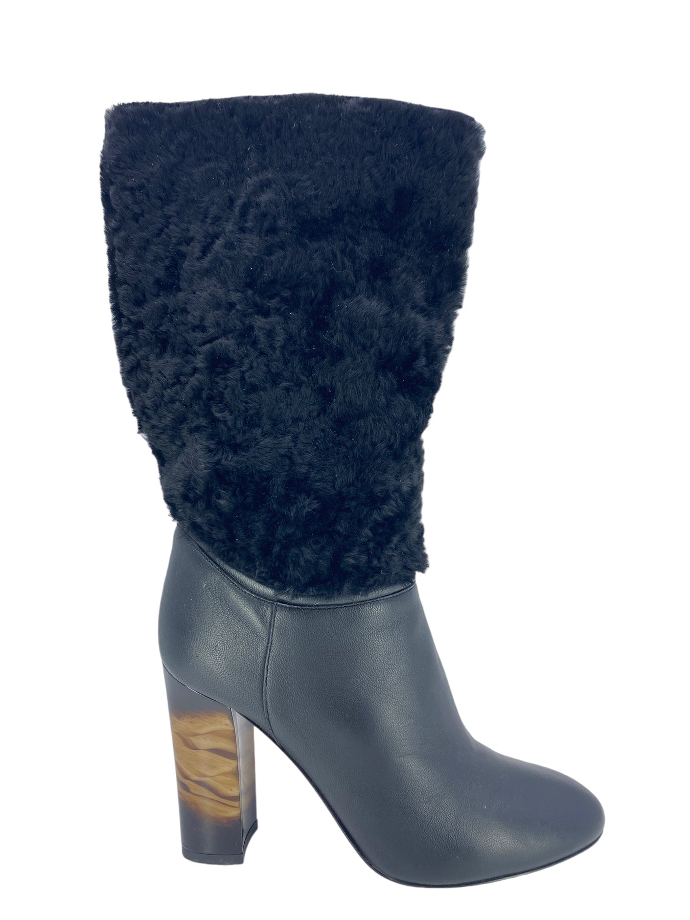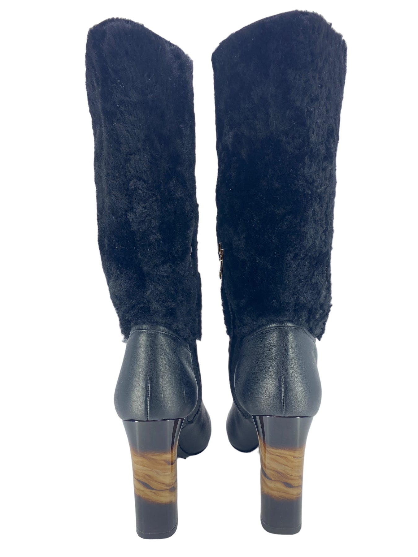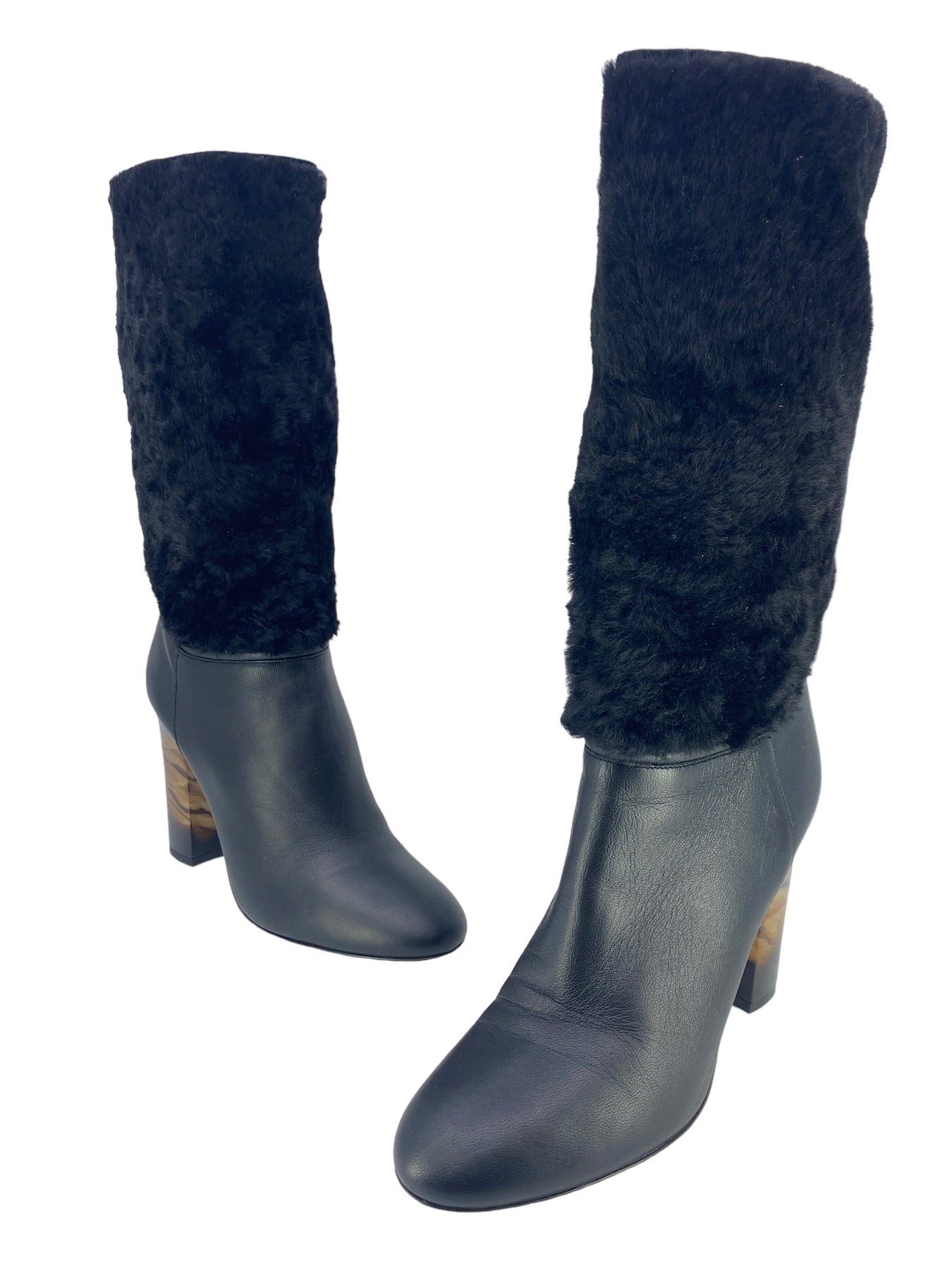 Add to your collection these beautiful Burberry mid calf fur boots, Size 8 I EU 38. These boots are crafted in a smooth black leather and fur. Featuring a 4in" block heel, round toe and slip on design.
