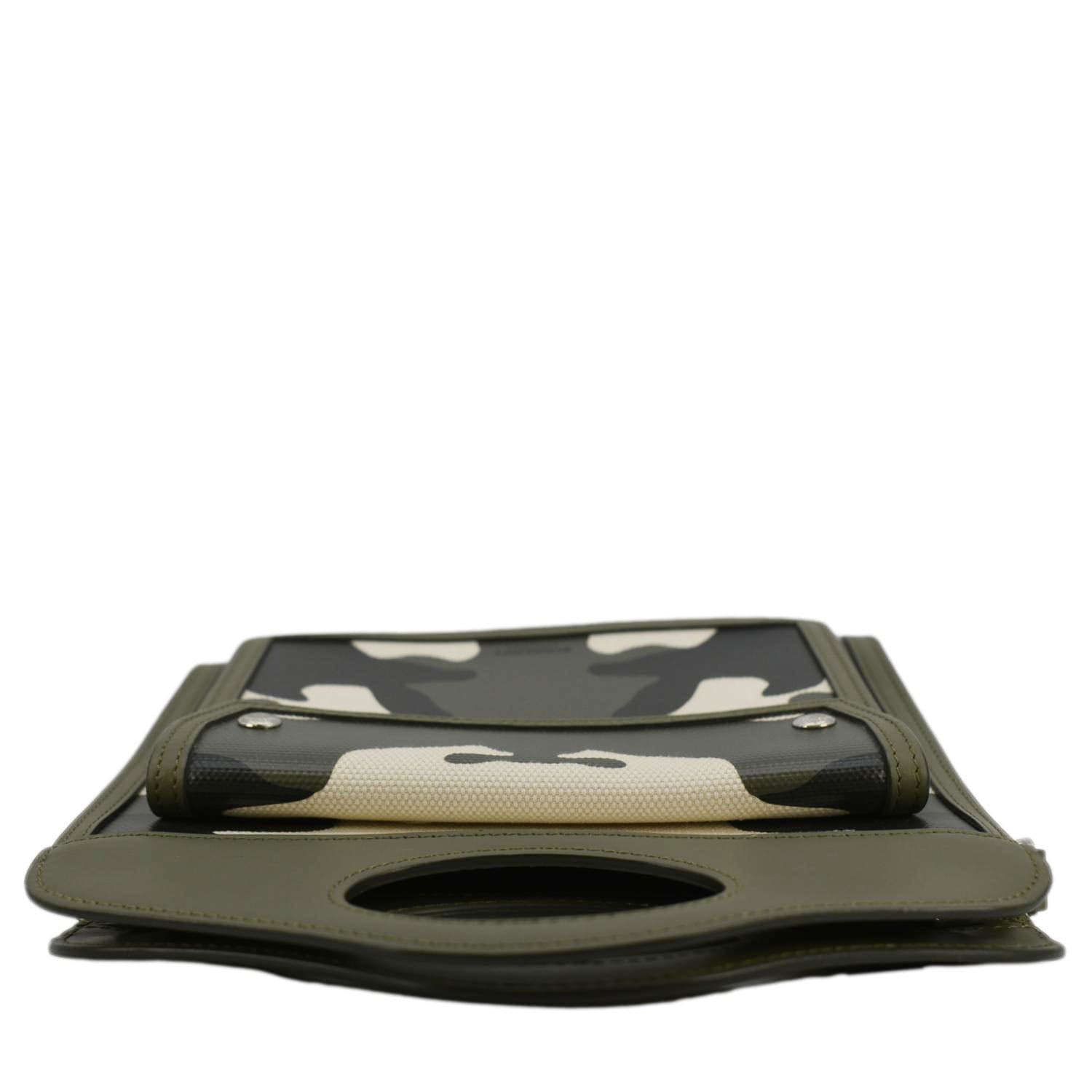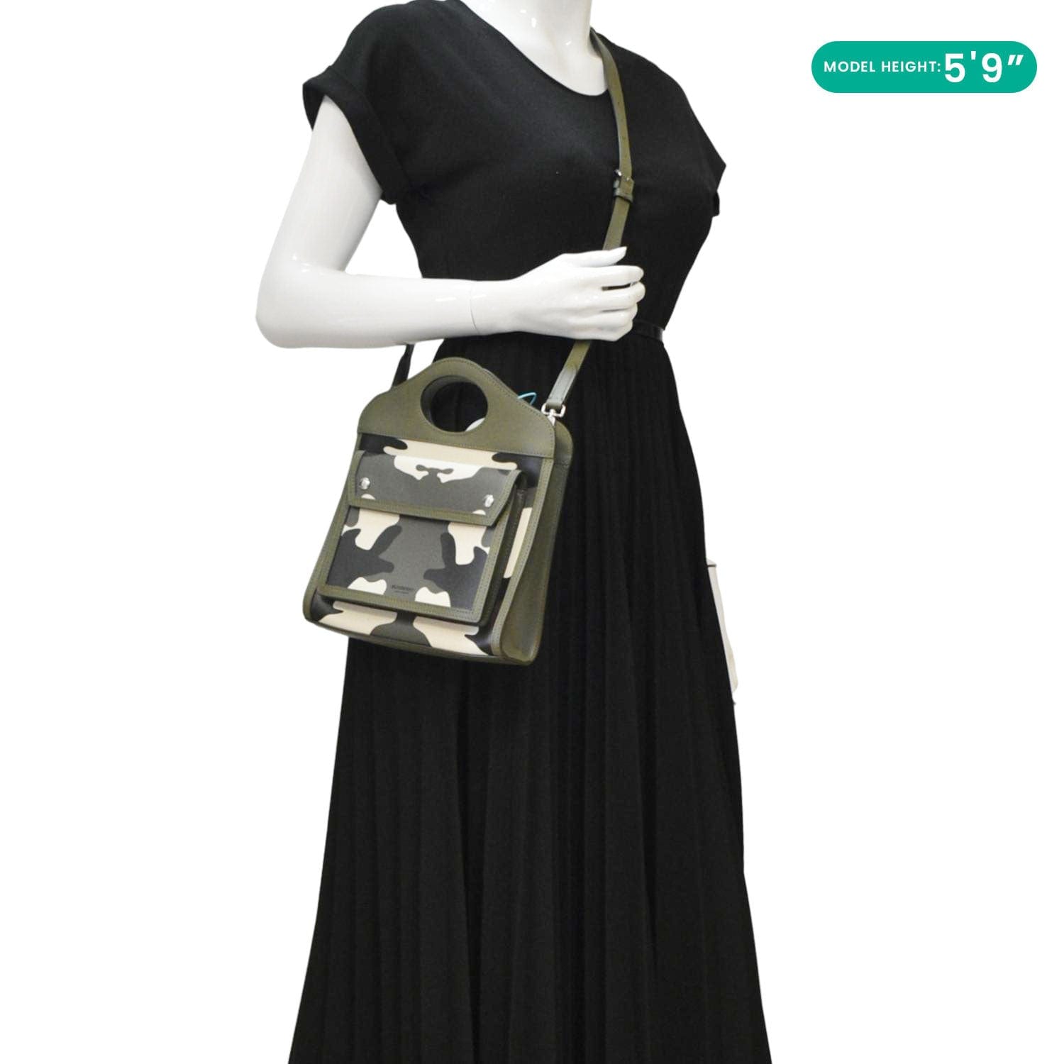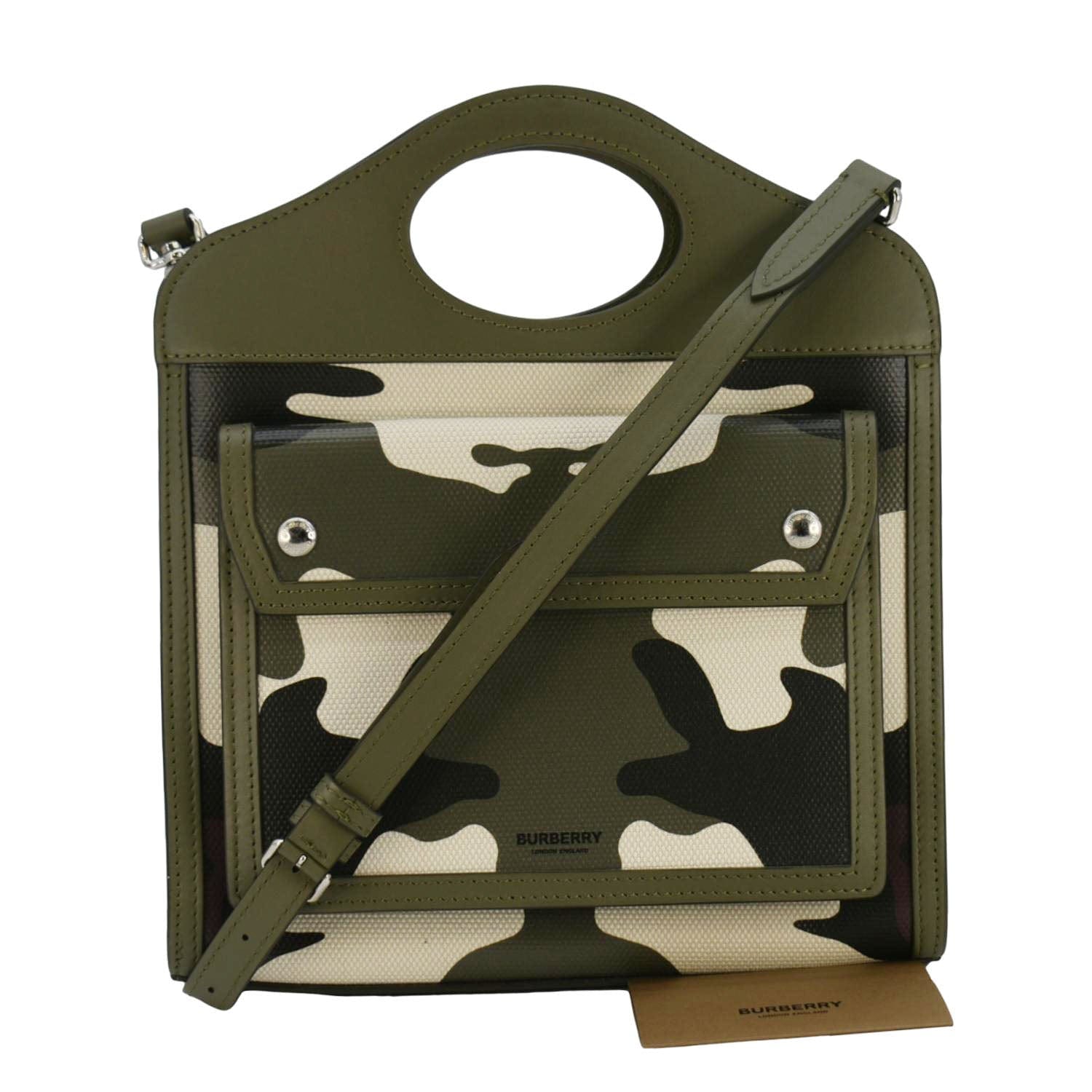 The BURBERRY Camouflage Mini Print Canvas Pocket Shoulder Bag in Green is a stylish, compact accessory featuring a unique camouflage pattern on durable canvas. With its signature front pocket and leather trim, this bag combines functionality with Burberry’s distinct urban-chic aesthetic.