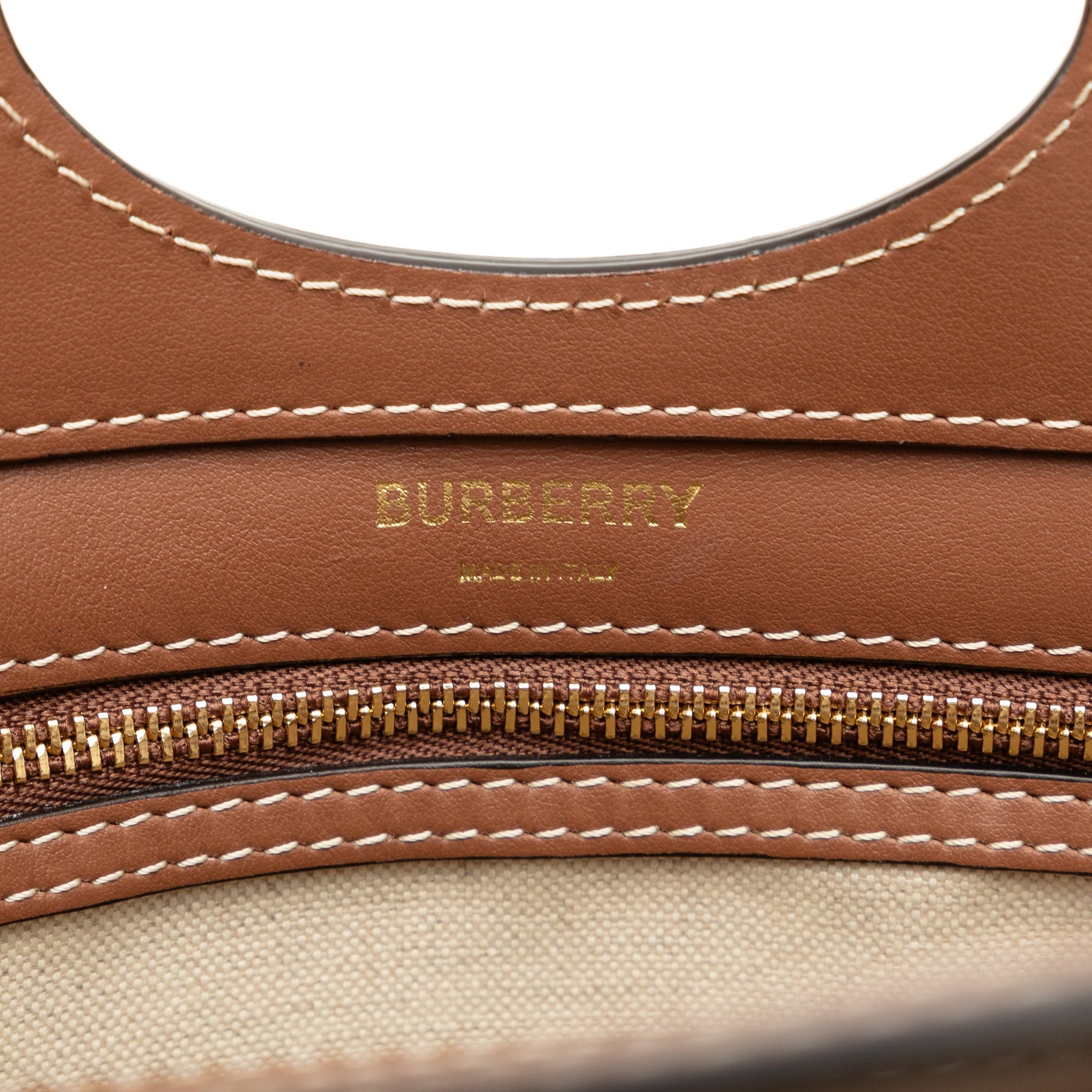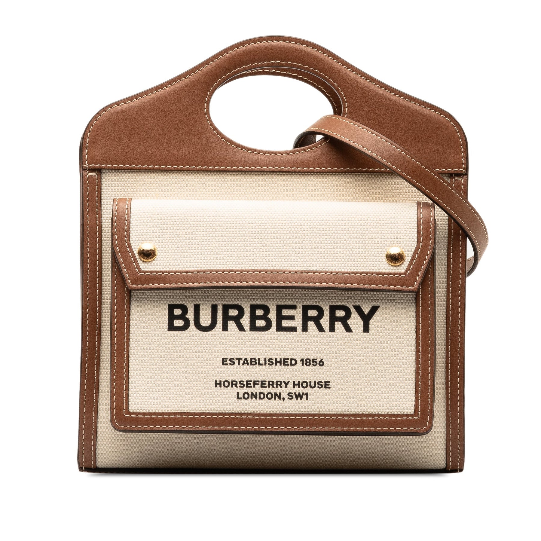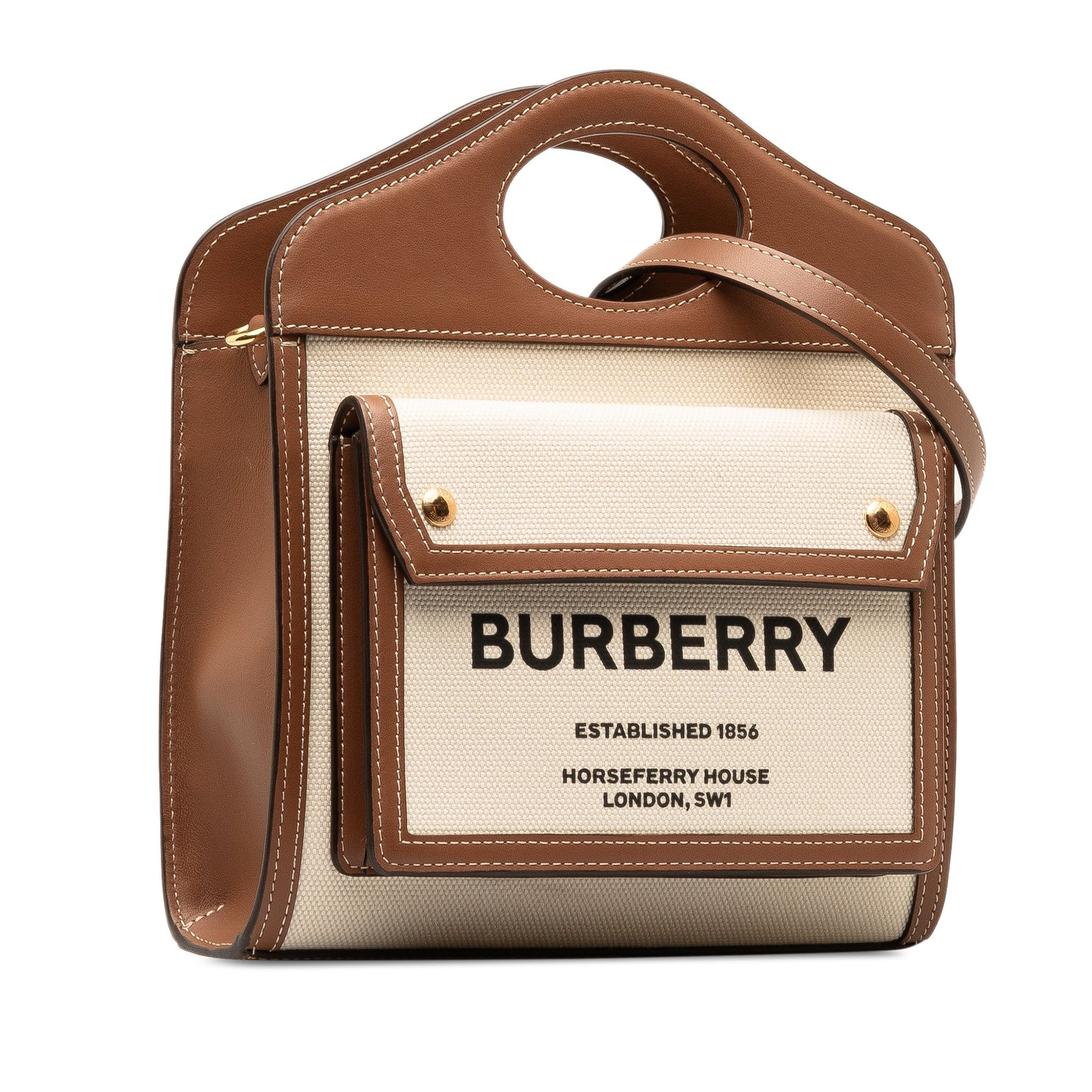 The Pocket bag features a canvas body with leather trim, flat leather cut-out handles, a detachable flap leather strap, an open top, an exterior front flap pocket, and interior slip pockets. Comes with dust bag