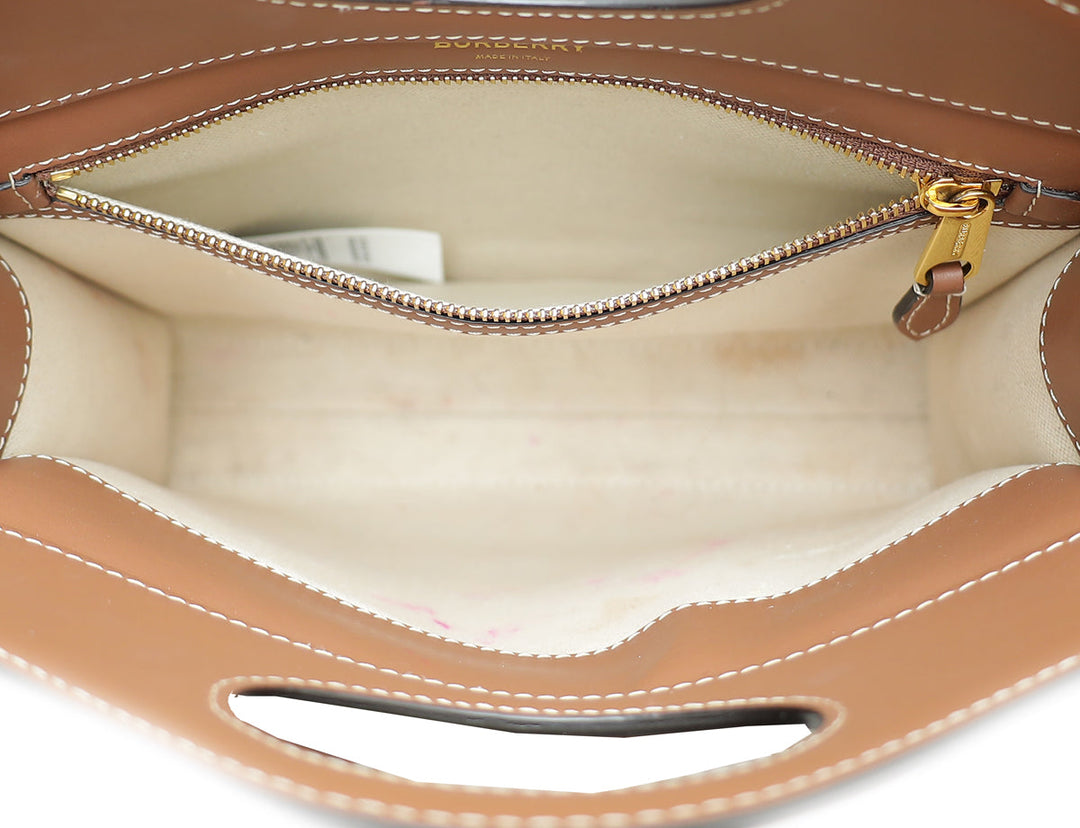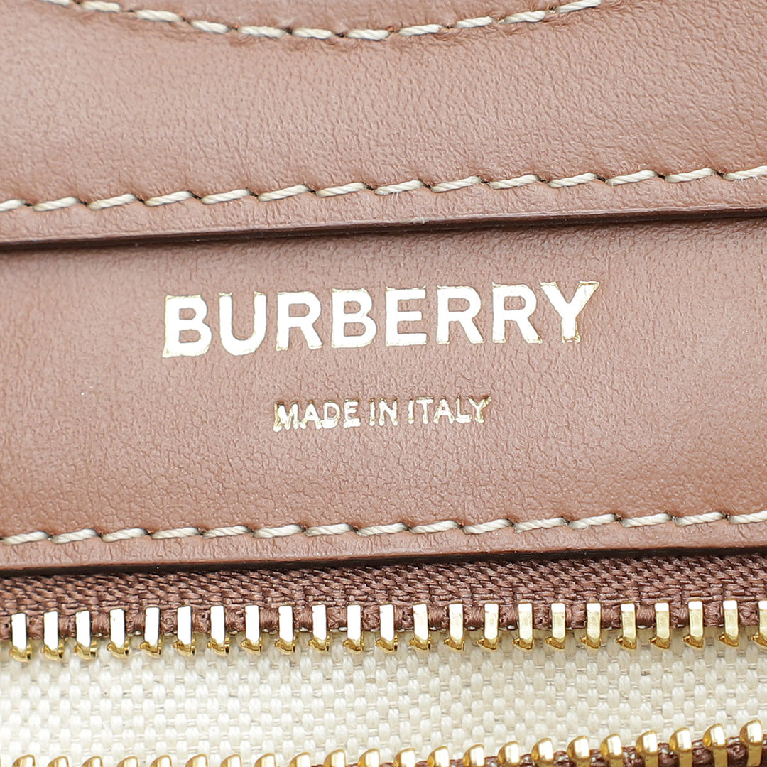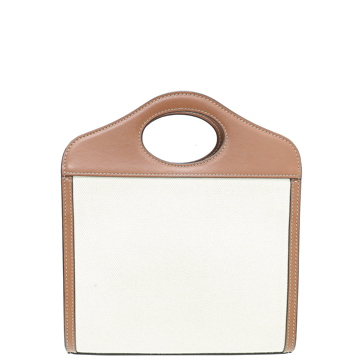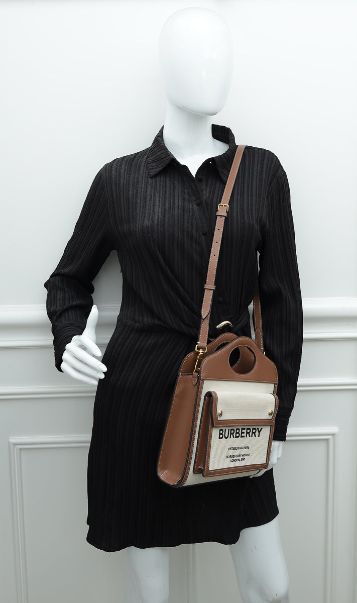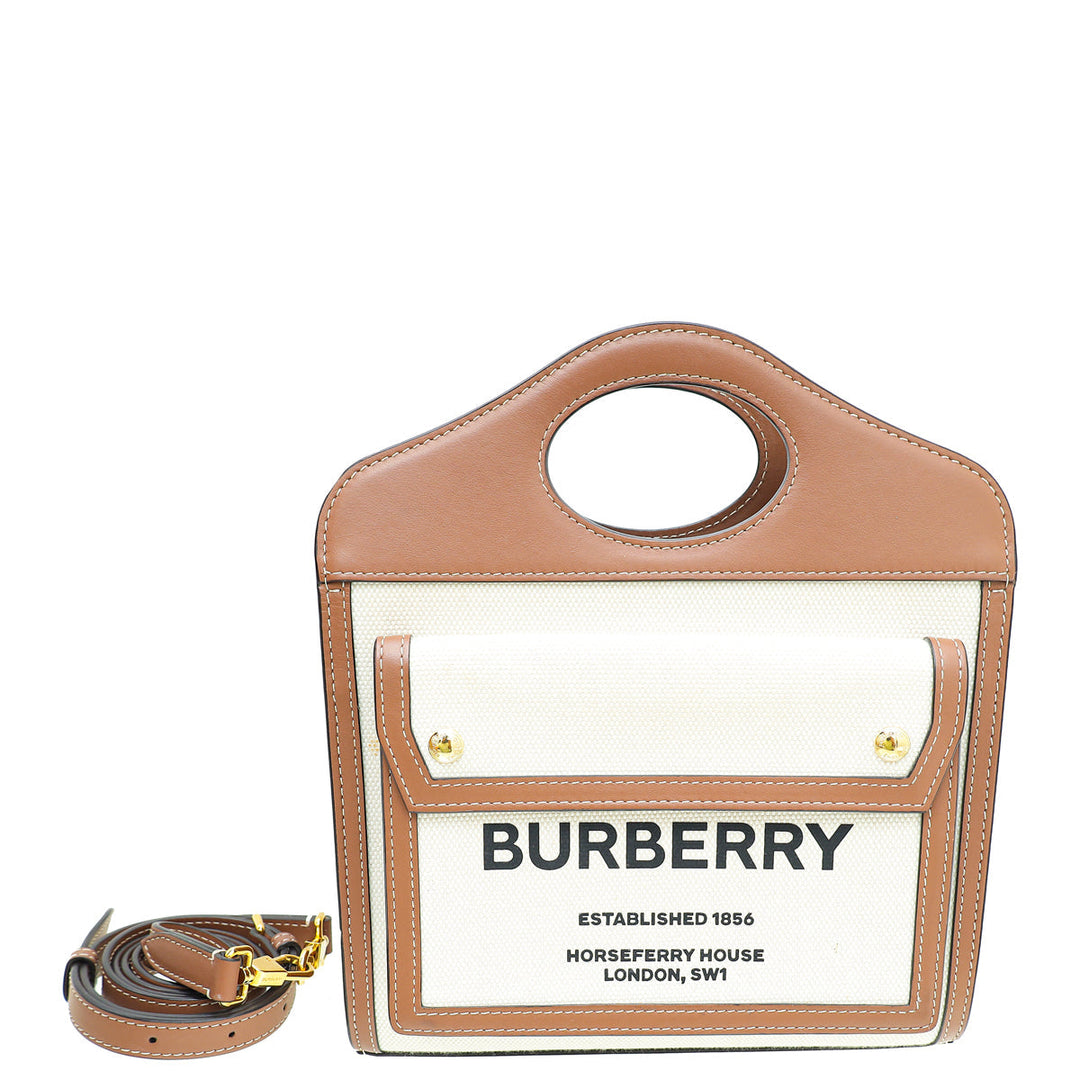 Crafted with Natural Canvas and Leather Trim, this Burberry Pocket Mini Bag shines with its glamorous Gold Hardware. Refined with an interior zipper pocket, and an exterior flap pocket with snap closure, the versatile design can be as a shoulder bag or top handle. Showcasing a unique serial number, dust bag, and stylish measurements of W x D x H, this gently-used piece is in very good condition (7.5/10) with few scratches on the corners and displaying the expected signs of wear inside.