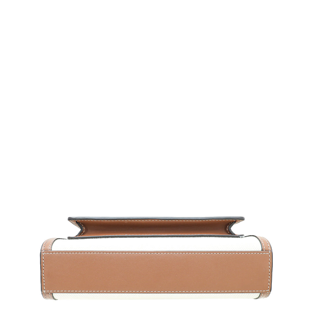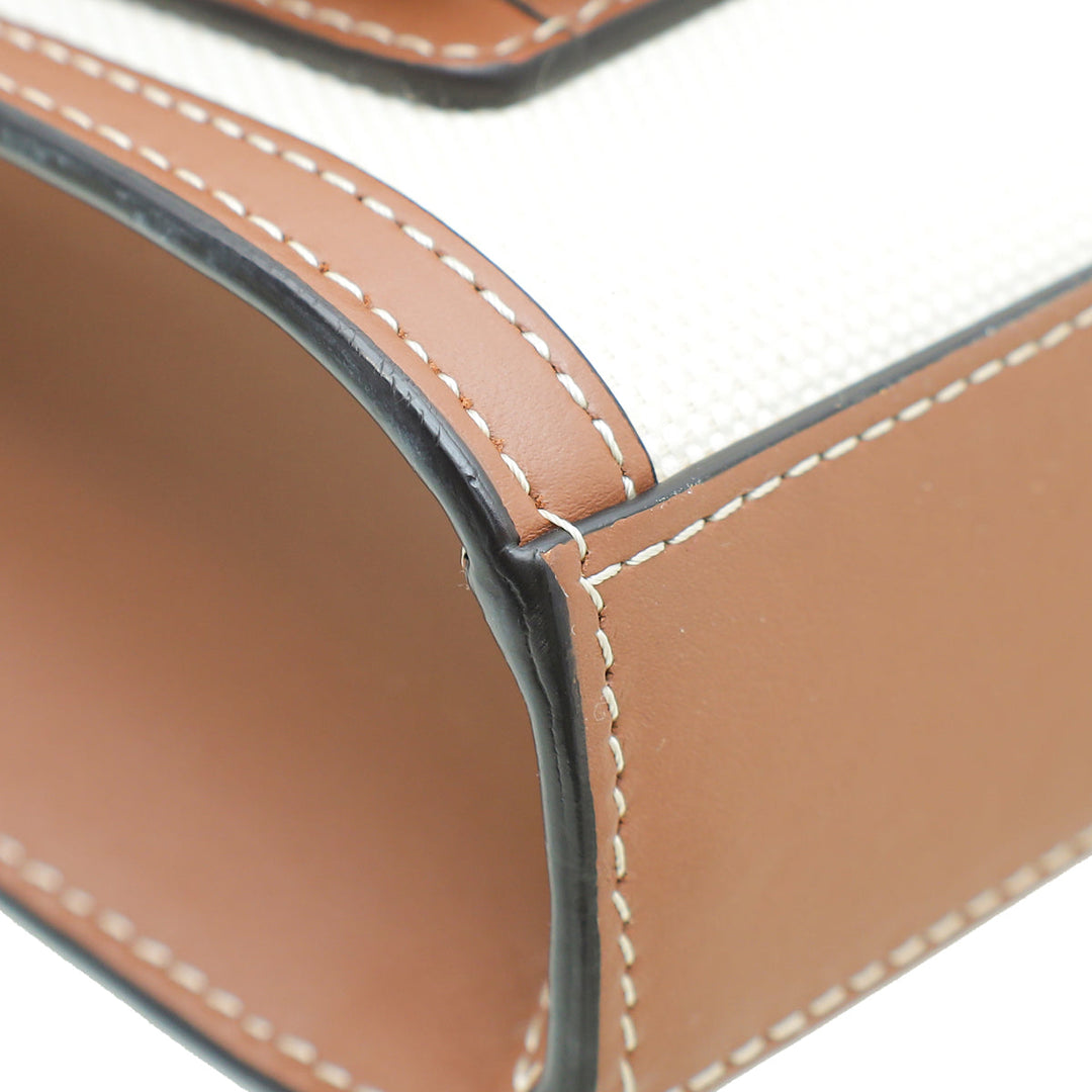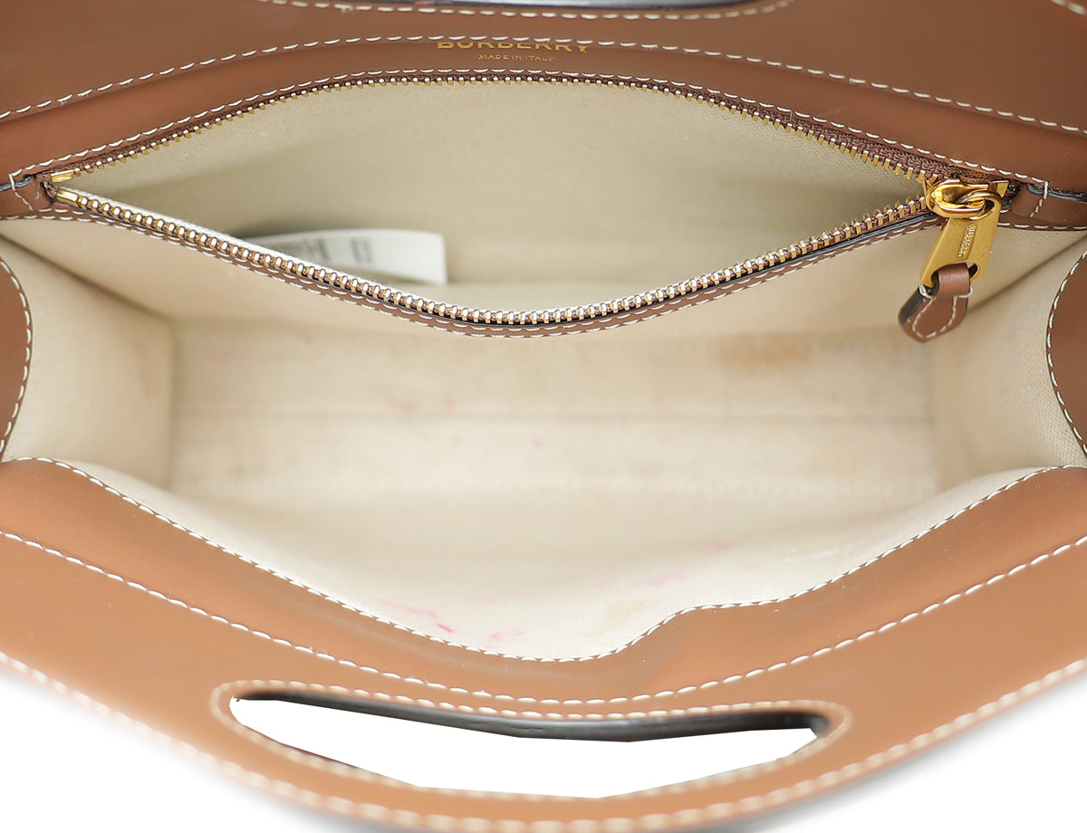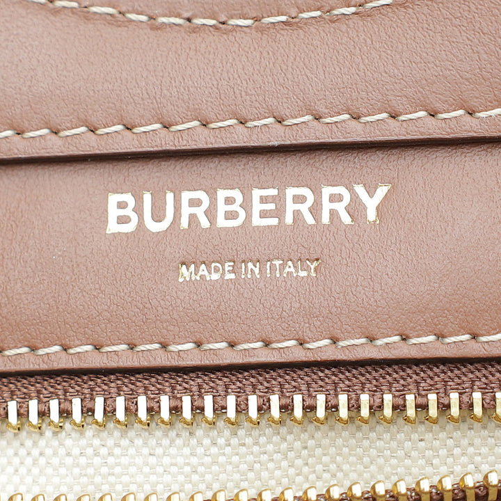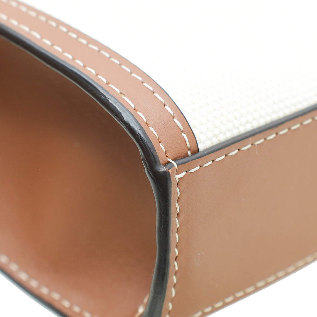 Crafted with Natural Canvas and Leather Trim, this Burberry Pocket Mini Bag shines with its glamorous Gold Hardware. Refined with an interior zipper pocket, and an exterior flap pocket with snap closure, the versatile design can be as a shoulder bag or top handle. Showcasing a unique serial number, dust bag, and stylish measurements of W x D x H, this gently-used piece is in very good condition (7.5/10) with few scratches on the corners and displaying the expected signs of wear inside.