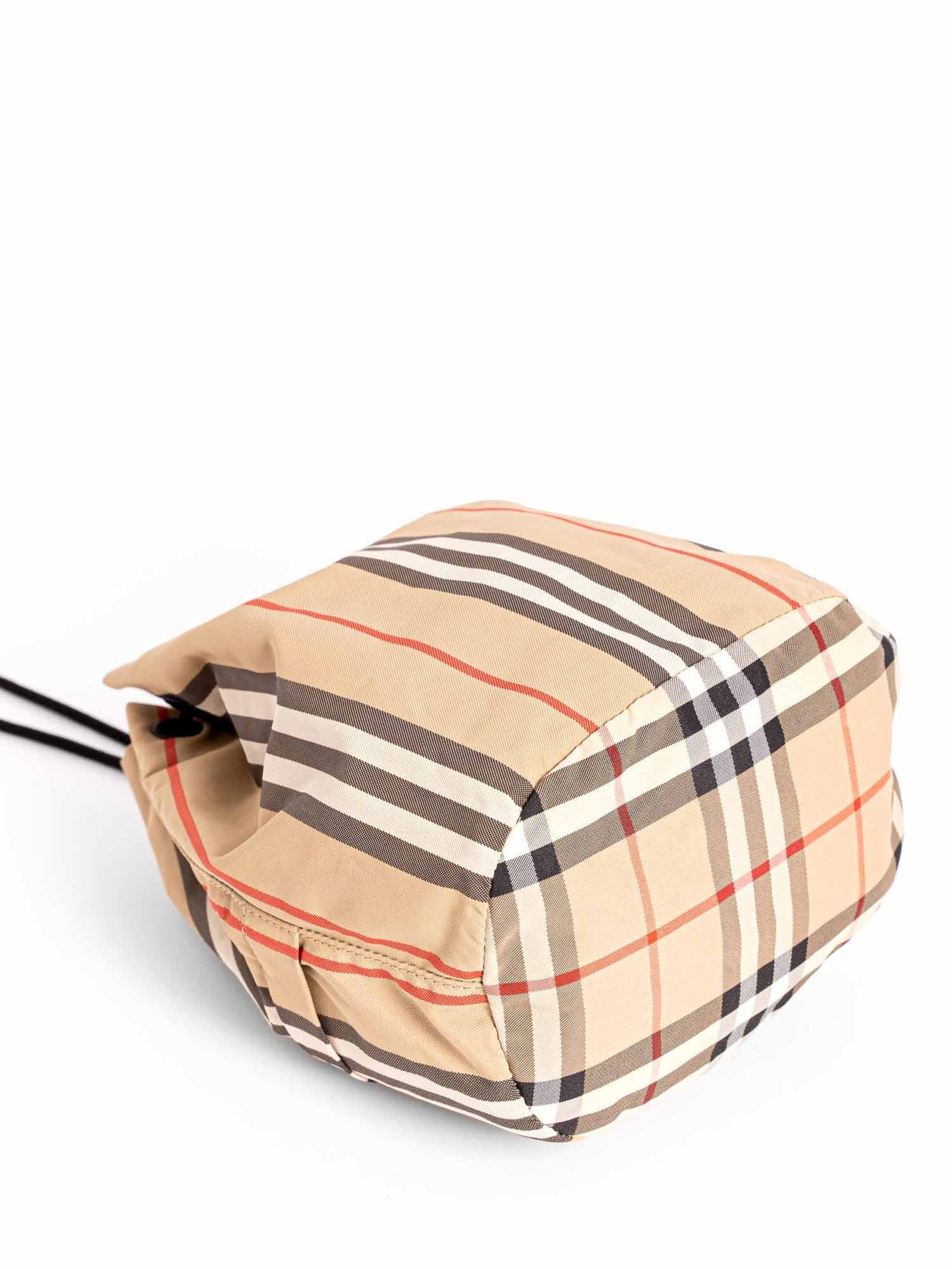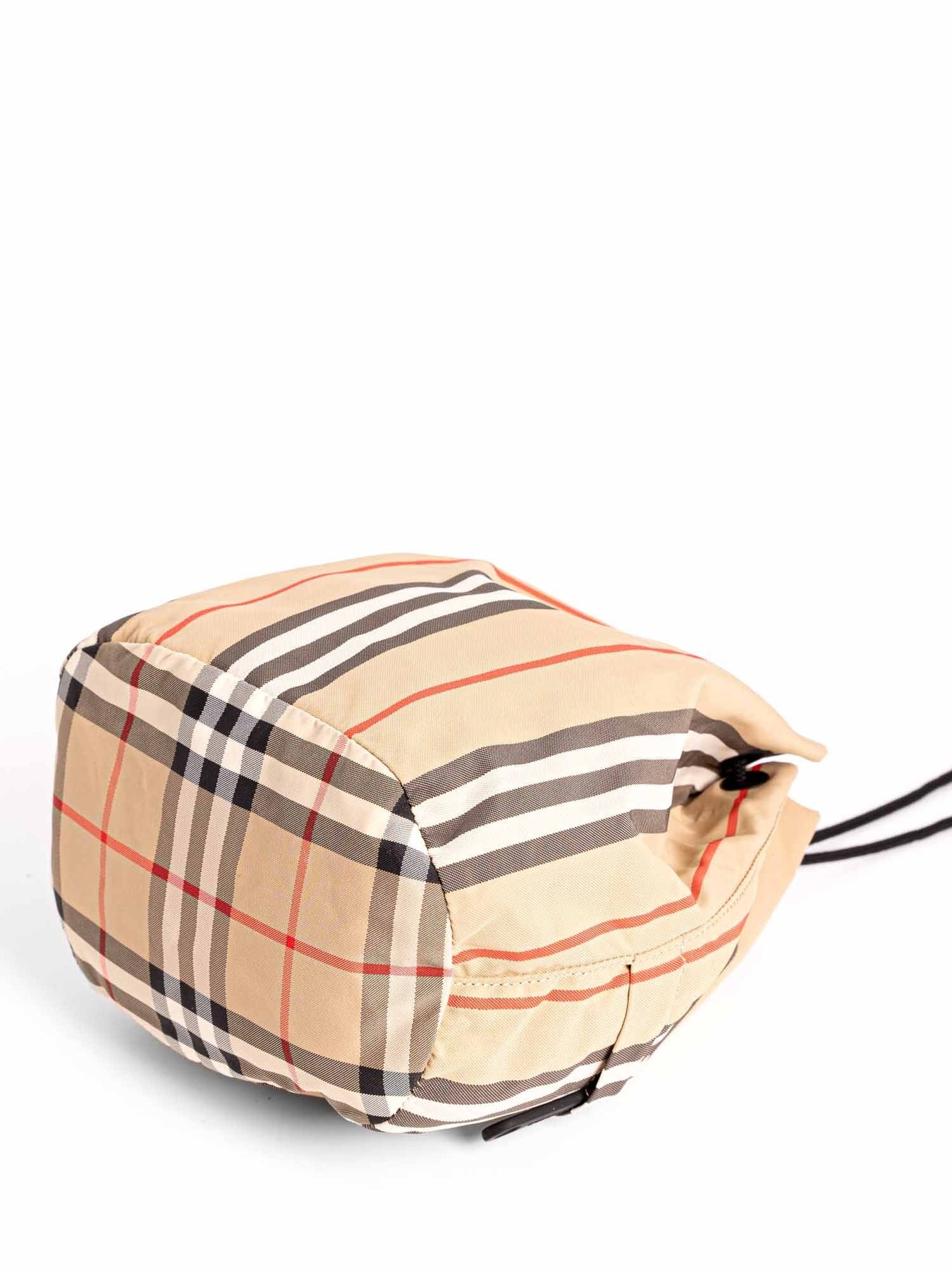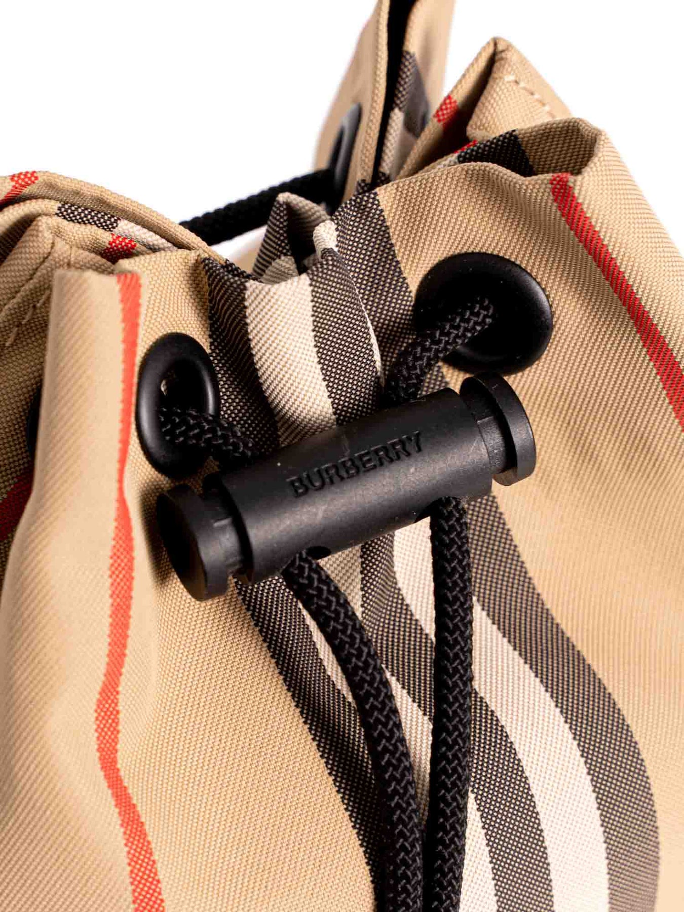 Burberry Logo Bucket Bag or 100 % of your . It is in specially treated waterproof canvas with the signature nova check print and a black adjustable drawstring. It features a frontal Burberry logo and a zippered pocket.