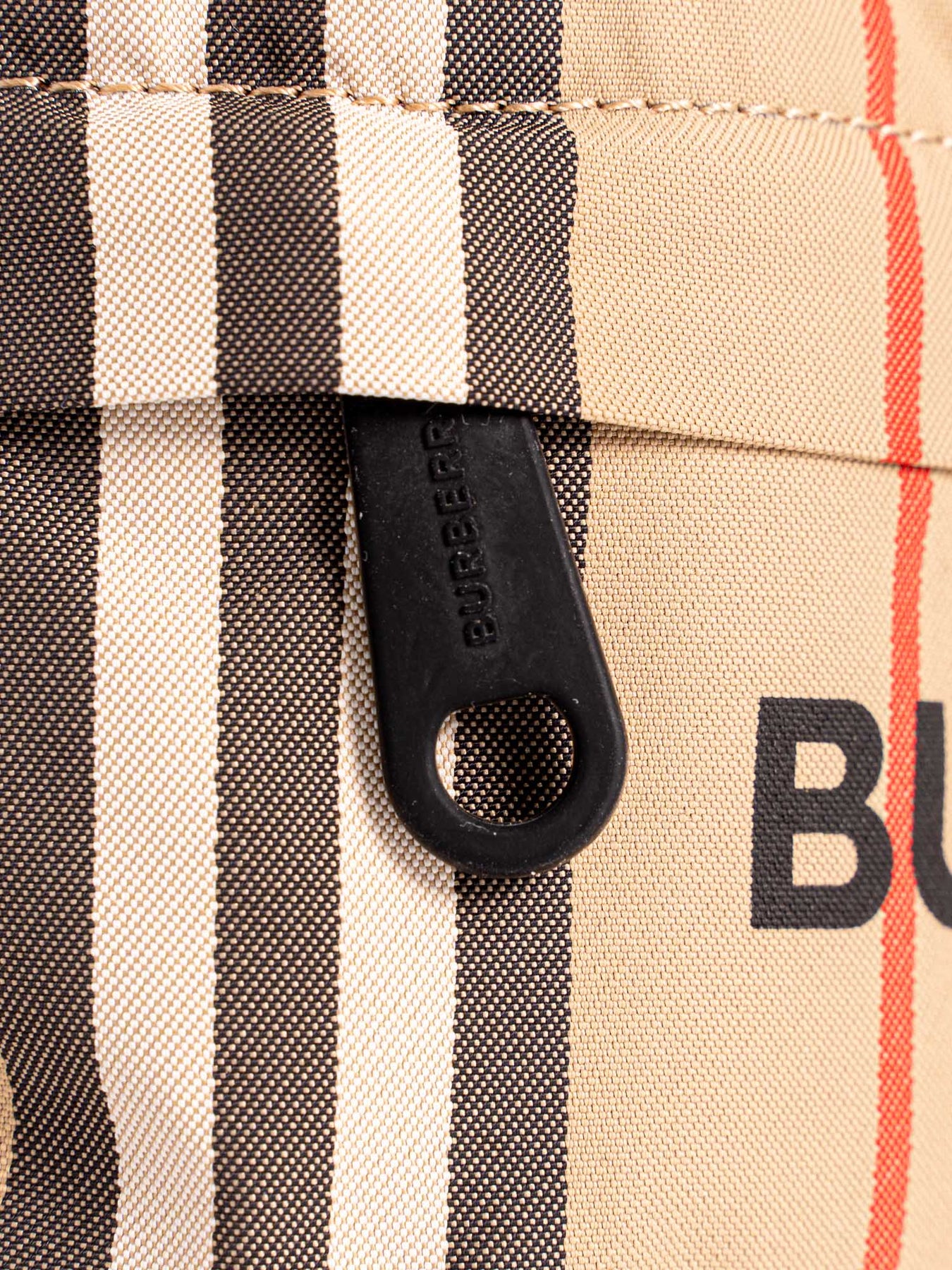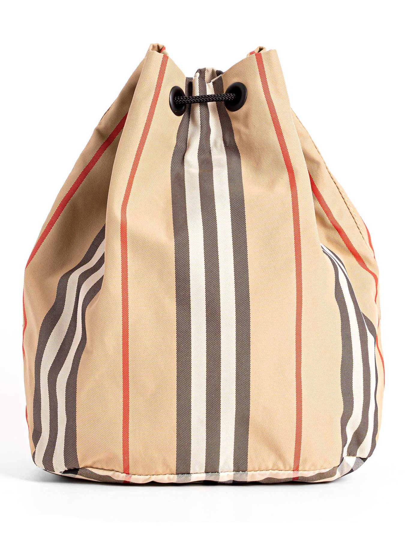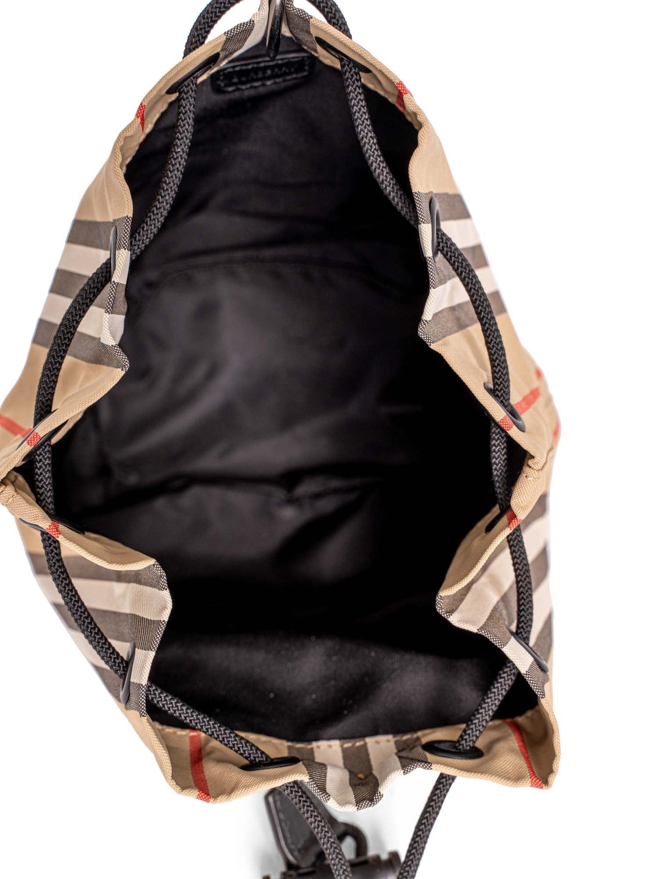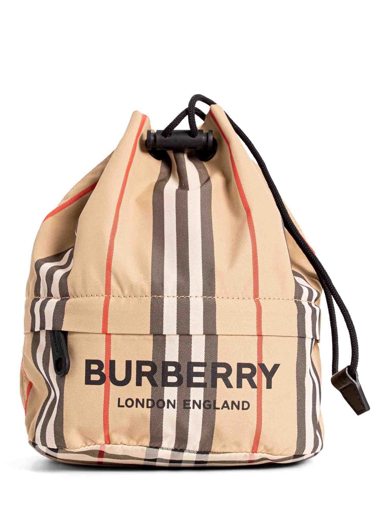 Burberry Logo Bucket Bag or 100 % of your . It is in specially treated waterproof canvas with the signature nova check print and a black adjustable drawstring. It features a frontal Burberry logo and a zippered pocket.