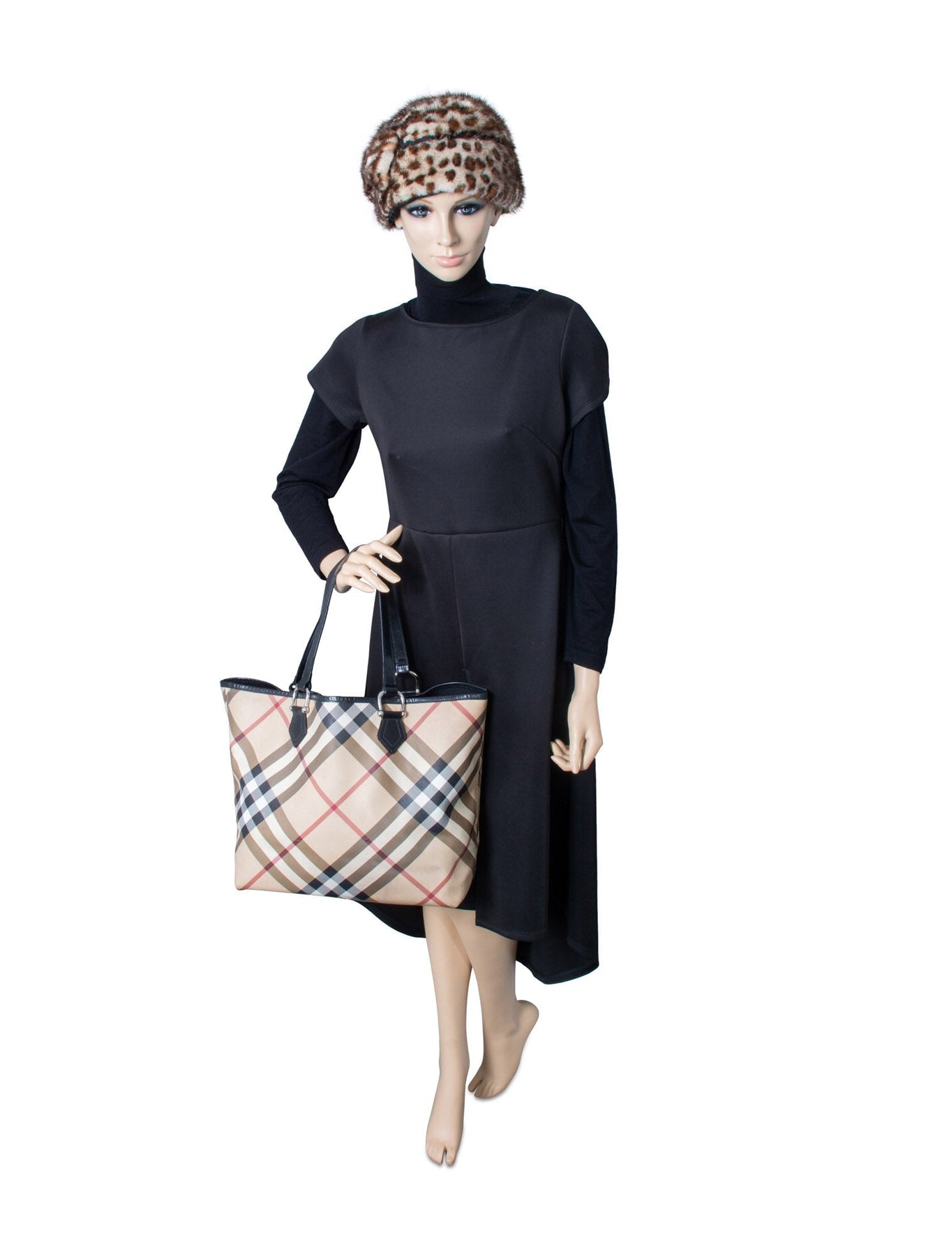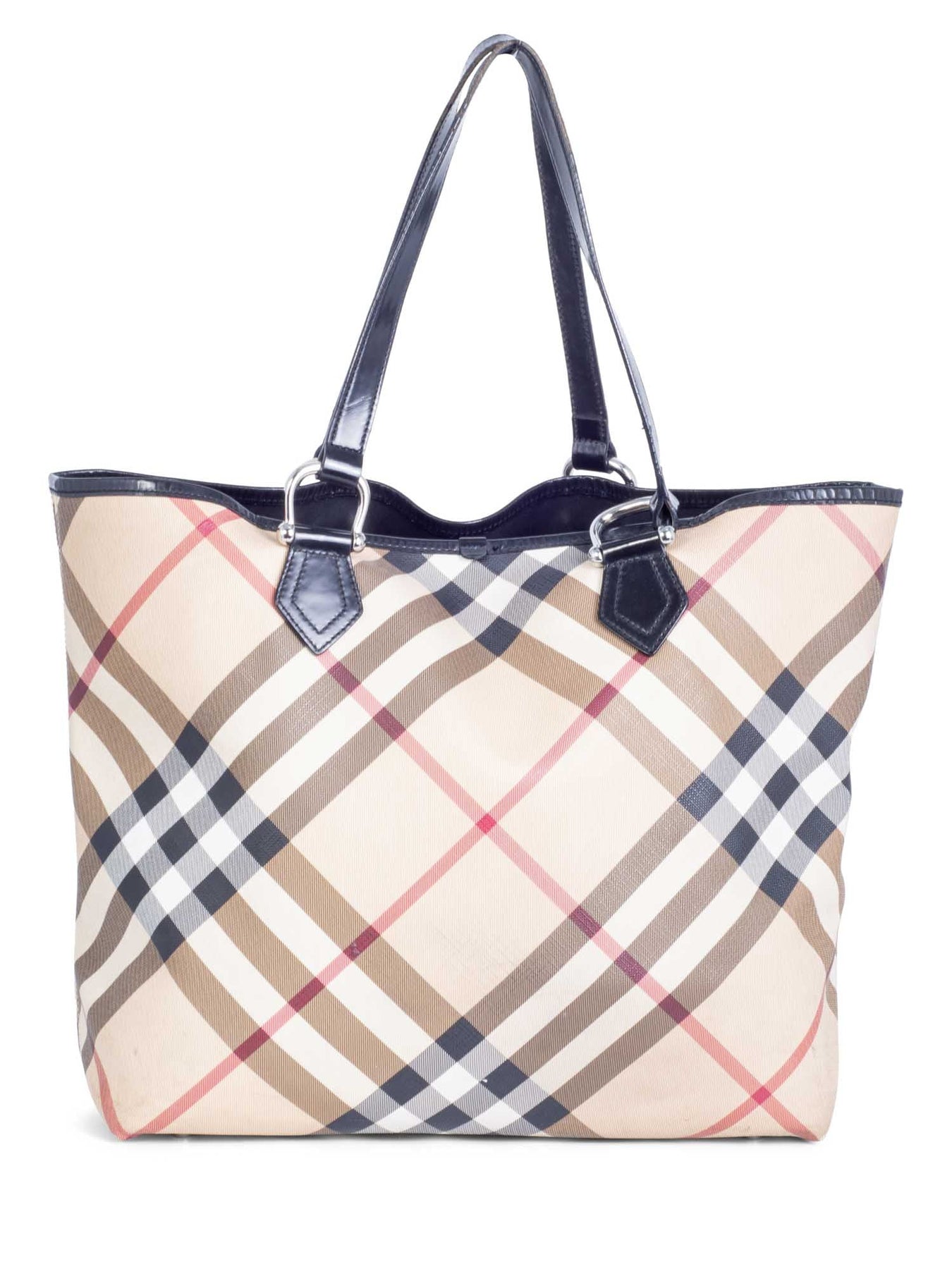 Burberry Nova Check Canvas Neverfull Tote Bag or . This Burberry tote is crafted in specially treated canvas with nova check pattern throughout, featuring silver tone hardware and black leather trim and handles. This bag opens to one large compartment with one zippered pocket inside and removable liner.