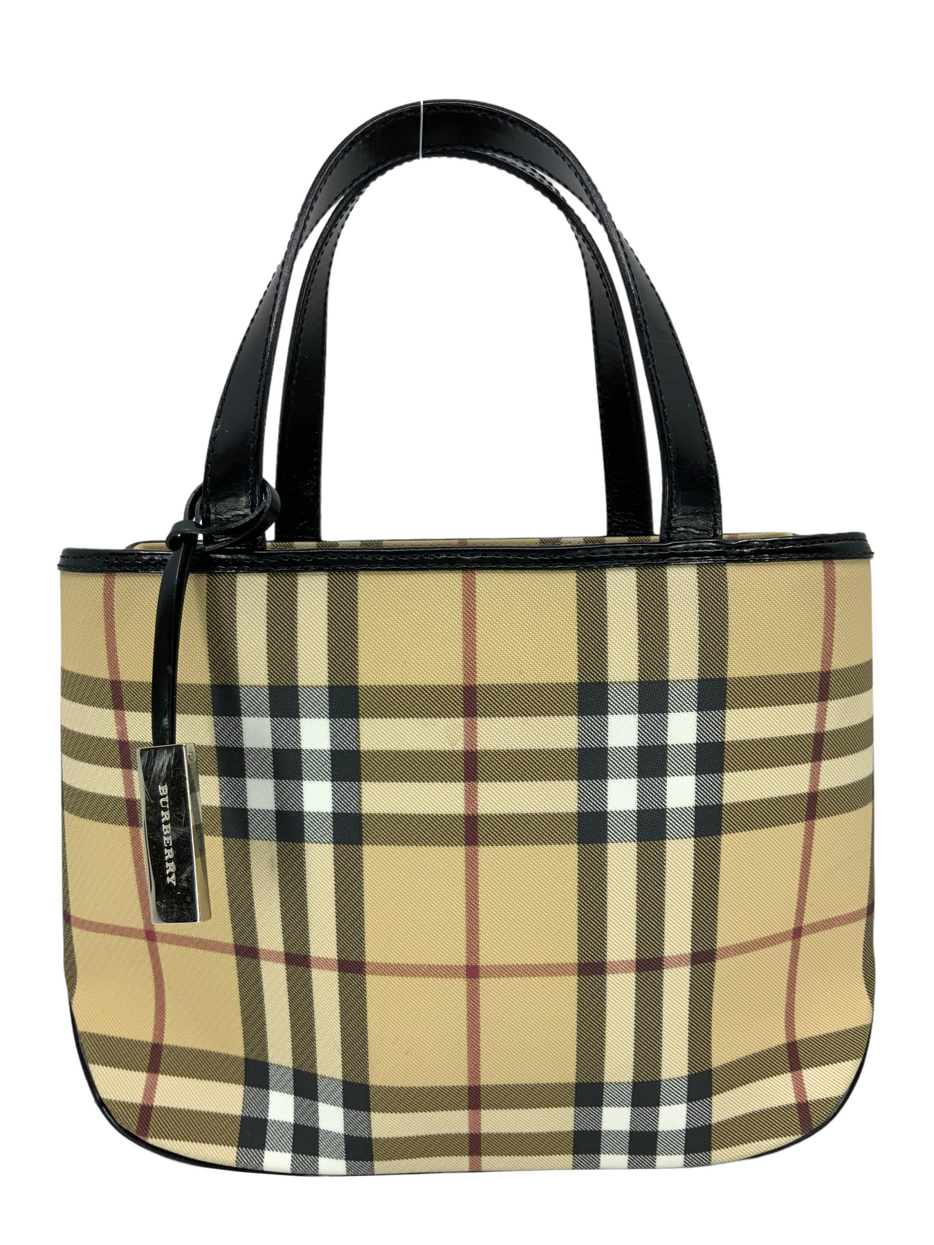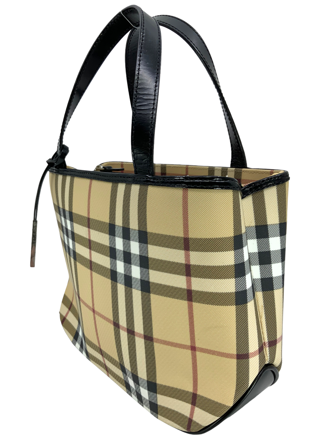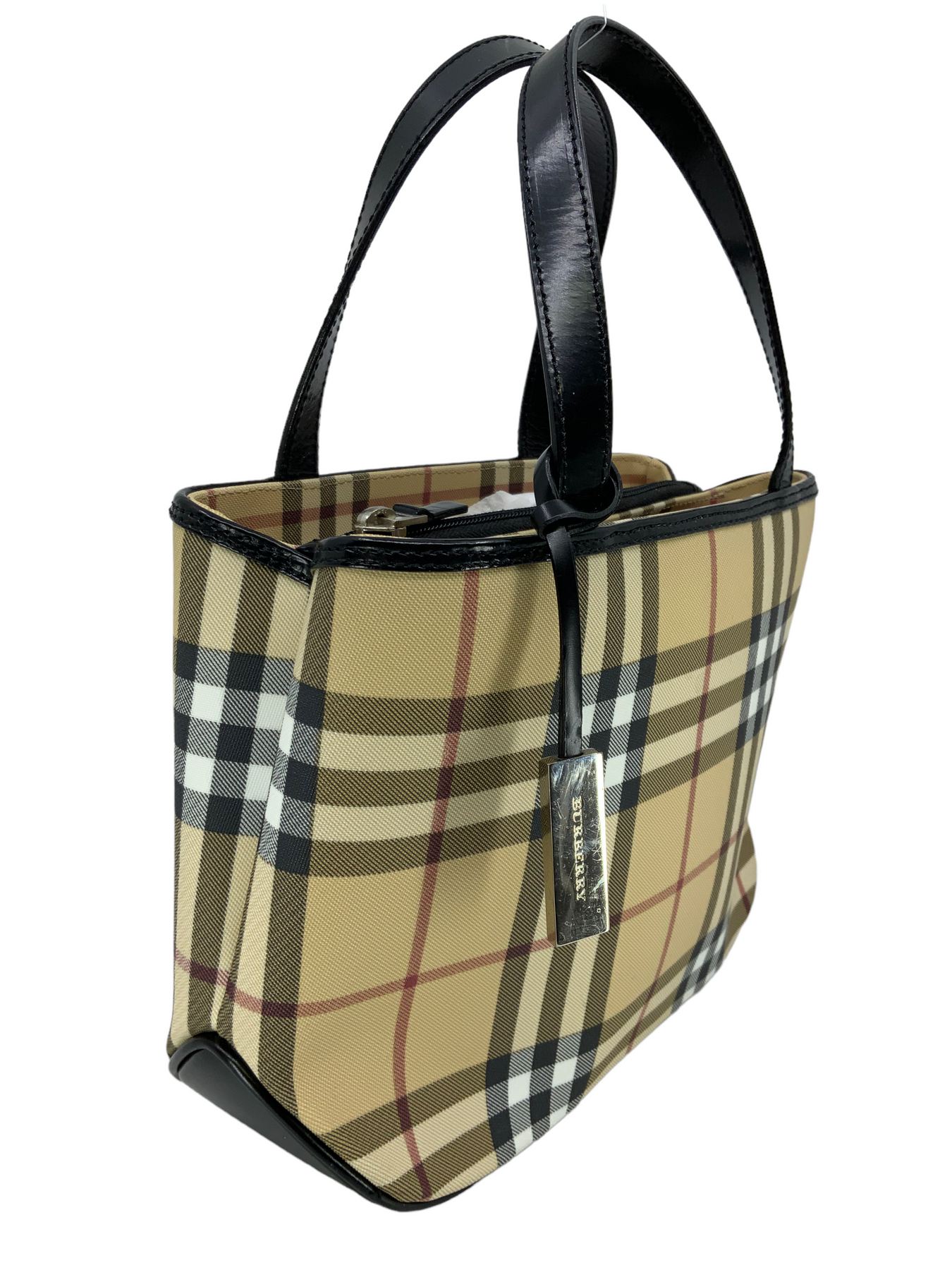 Add to your collection this Burberry Nova Check Canvas Small Tote Bag crafted from durable Haymarket coated canvas with a smooth brown leather trim. This stylish bag features dual flat leather top handles and silver-tone hardware, including a signature engraved logo charm
