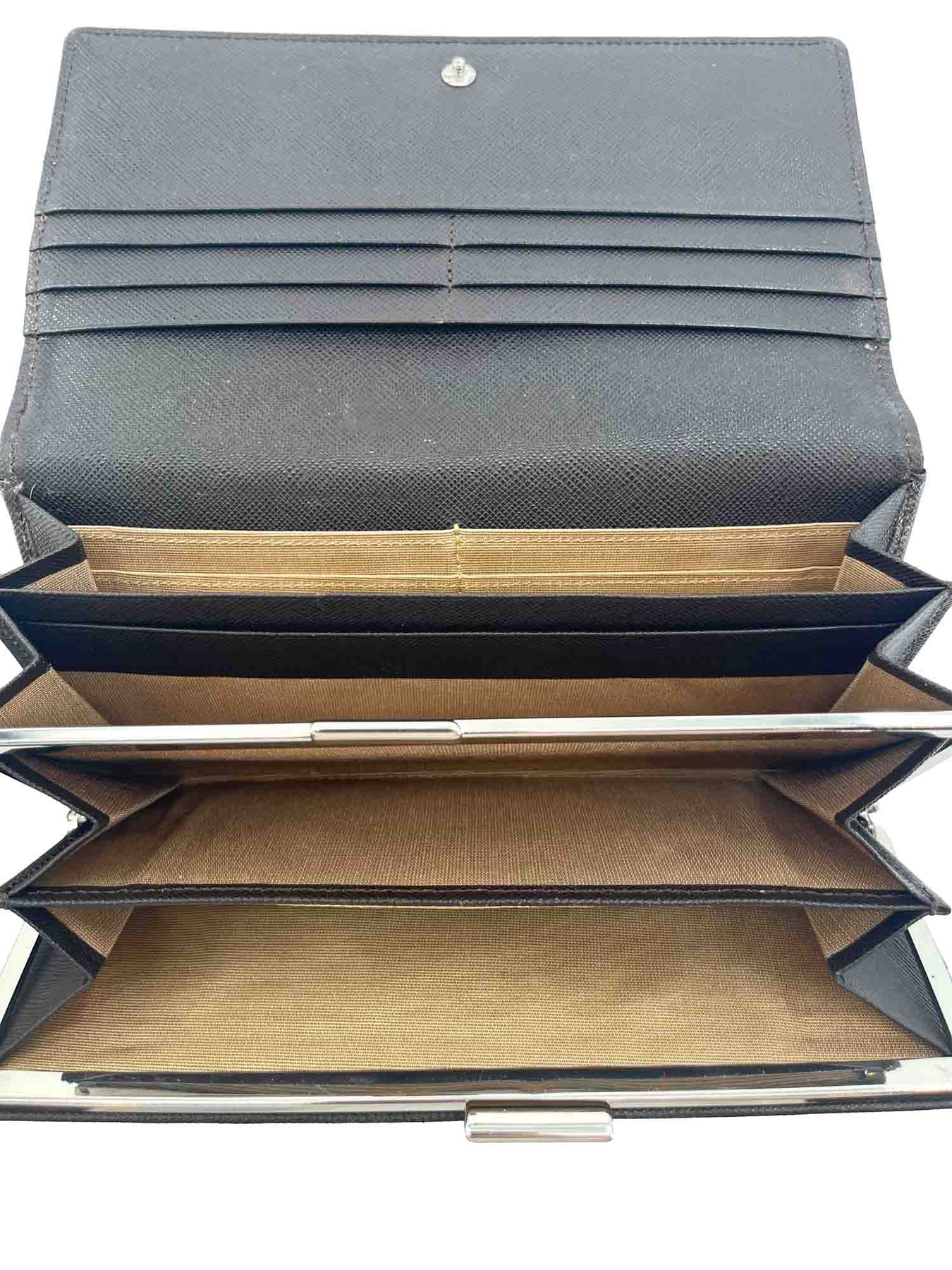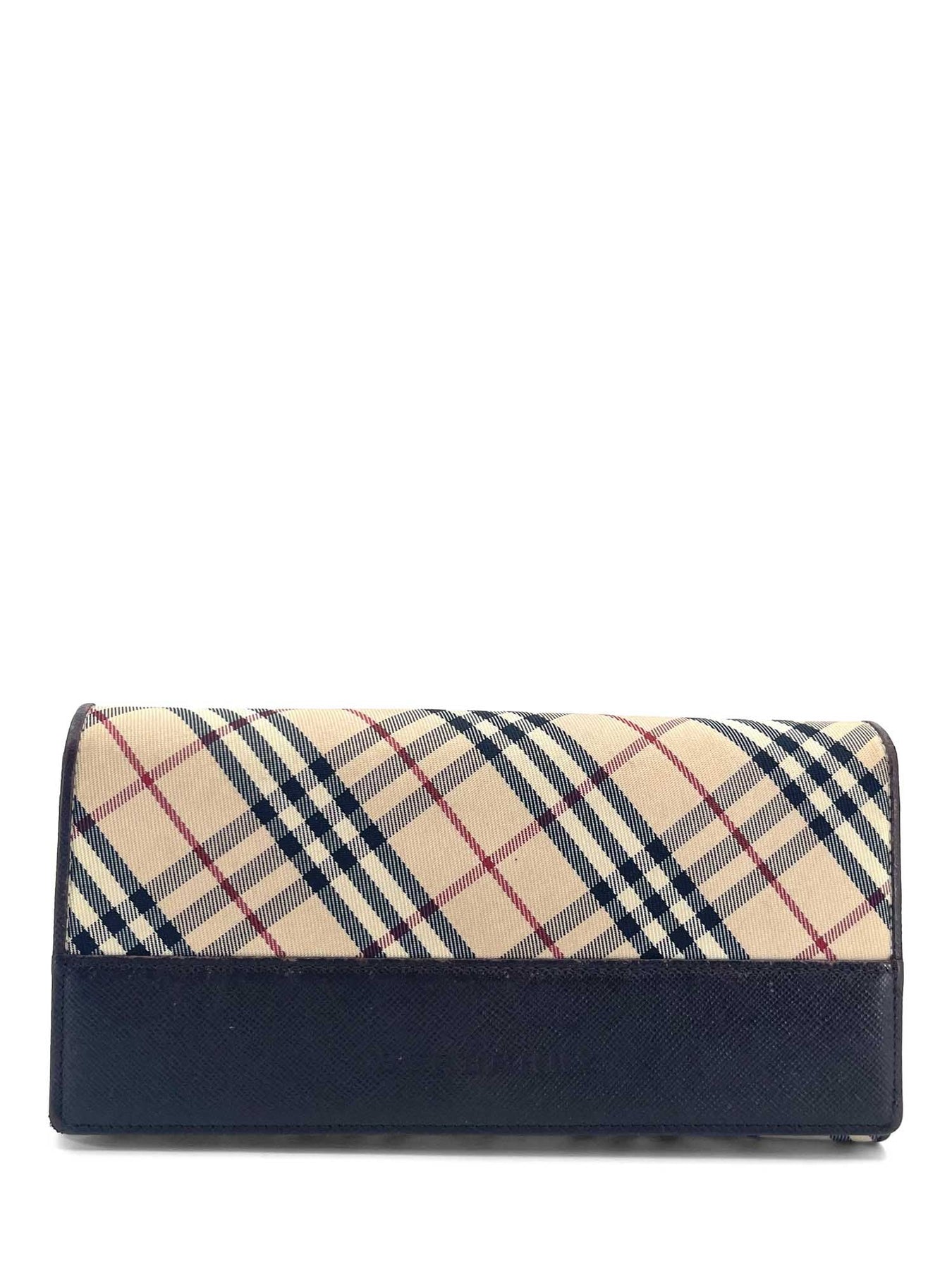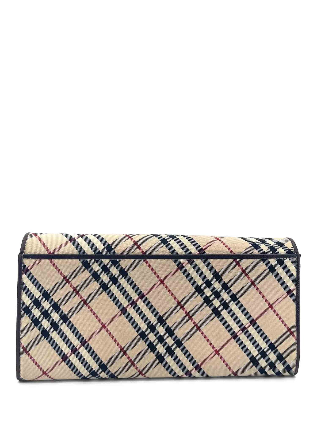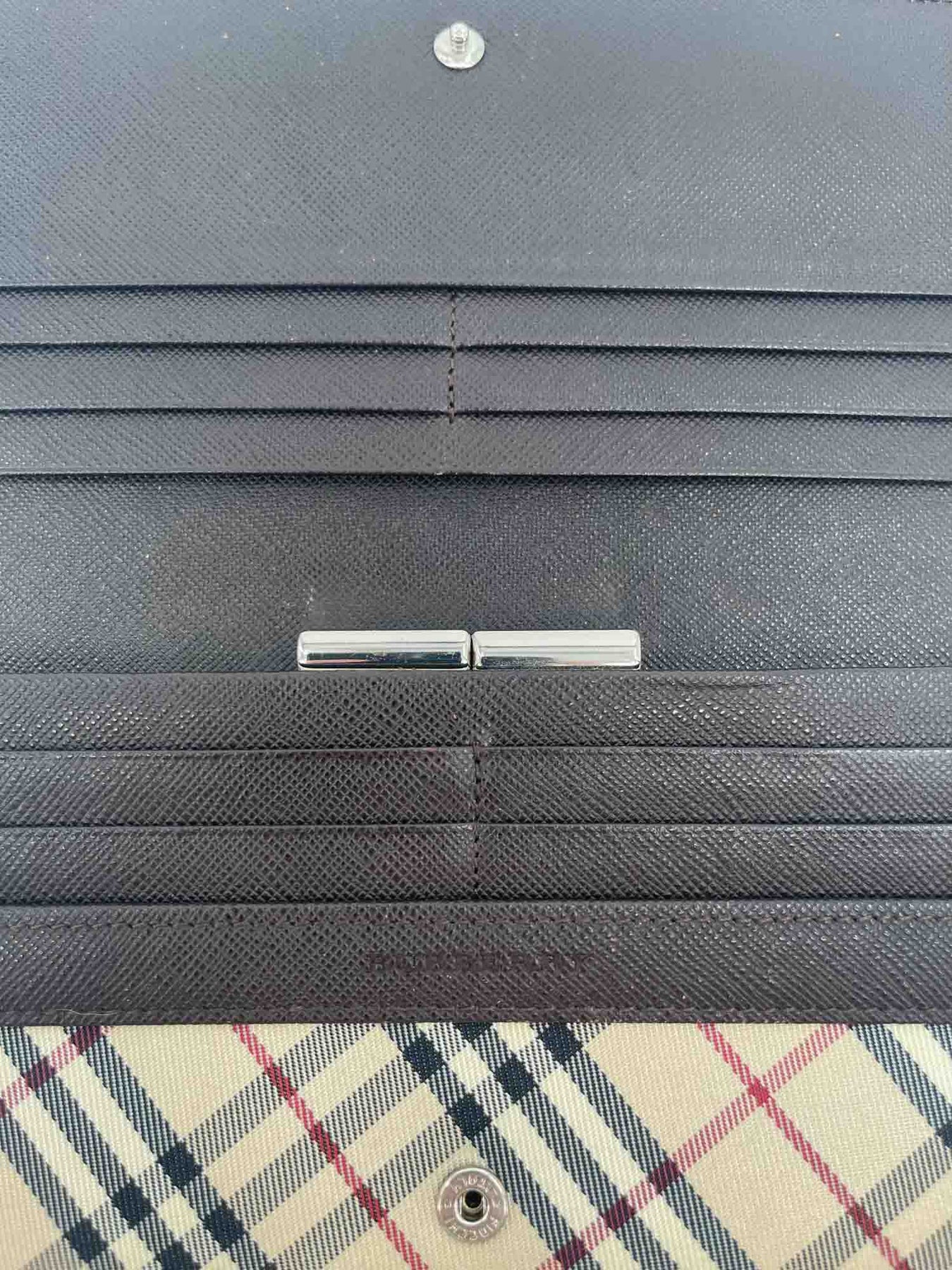 Burberry Flap Wallet or . It is in the signature nova check print with a brown leather flap embossed with the Burberry logo. The back contains a long slip pocket while the interior opens to six big bill slots and twelve card slots. It also features a kiss lock that holds two more big bill slots!