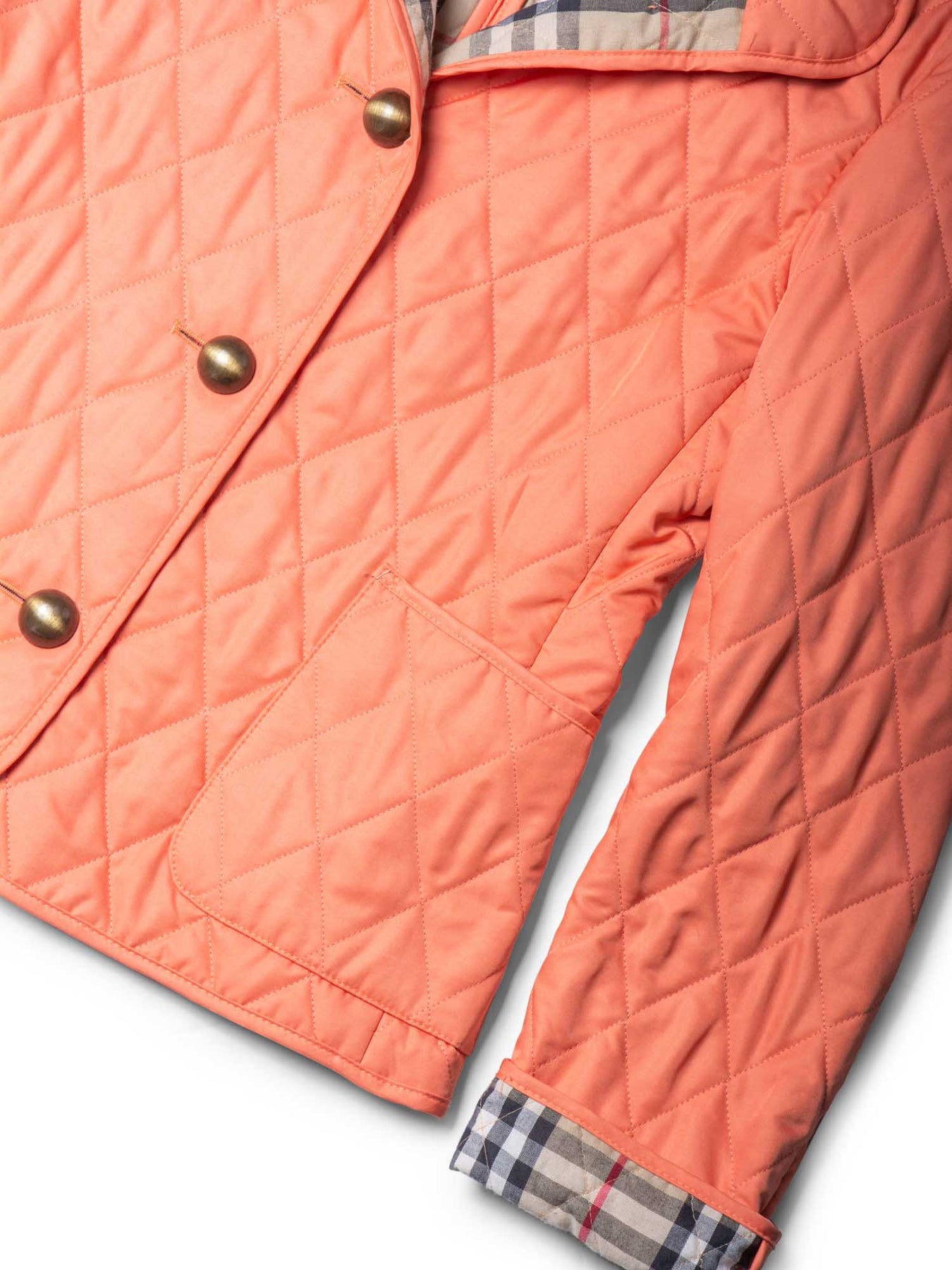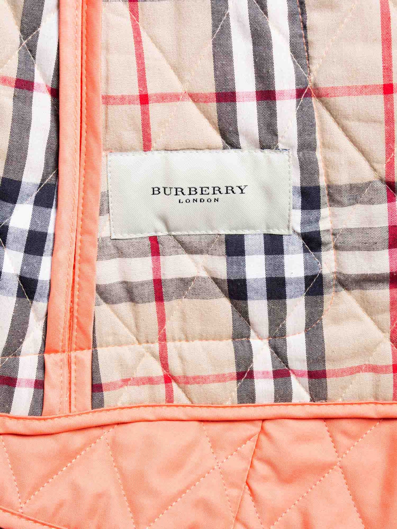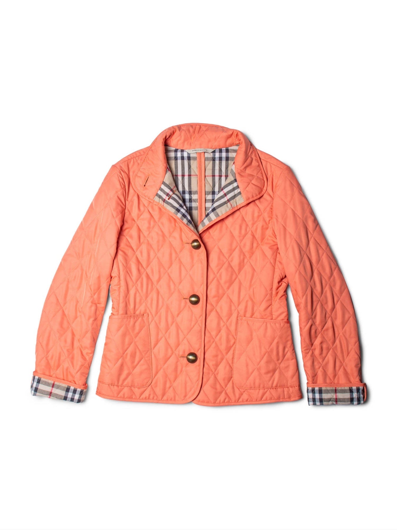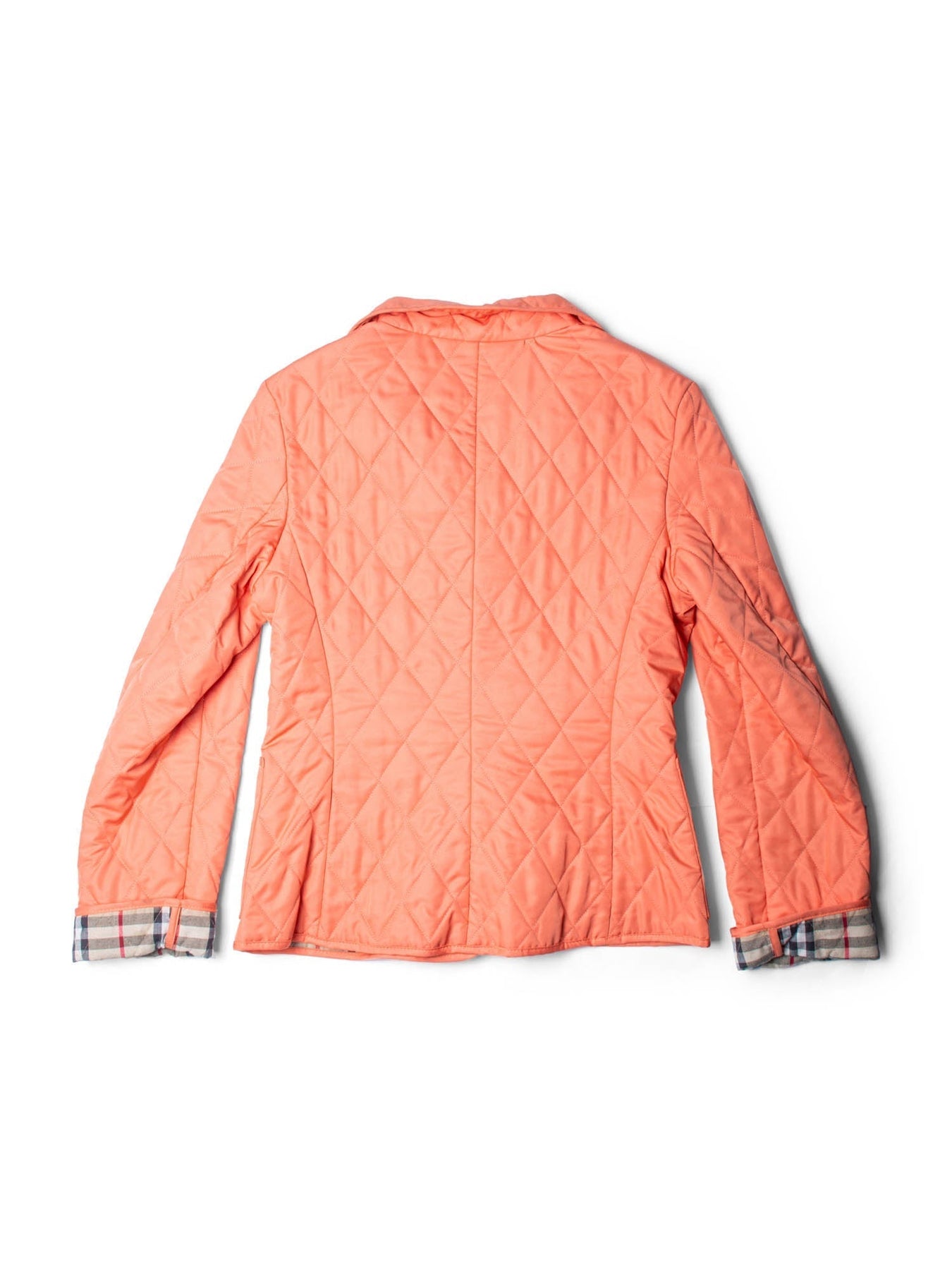 Burberry Quilted jacket or . This jacket is in a quilted orange fabric with nova check lining, two pockets, and front button closure.