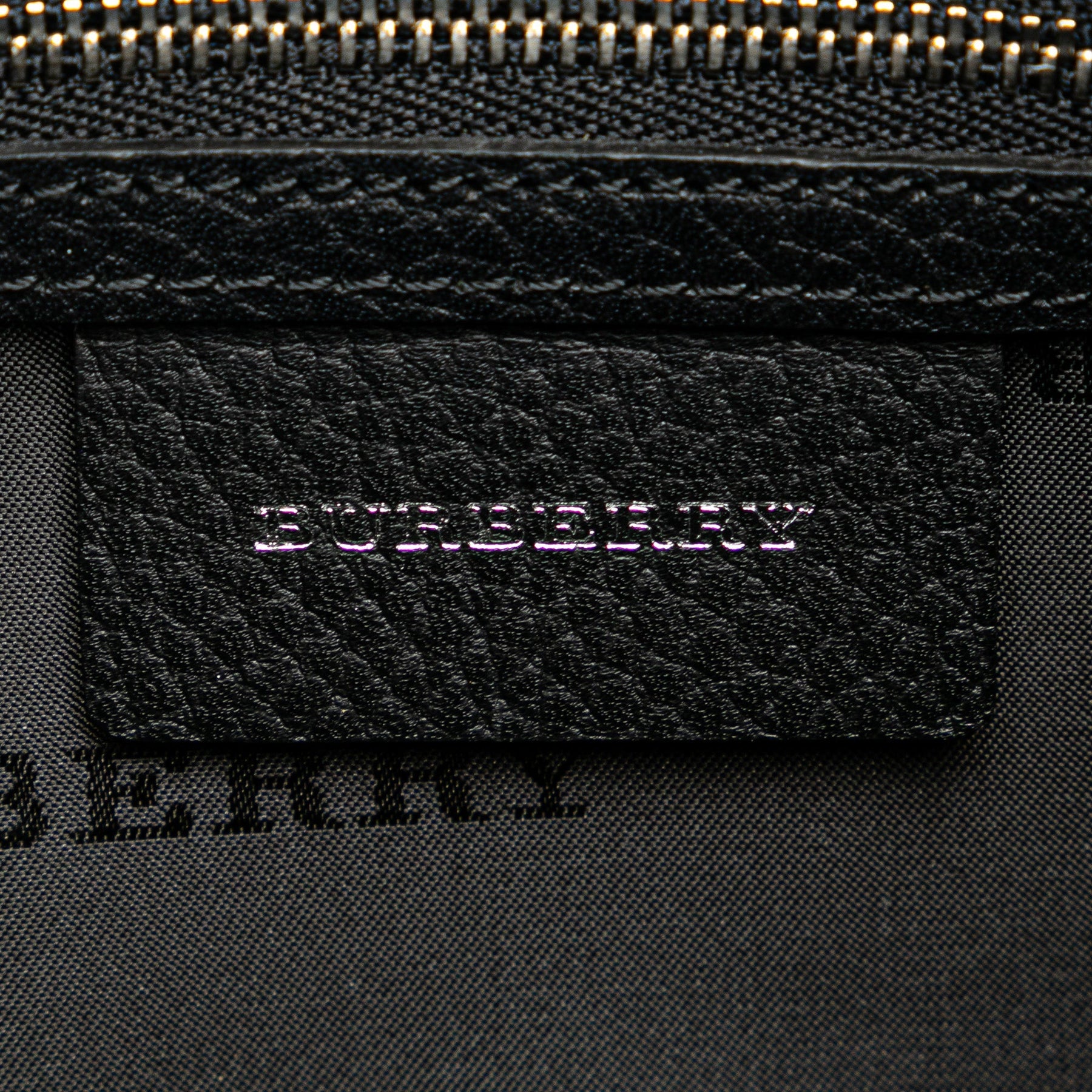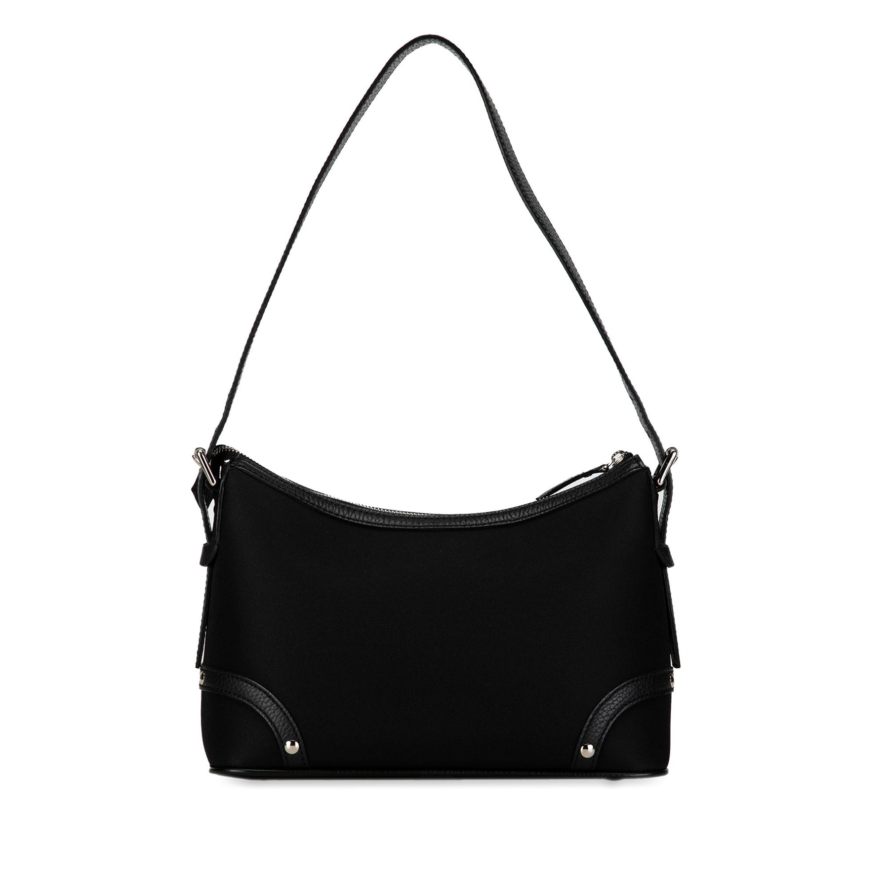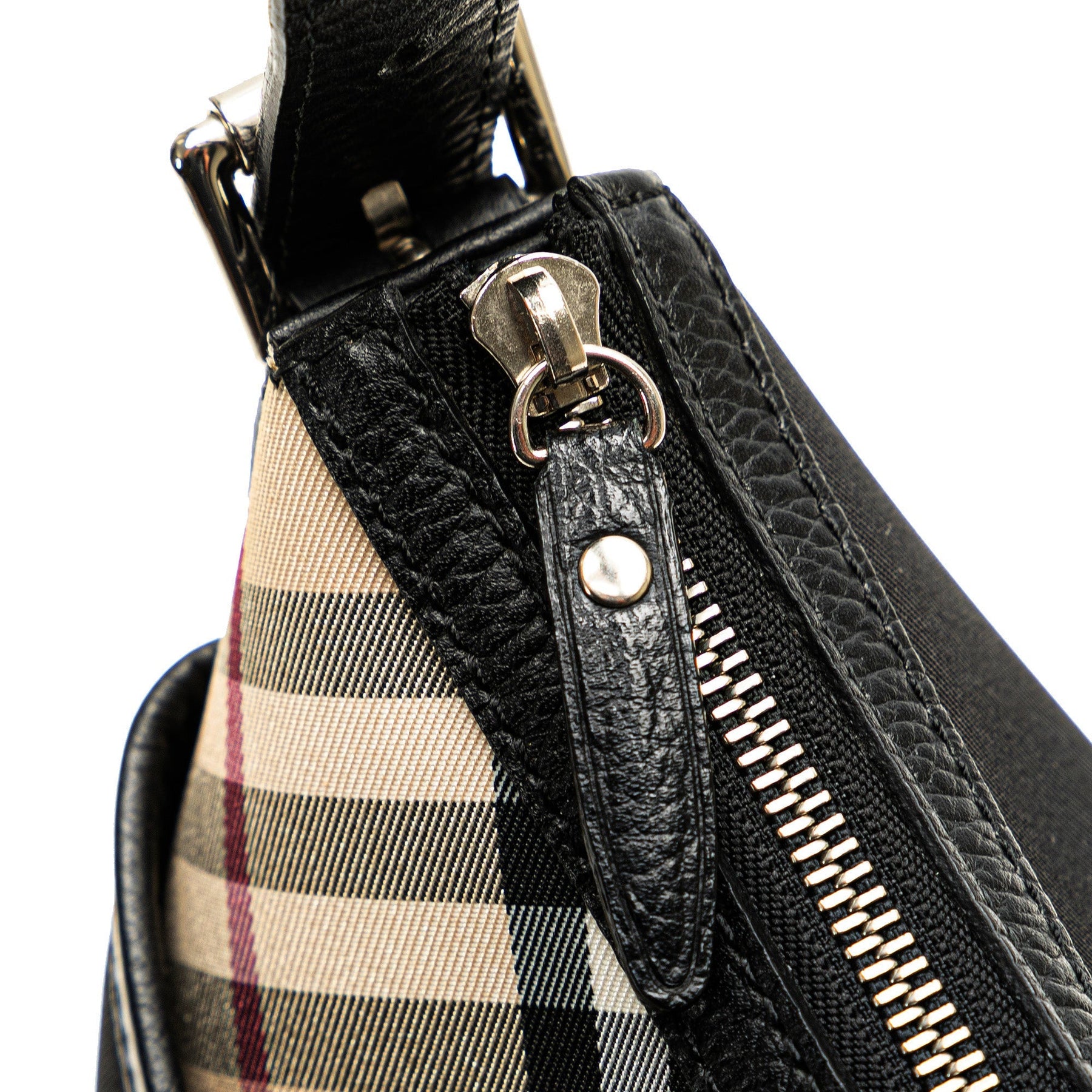 This shoulder bag features a canvas body with leather trim, a flat leather shoulder strap, an exterior front slip pocket, a top zip closure, and interior zip and slip pockets.