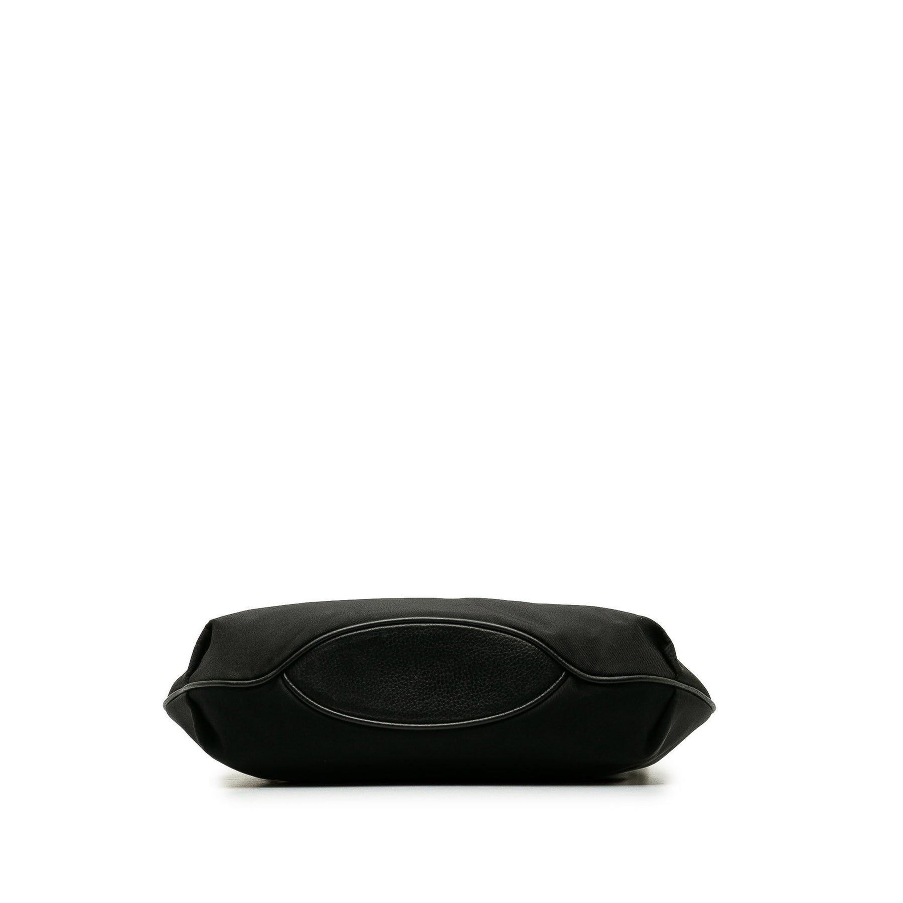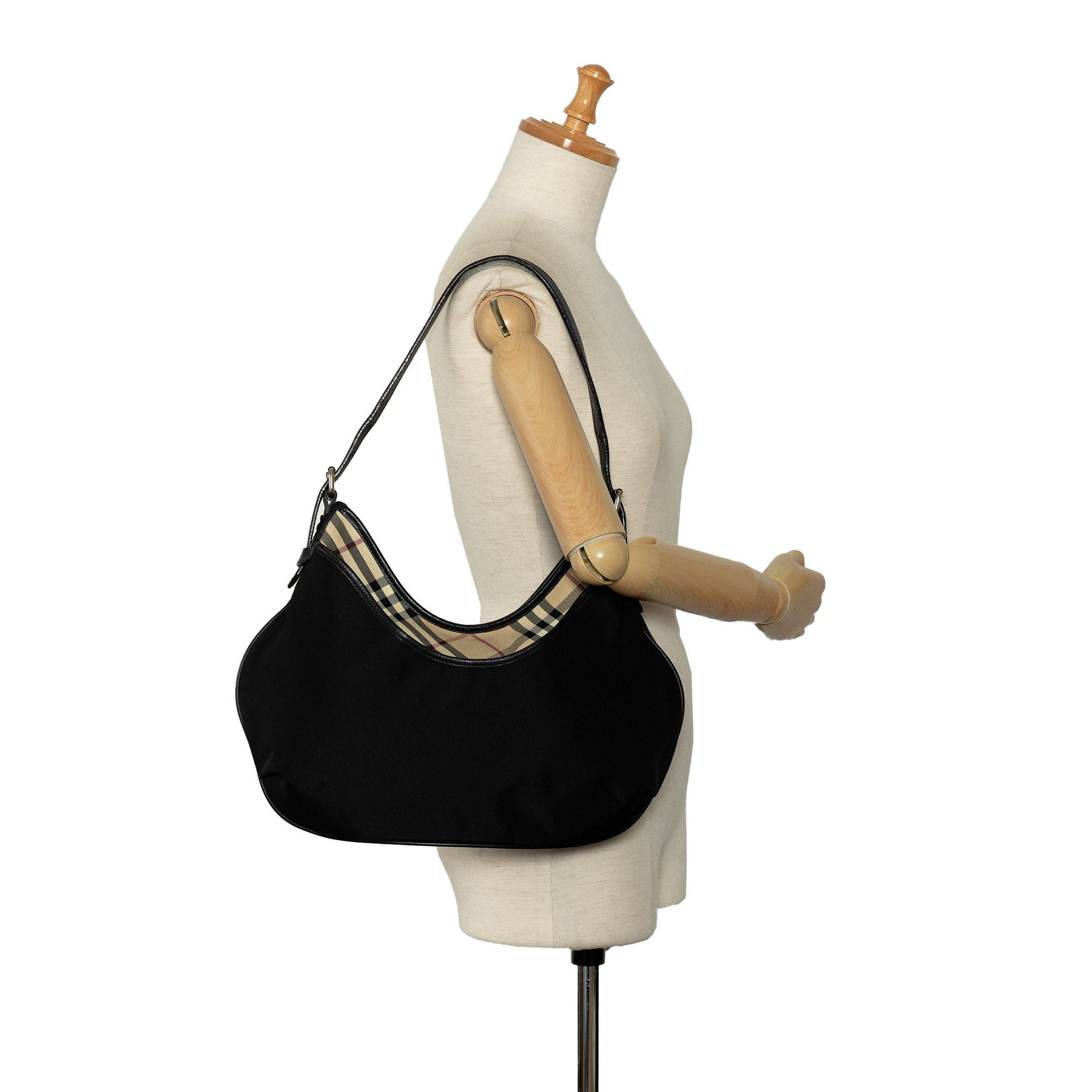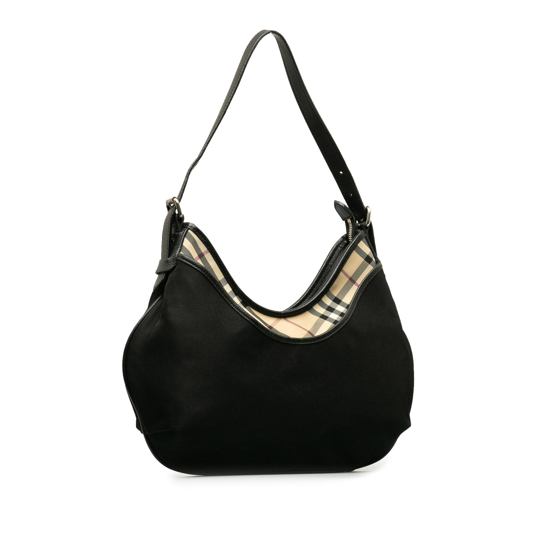 This shoulder bag features a nylon body with plaid canvas and leather trim, an adjustable flat leather shoulder strap, a top zip closure, an exterior front slip pocket, and interior zip and slip pockets.