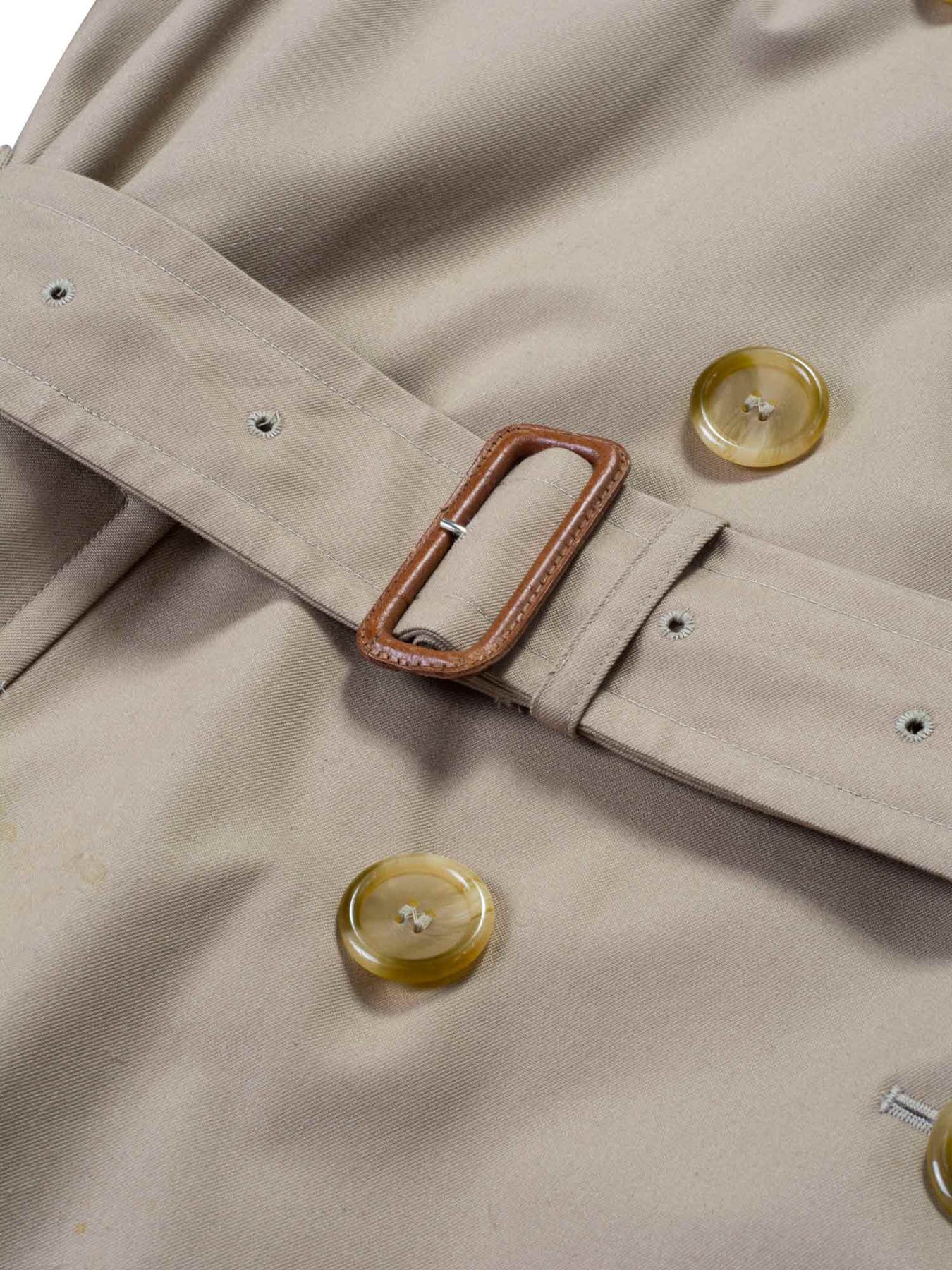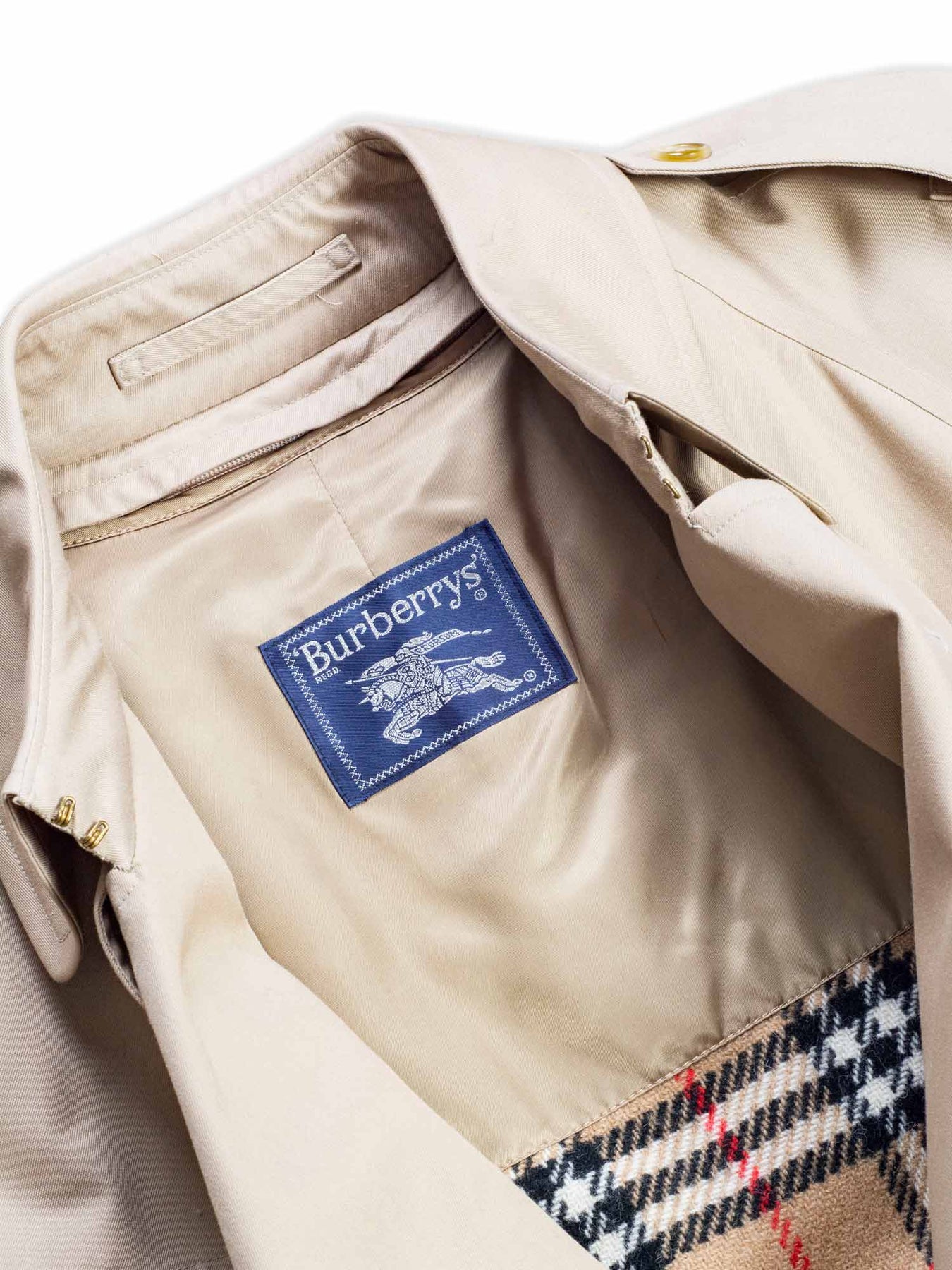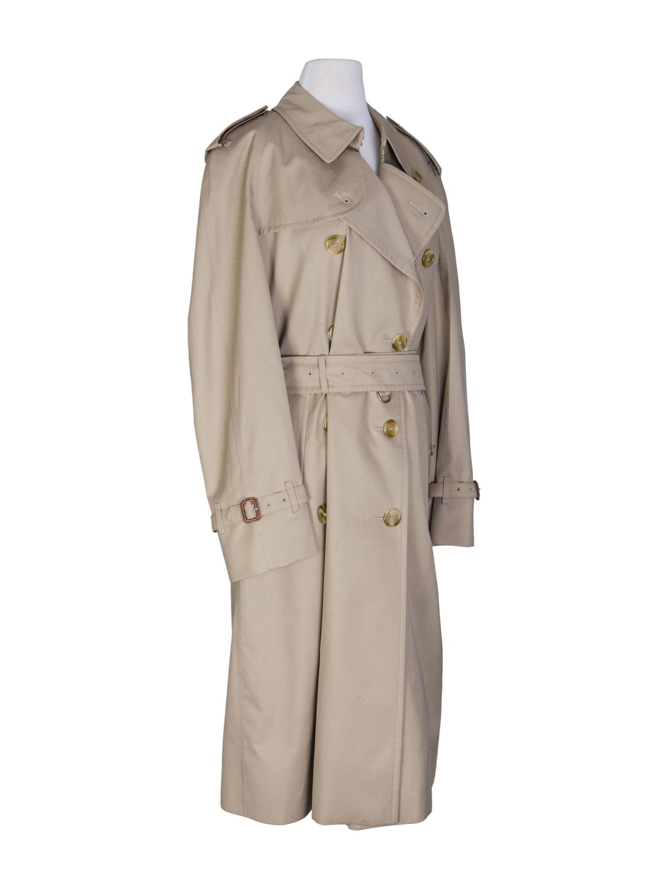 Burberry Nova Check Trench or .  This Burberry coat is in beige exterior with belted waist and buttons along the front. It features a removable nova check wool lining and multiple pockets.