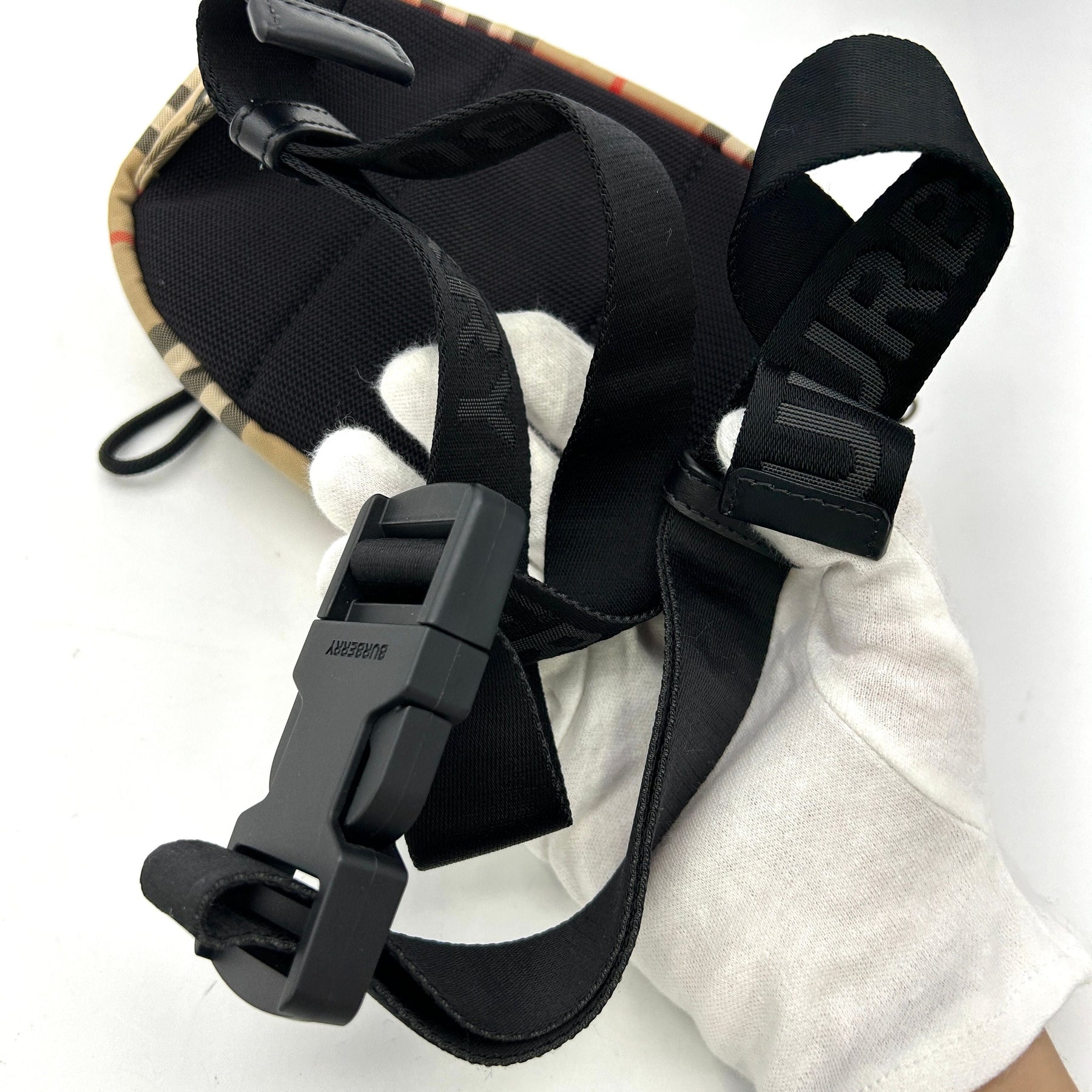 This BURBERRY Nylon Vintage Check Small Cannon Bum Bag in Archive Beige is a must-have for fashion-forward individuals seeking both style and practicality. The bag features Burberry's iconic vintage check pattern, crafted from durable nylon for everyday use. It includes a convenient zipper closure and an adjustable strap for versatile wear. This used designer handbag is an exceptional addition to any collection, appealing to those who adore vintage Burberry bags and value timeless style.