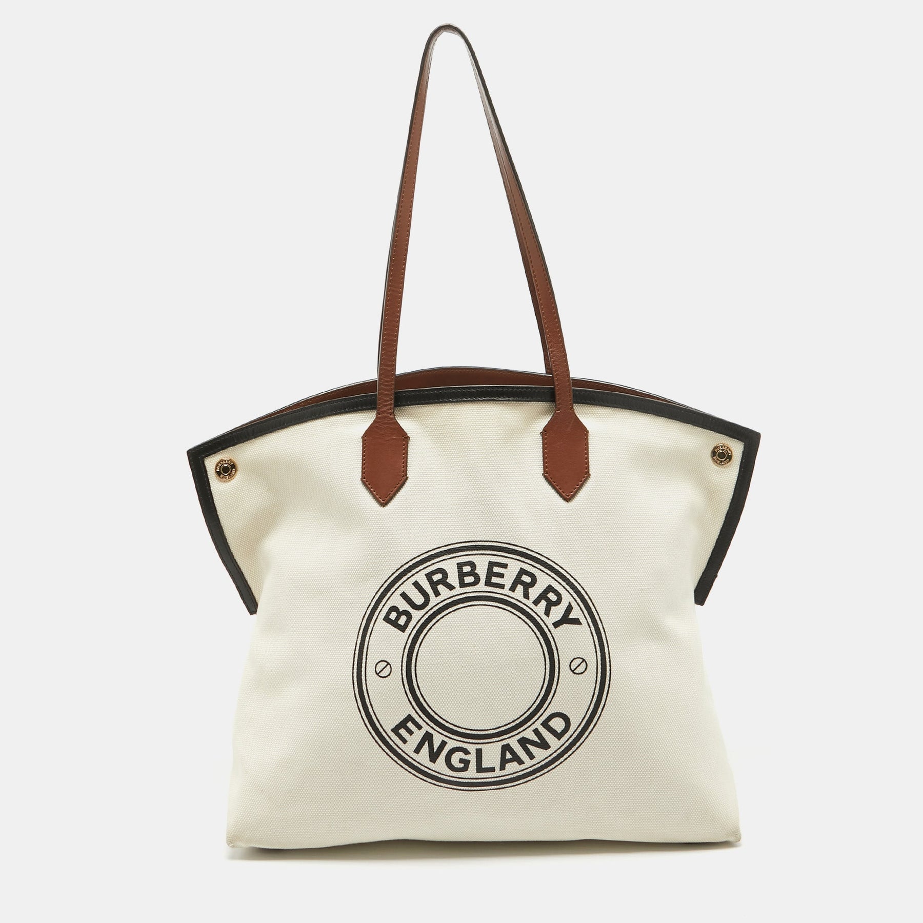 With a refined construction and contemporary shape, this Burberry tote is ideal for everyday use. Its pointed edges at the top elevated the silhouette and gold tone accents add to its charm. Crafted from canvas, it flaunts dual handles at the top to carry it around easily and the brand signature on the front makes it easily recognizable. The spacious interior of the bag adds good functionality.