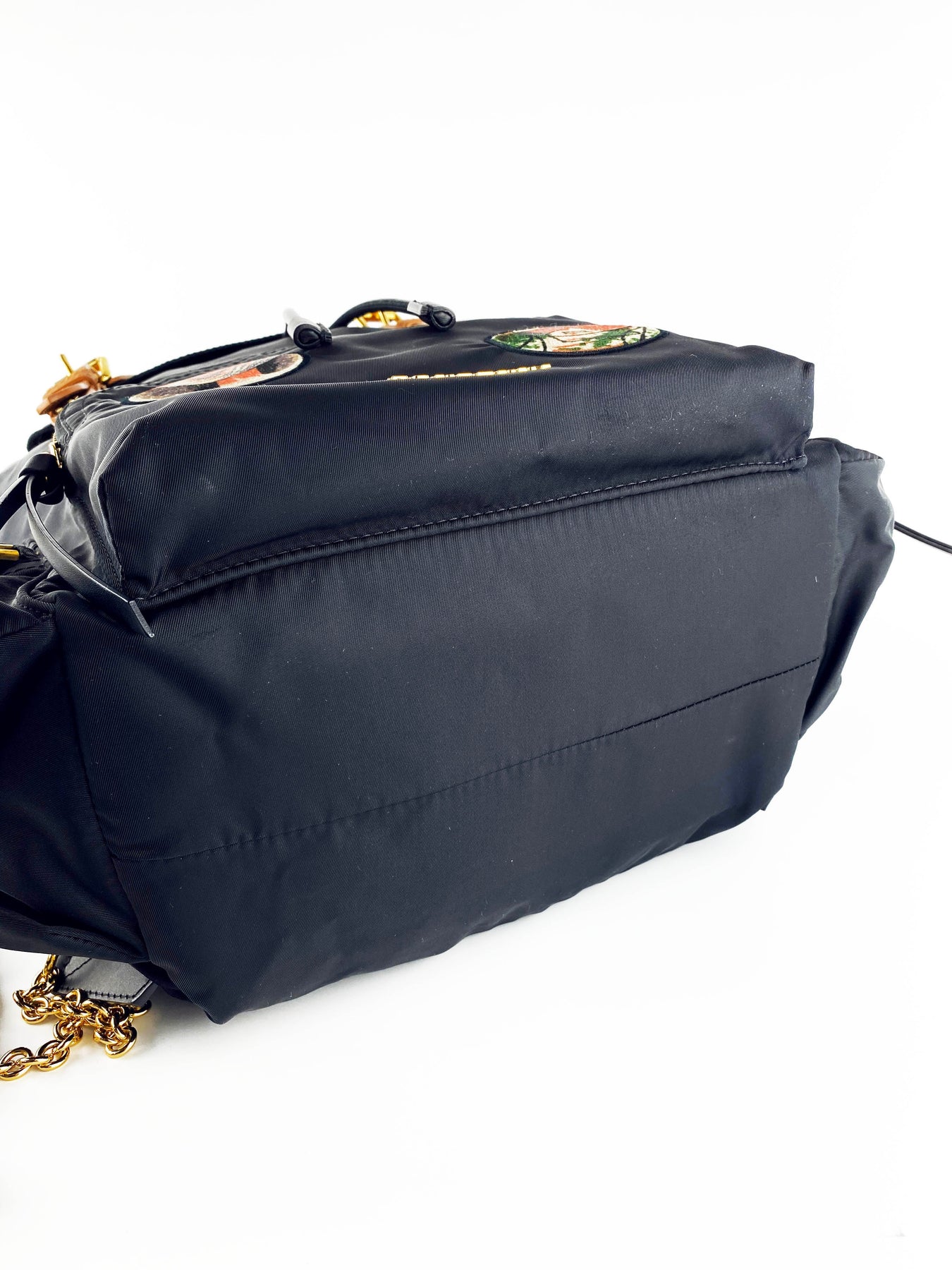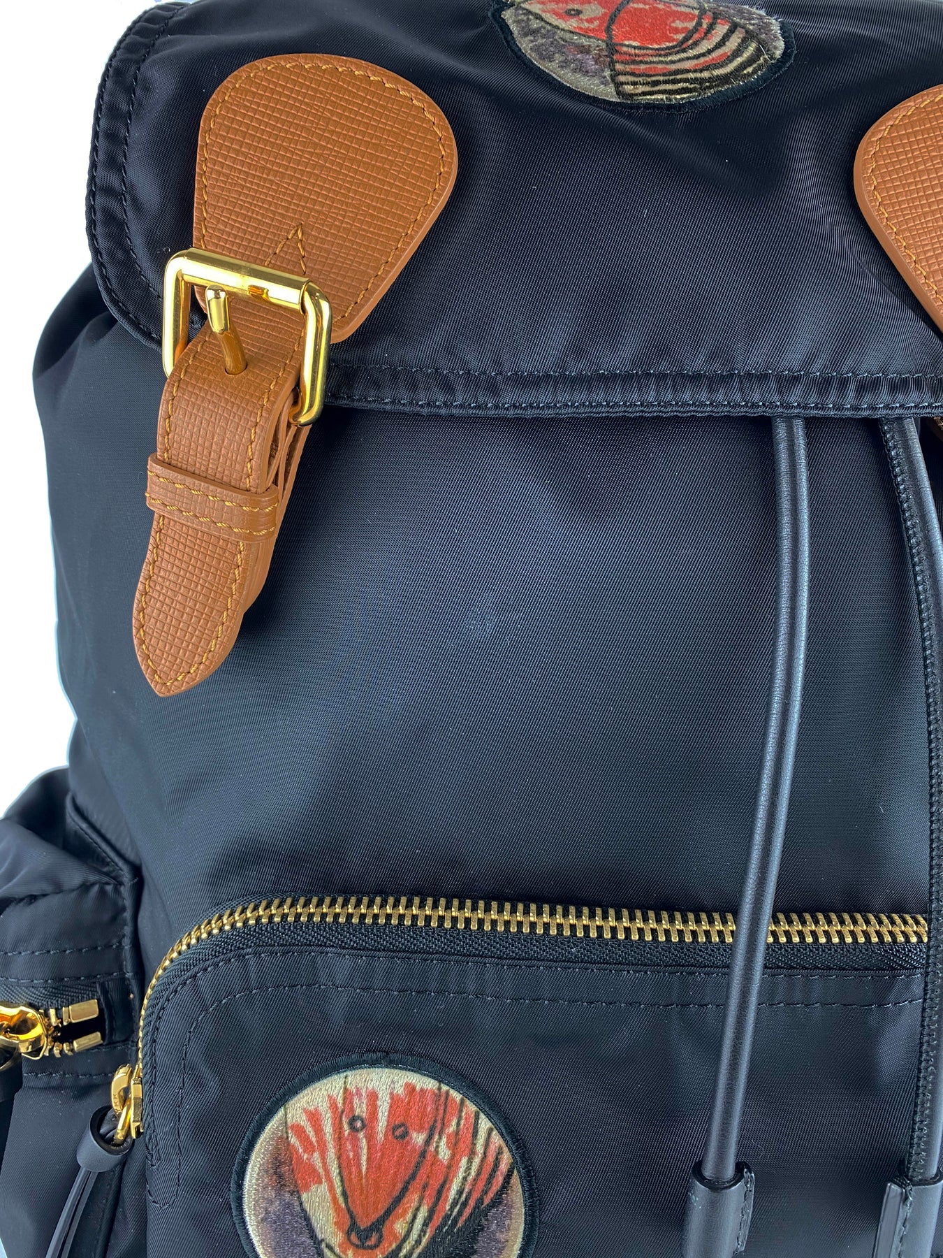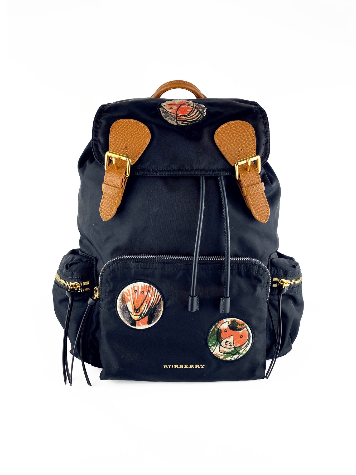 Description : Effortlessly cool and slick nylon backpack with appliqued patches. In excellent condition.